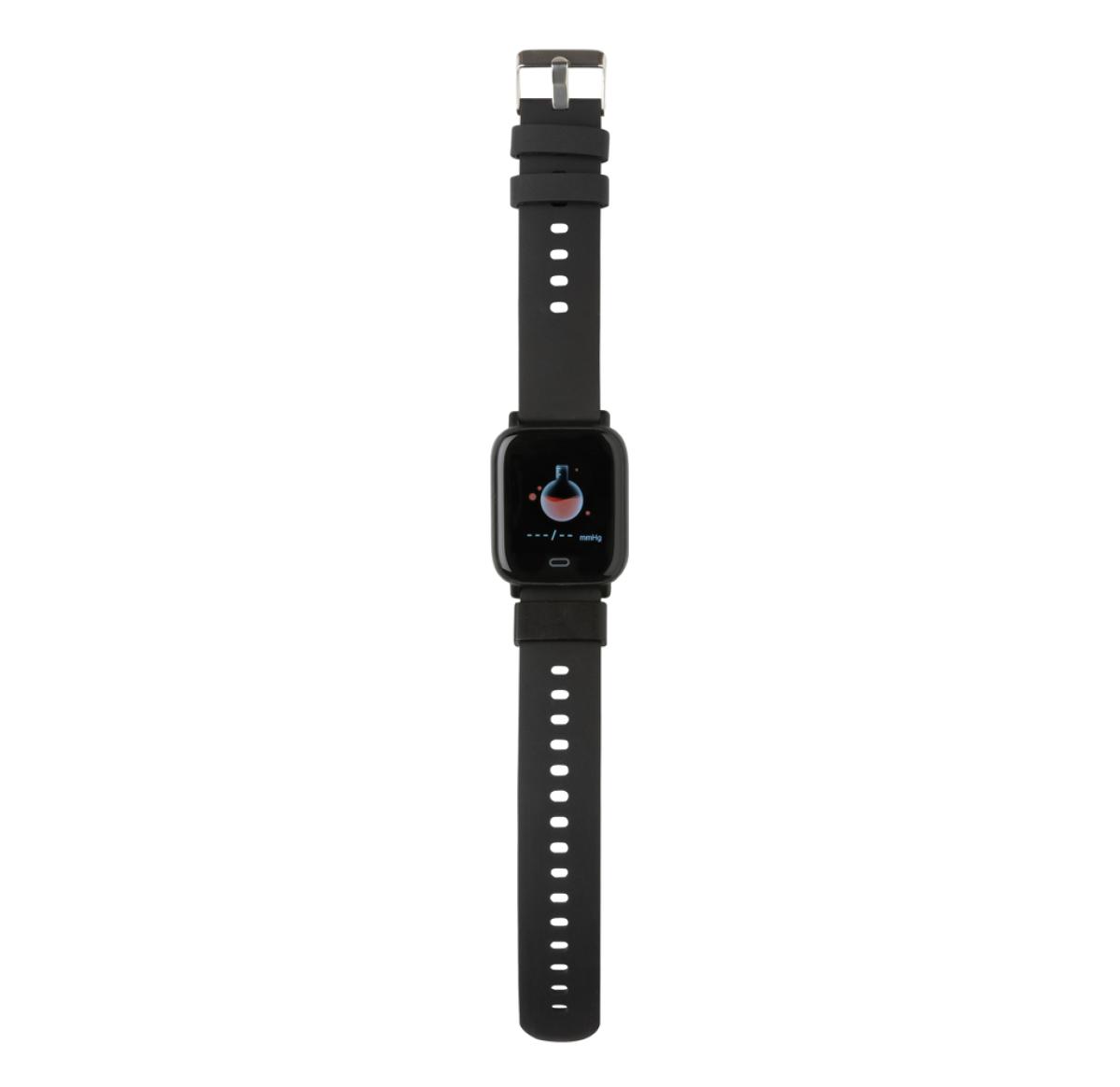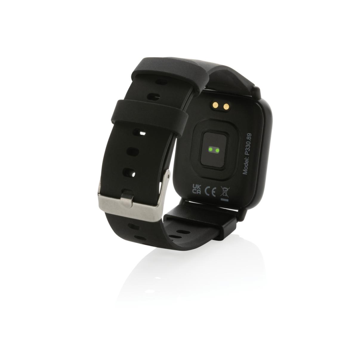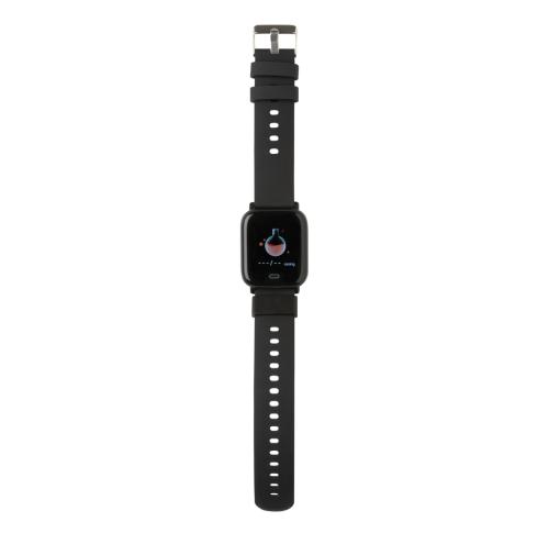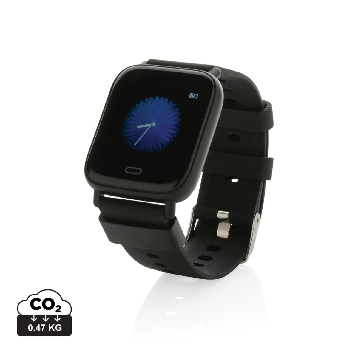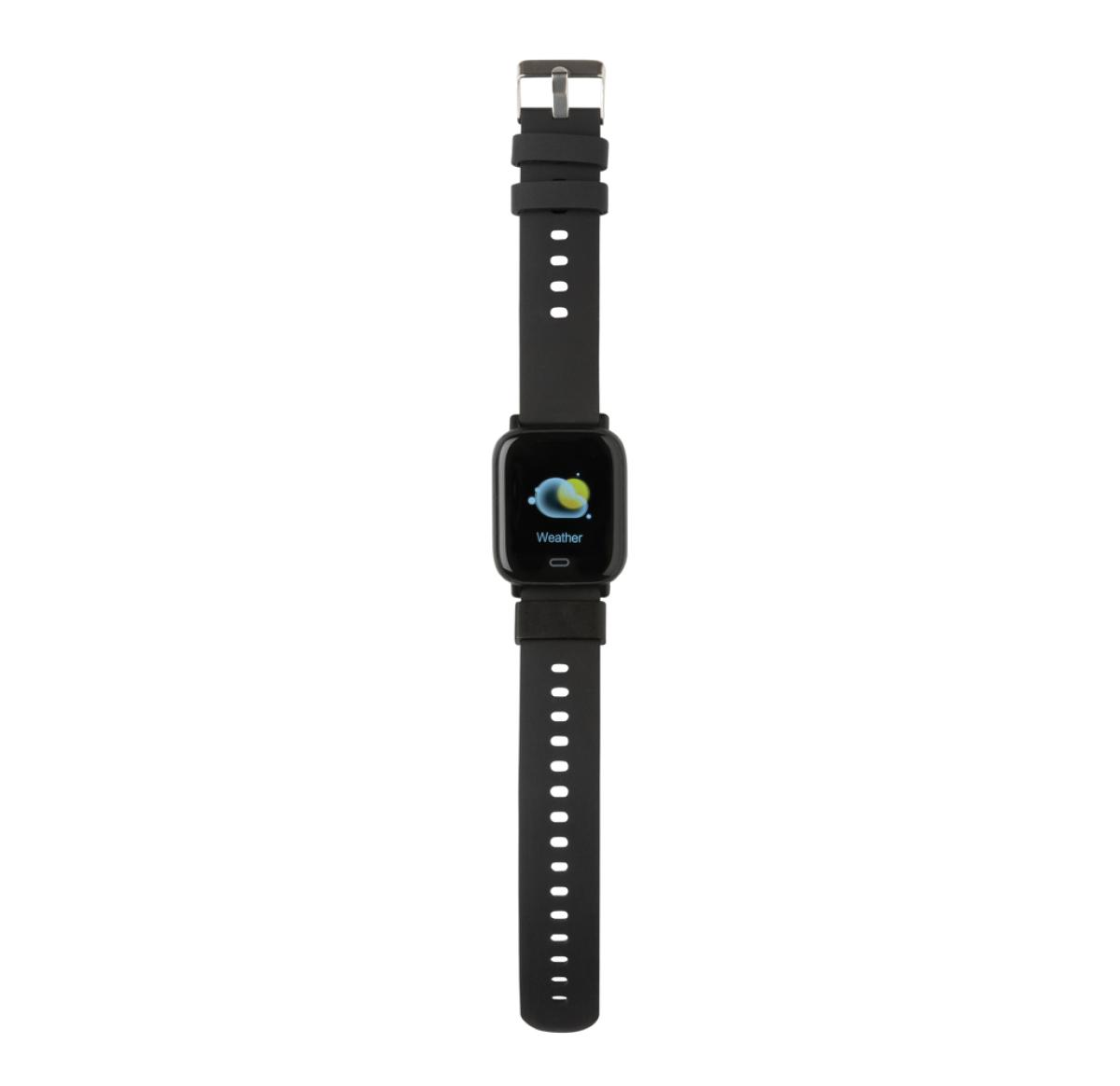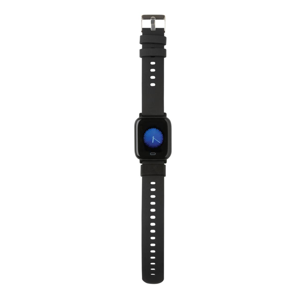 Modern lifestyle watch with 1.3?? point touch colour screen to track your activities all day long. Made with RCS (Recycled Claim Standard) certified recycled TPU armband and ABS frame. Total recycled content: 31% based on total item weight. RCS certification ensures a completely certified supply chain of the recycled materials. Features include: Step count, calories, distance, multi-sport tracking alarm clock, heart rate tracking, blood pressure monitoring, sleep monitor, calendar updates, make and receive calls, notifications: SMS, Facebook, Skype, WhatsApp, Twitter etc. Compatible with Android 4.4 and IOS 8.0 and above. IPX 67 water resistant and dustproof. BT 5.0. Standby time of 15 days and working time up to 5 days. Including clip charger to charge the watch. Packed in FSC?? mix kraft packaging. Item and accessories 100% PVC free.