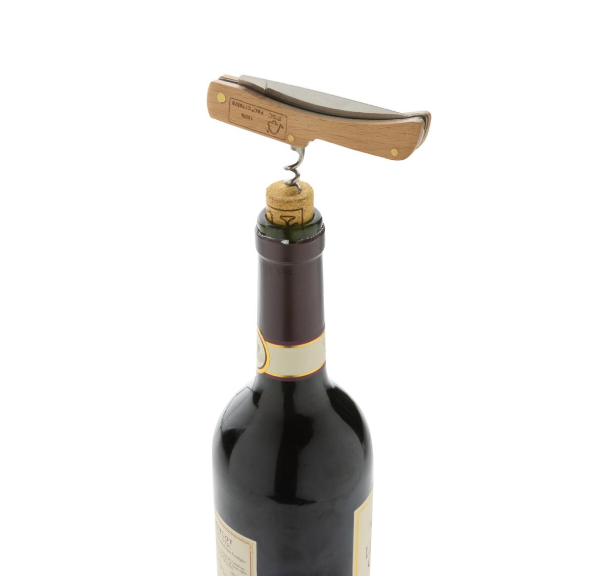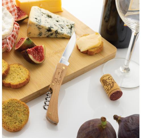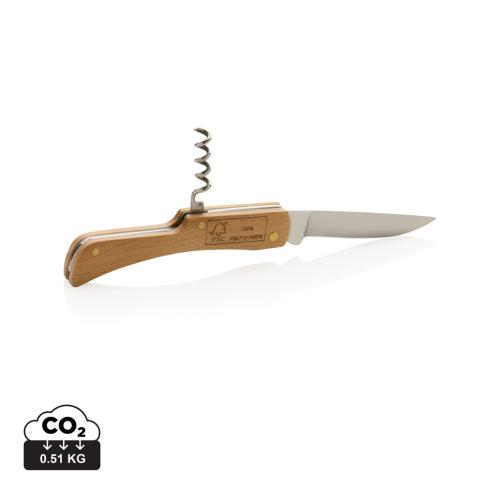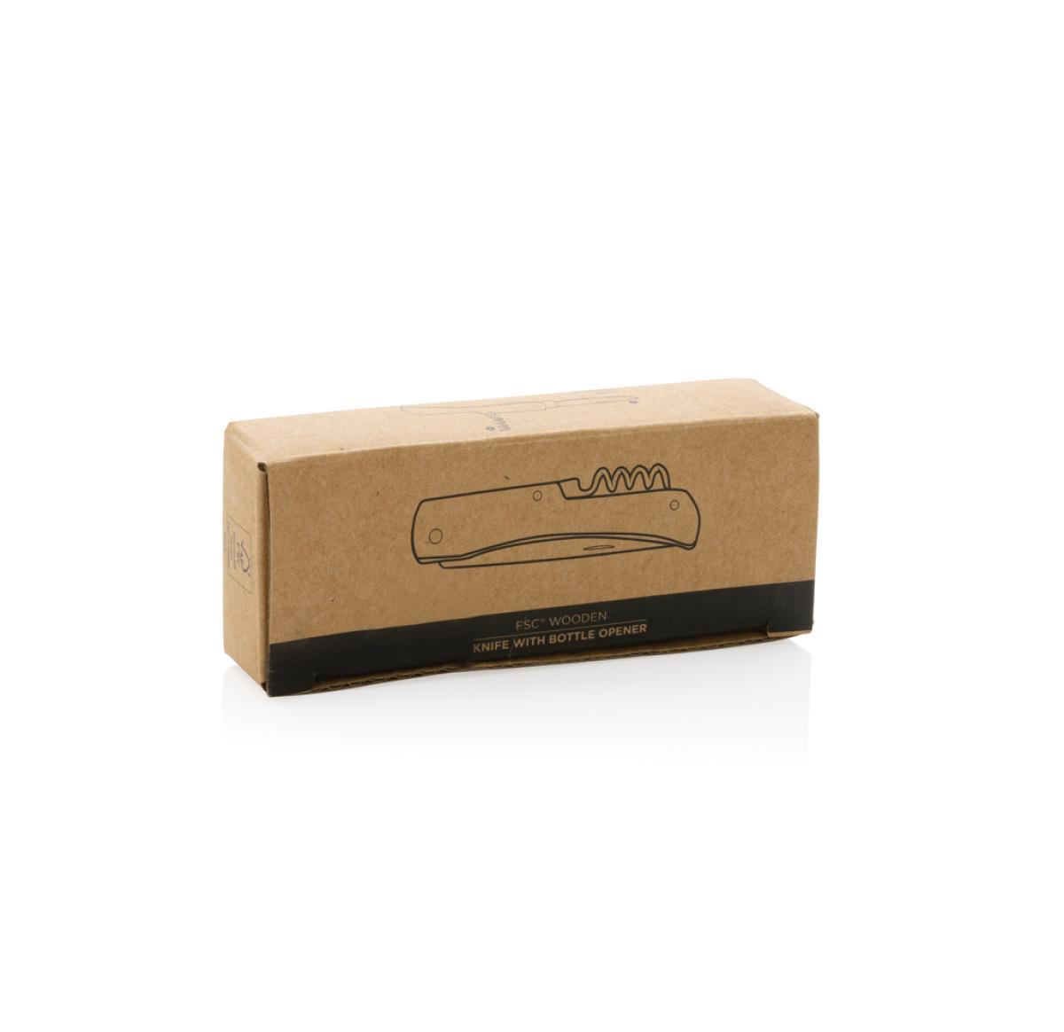 Foldable knife made with FSC 100% beech wood and high quality stainless steel (420) blade. On the reverse, there is a strong bottle opener. Rockwell hardness 42-52. Blade is food safe. Packed in FSC mix kraft box