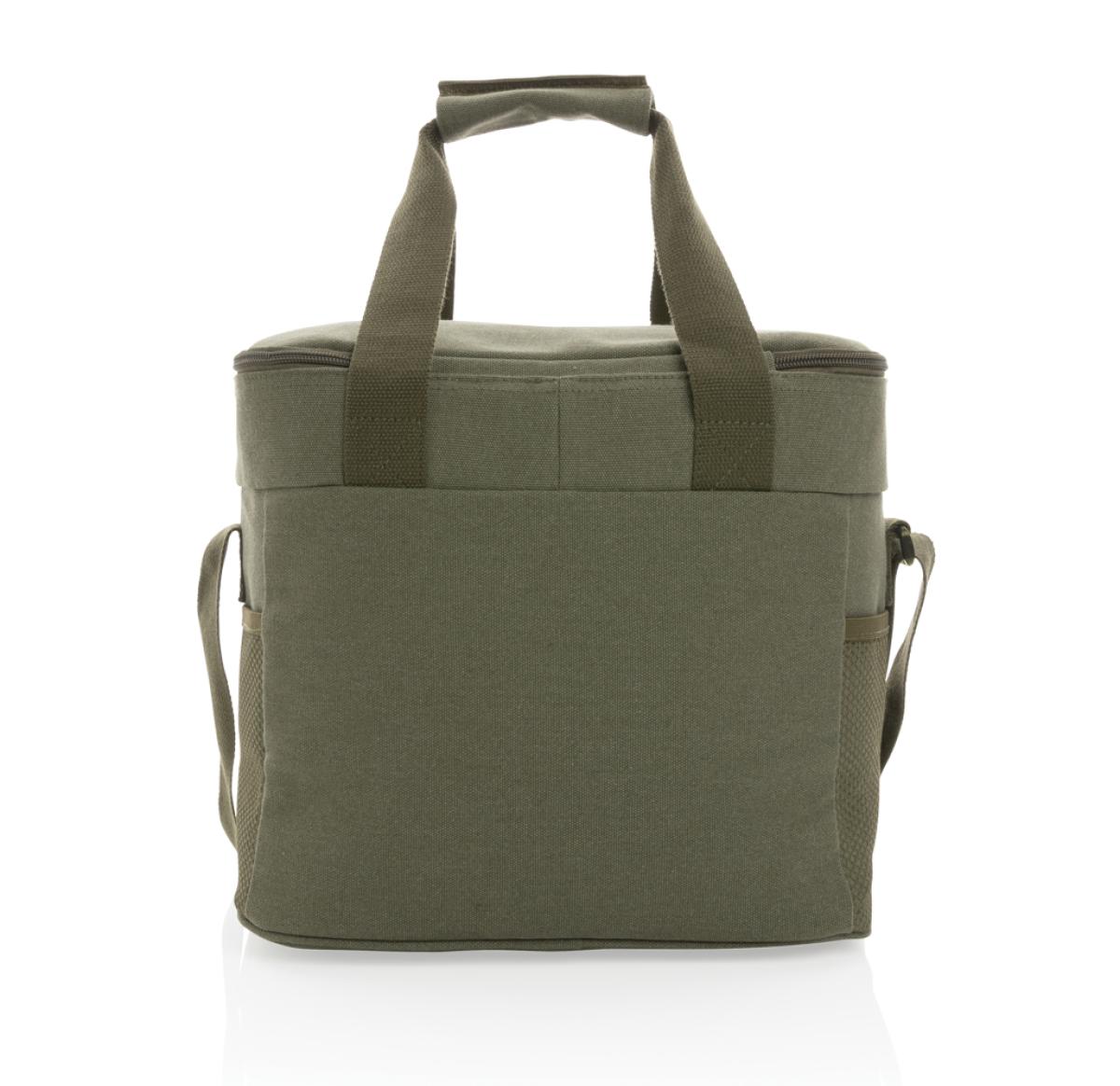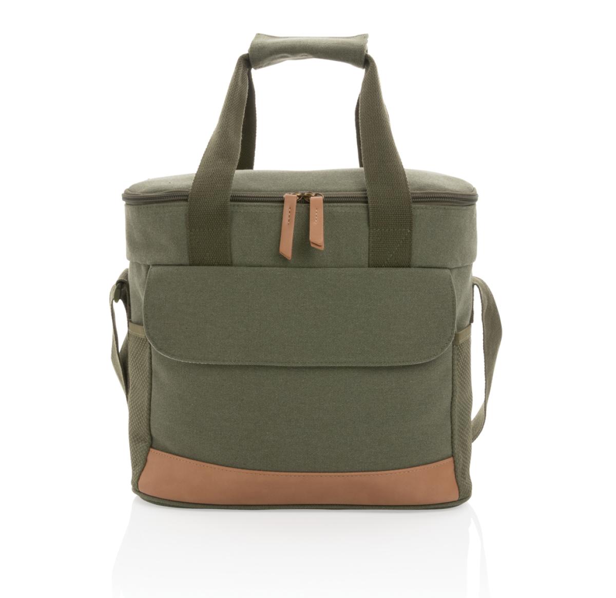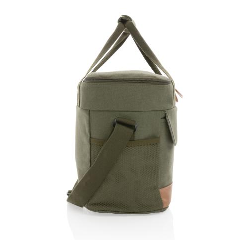 Pack your favourite food or beverages in this chic cooler bag! This beautiful 16oz. recycled canvas large cooler bag can store up to 20 cans. With 2 mesh side pockets and 1 front pocket for extra storage. Finished with beautiful PU details. Incoporating the AWARE?? tracer that validates the genuine use of recycled canvas. Each cooler bag saves 1667.4 litres of water. 2% of proceeds of each Impact product sold will be donated to Water.org. Composition 60% recycled cotton and 40% recycled polyester. Lining in PEVA.