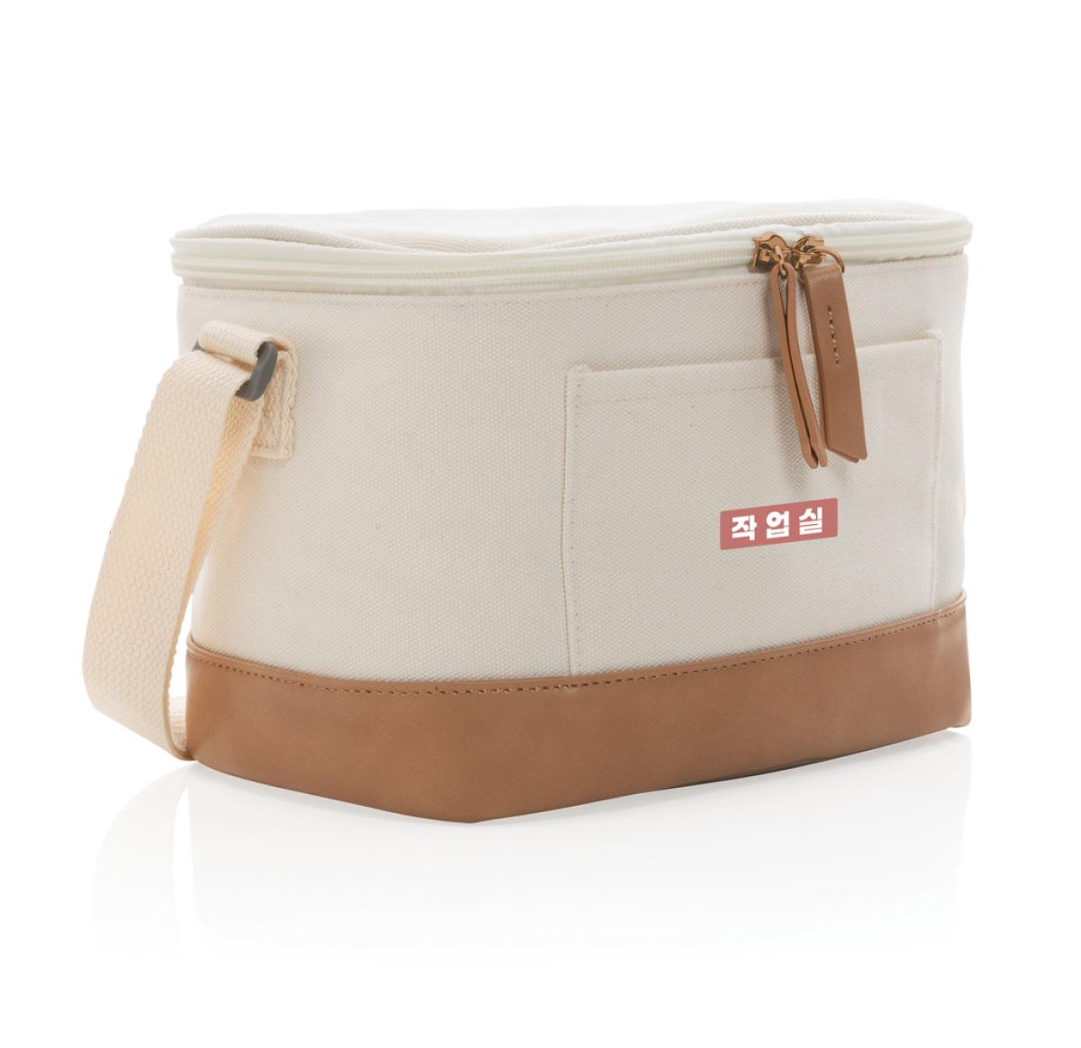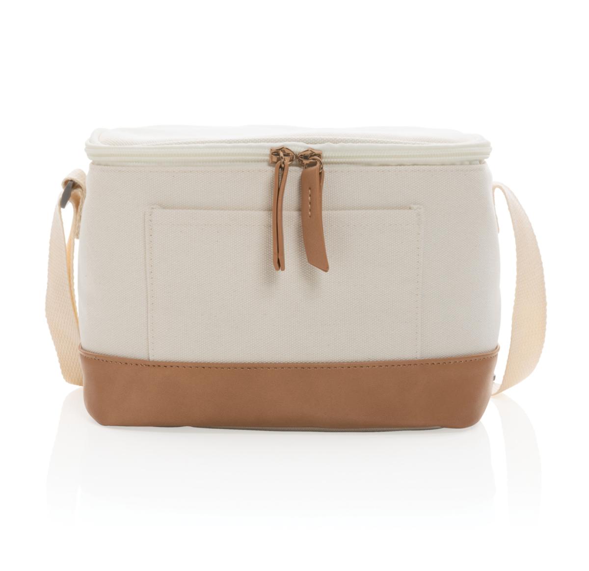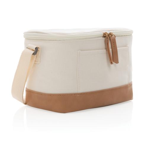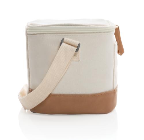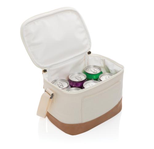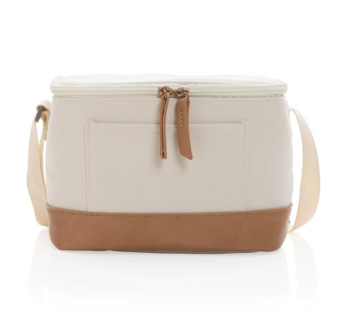 Pack your favourite food or beverages in this chic cooler bag! The cooler bag will easily fit 6 cans and features an open front pocket and handle for easy carrying. Made with high quality 16oz. recycled canvas and beautiful PU details. With AWARE?? tracer that validates the genuine use of recycled cotton. Each cooler bag saves 506.2 litres of water. 2% of proceeds of each Impact product sold will be donated to Water.org. Composition 60% recycled cotton and 40% recycled polyester. Lining in PEVA.