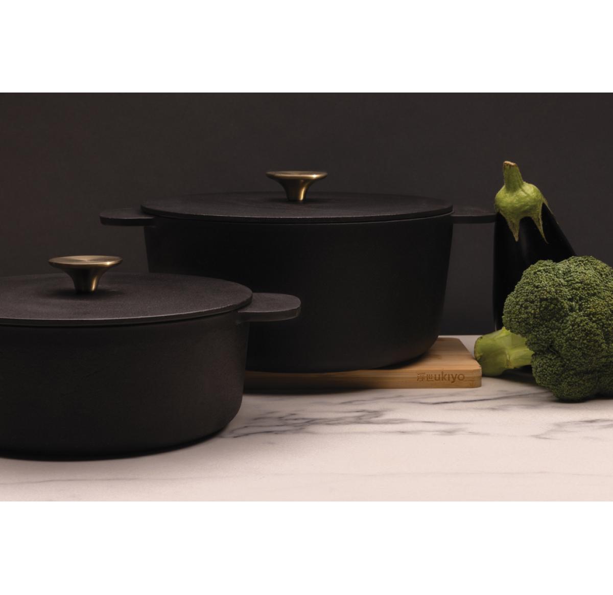 The Ukiyo enameled cast-iron pan is a true culinary powerhouse. Perfectly designed for stews, roasts and soups! This is the only pan you need for great meals. The cast iron construction retains heat, allowing food to bake and brown evenly. Your culinary creations will also stay warm longer at the table. Suitable for the oven, hob, induction or under the grill. Capacity 5.2 litre. Diameter 26cm. Packed in FSC?? certified kraft box.