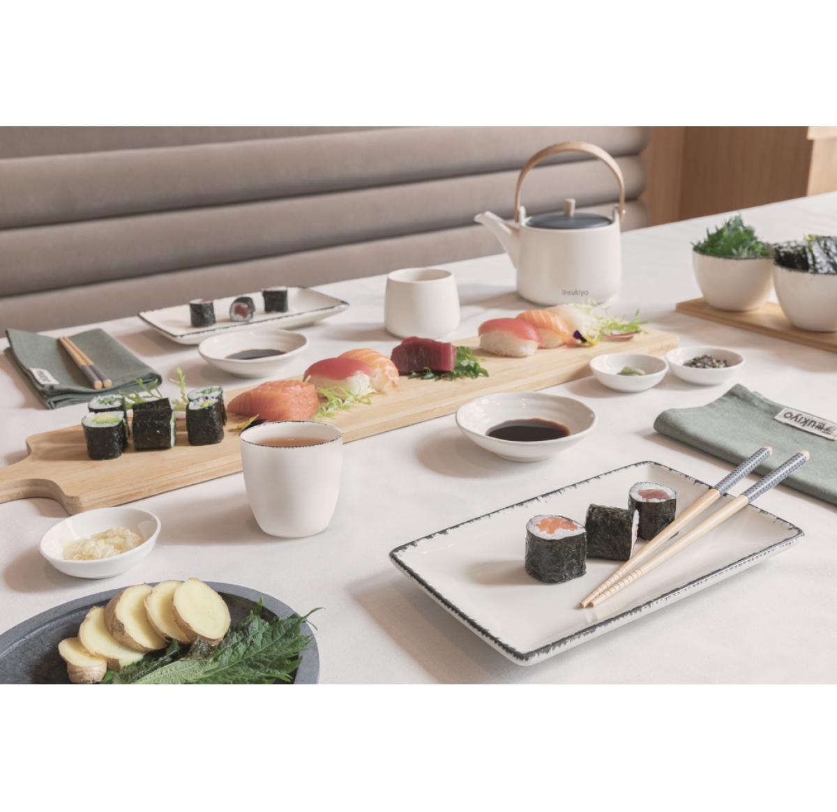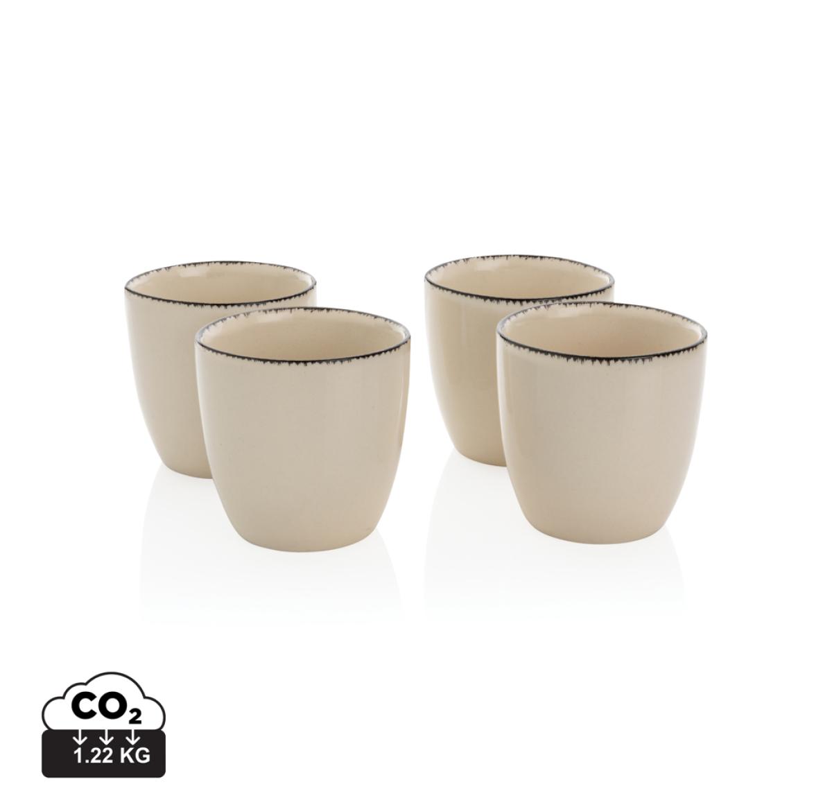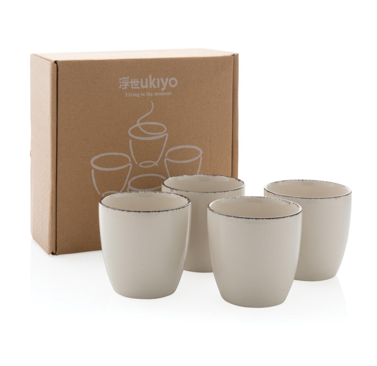 Add simple elegance to any meal with this Ukiyo 4 pc ceramic drinkware set. Perfect for casual dining. Clean white design with black-detailed rim. Presented in a kraft gift box. Capacity 120ml.