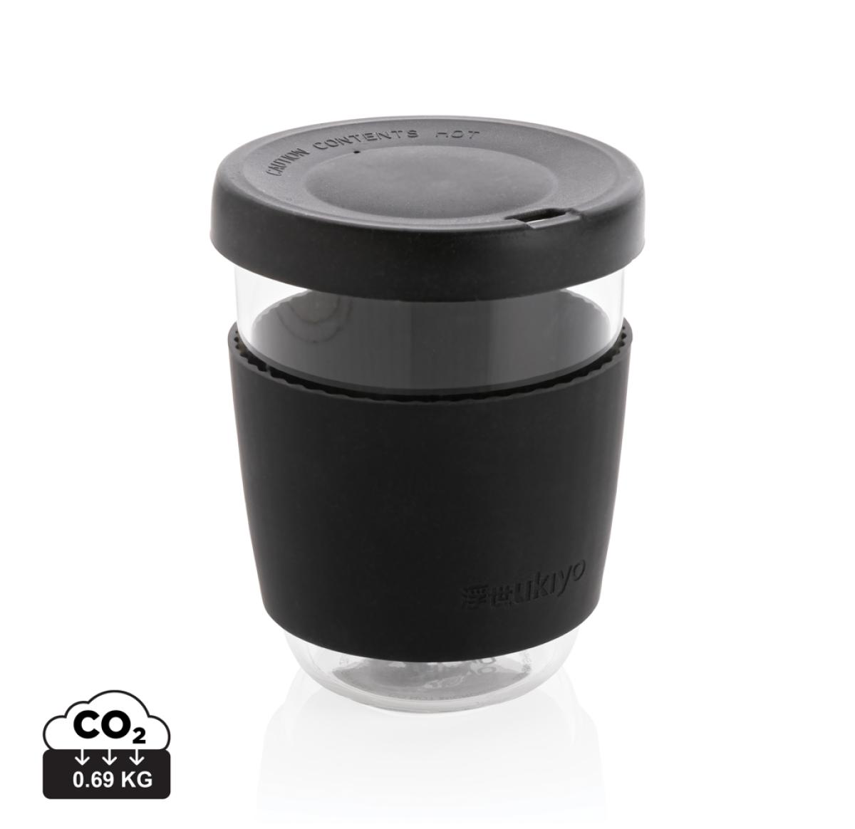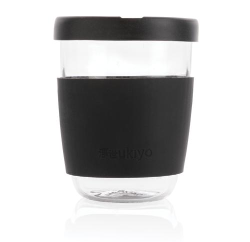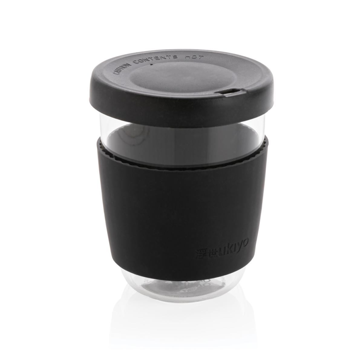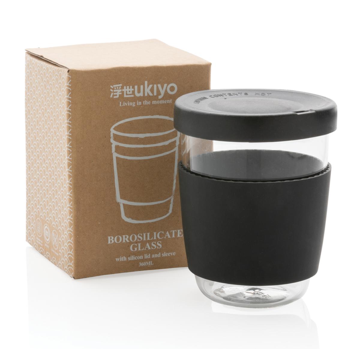 Branded Glass Coffee Mugs 360ml With Silicone Lid And Sleeve Black Ukiyo Borosilicate