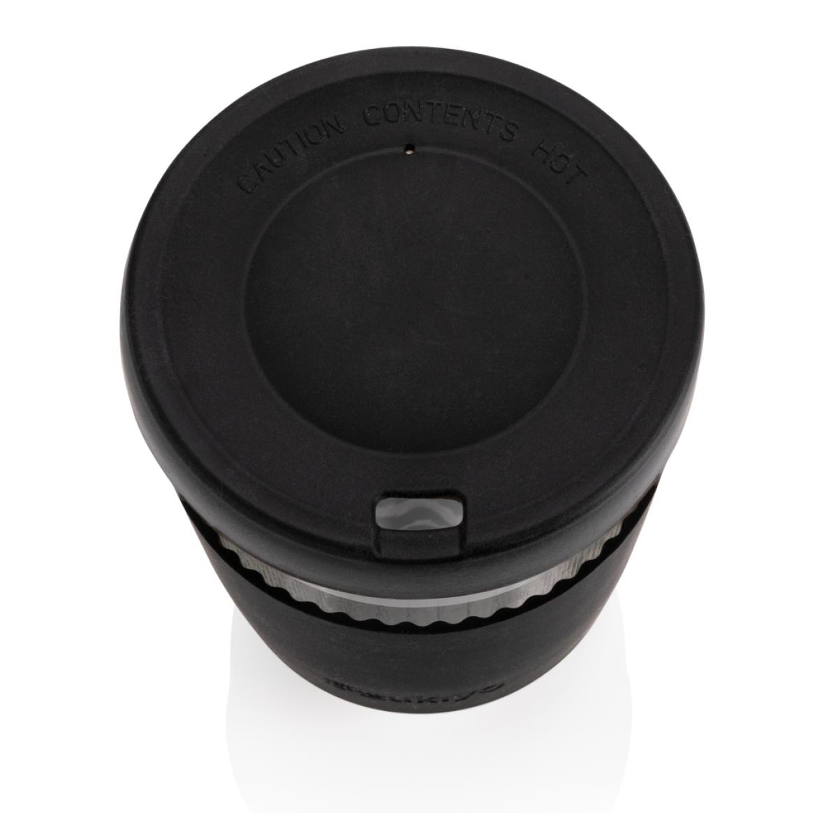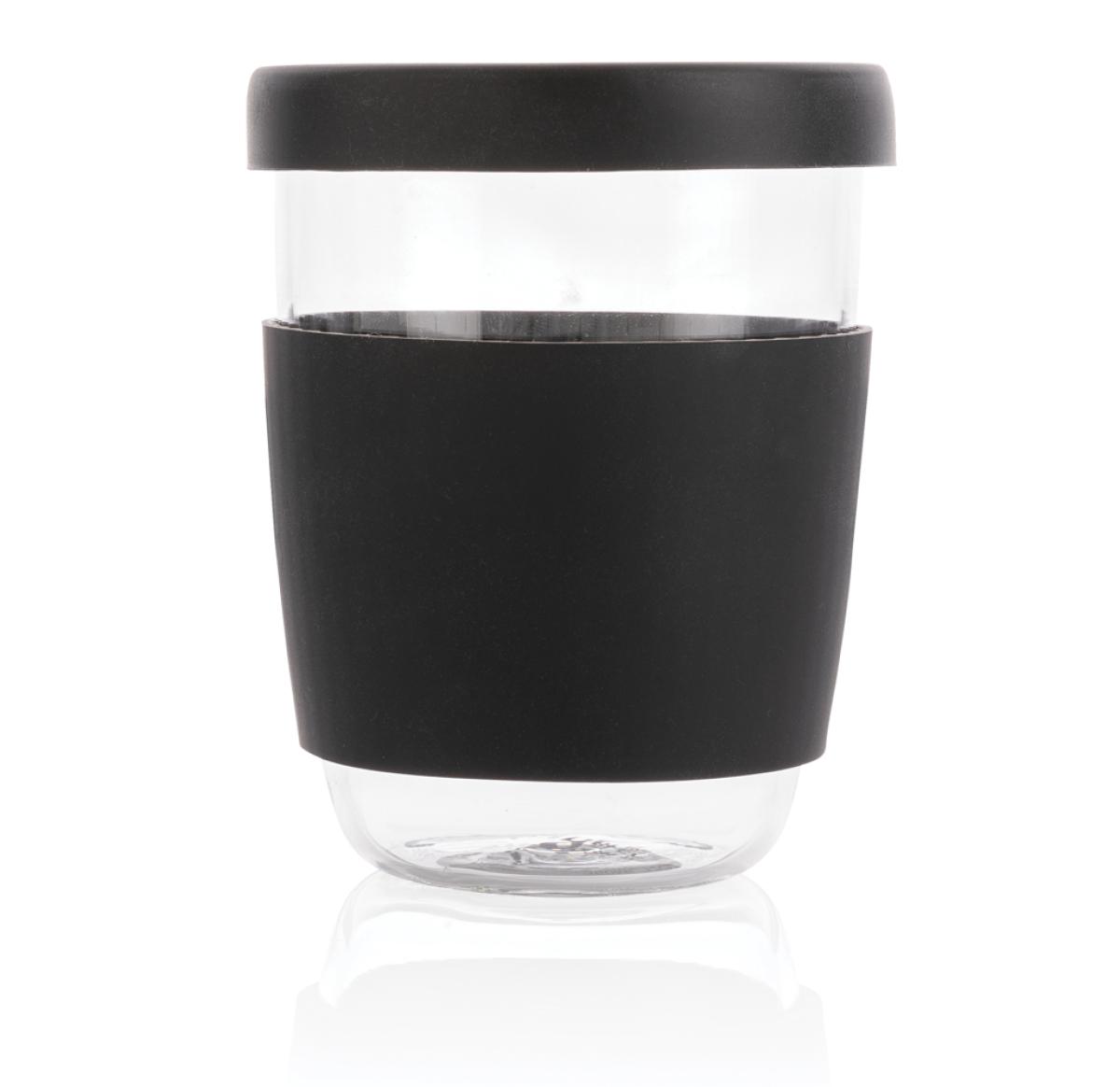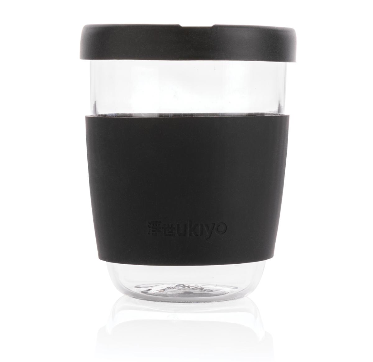 Branded Glass Coffee Mugs 360ml With Silicone Lid And Sleeve Black Ukiyo Borosilicate