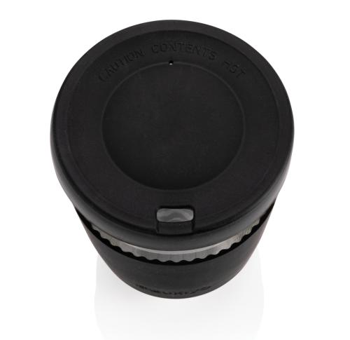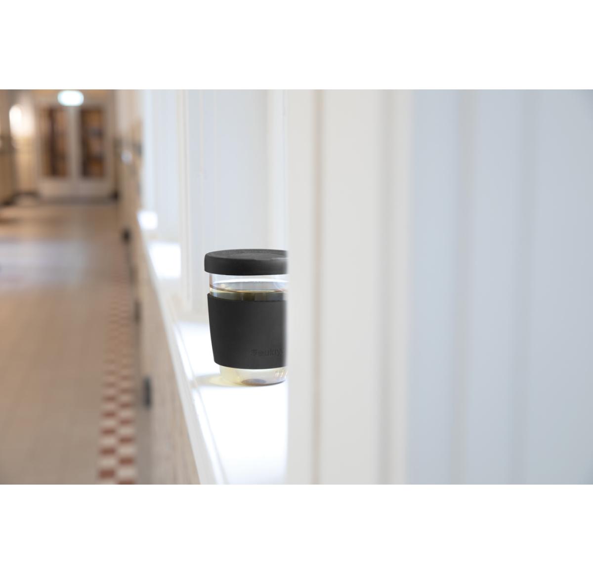 Enjoy your coffee at work or at home in this Ukiyo borosilicate glass with silicone lid and sleeve. The cup has a nice grip and a slim shape. A small vent in the lid allows steam to escape to prevent pressure build-up. BPA free. Capacity 360ml.