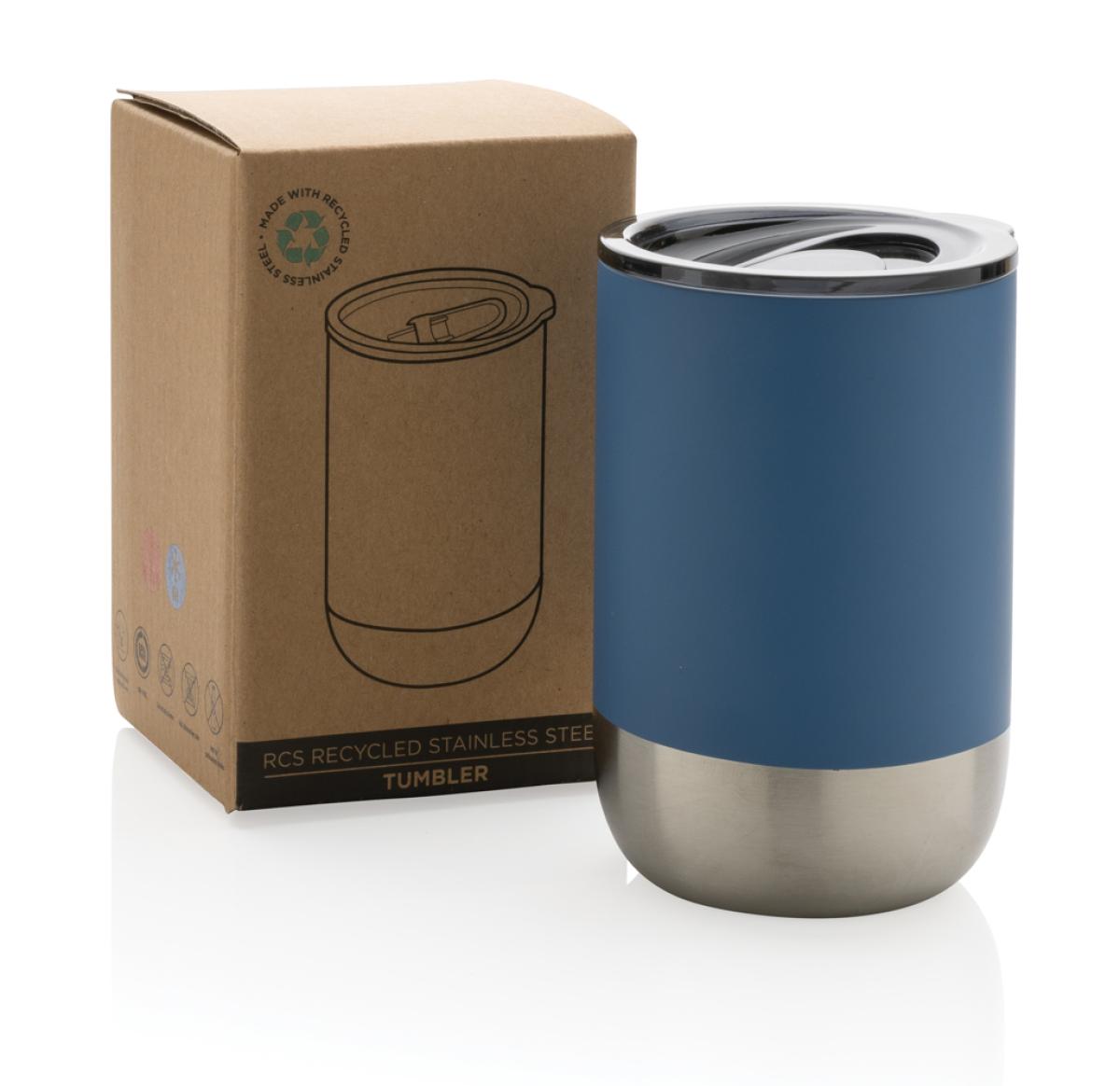 This beautiful tumbler features a recycled stainless steel construction with vacuum insulation to keep drinks warm for up to 3 hours or cold for up to 6 hours. Its trendy execution with stainless steel bottom accent makes it a true eye catcher. The lid with slide open function ensures a spill proof drinking experience. Made with RCS (Recycled Claim Standard) certified recycled materials. RCS certification ensures a completely certified supply chain of the recycled materials. Total recycled content: 76% based on total item weight. BPA free. Capacity 360ml. Including FSC??-certified kraft packaging.