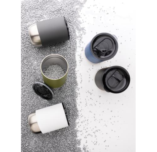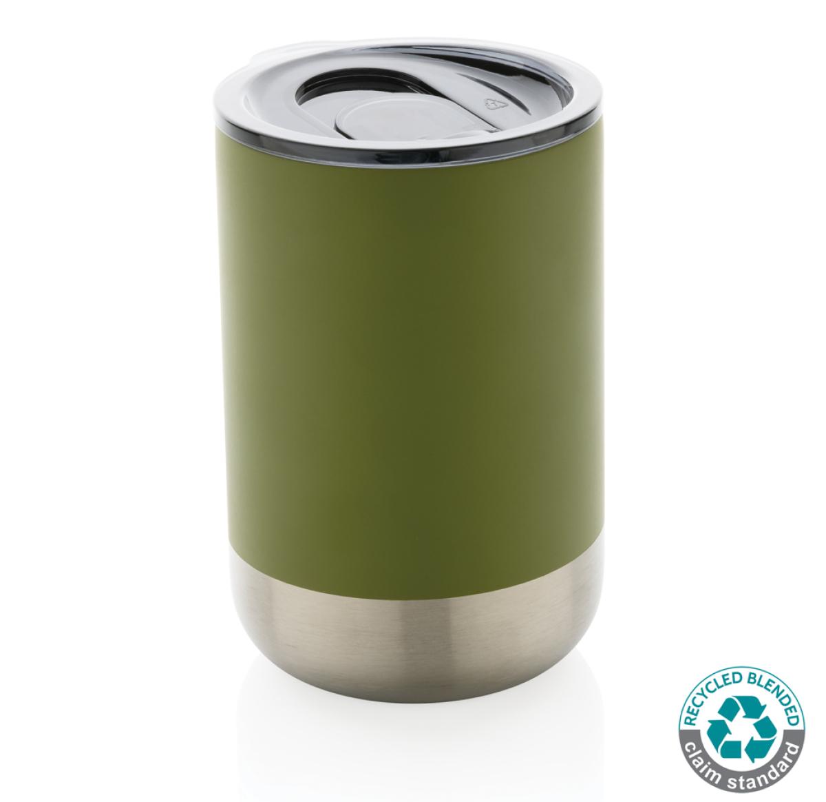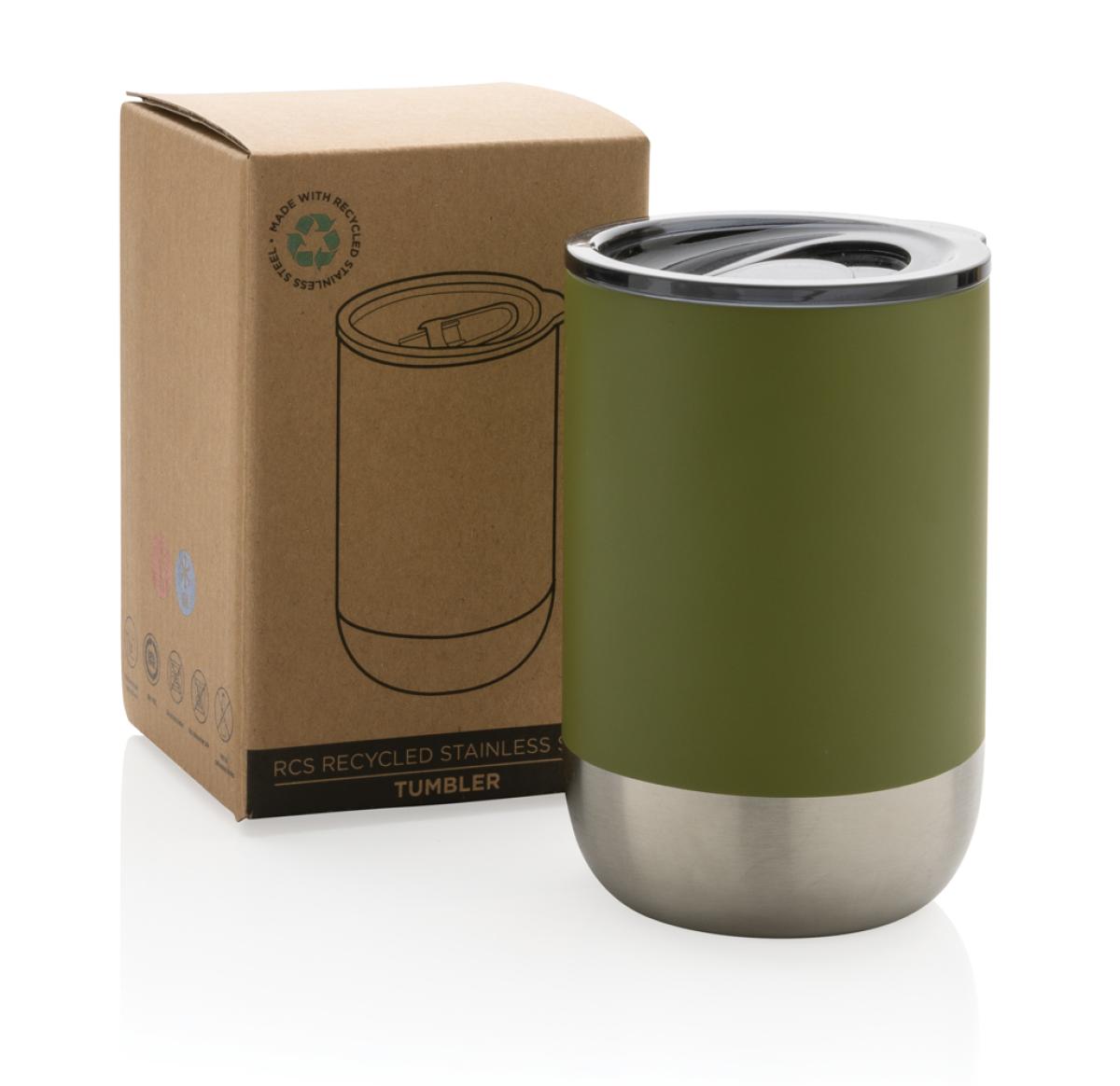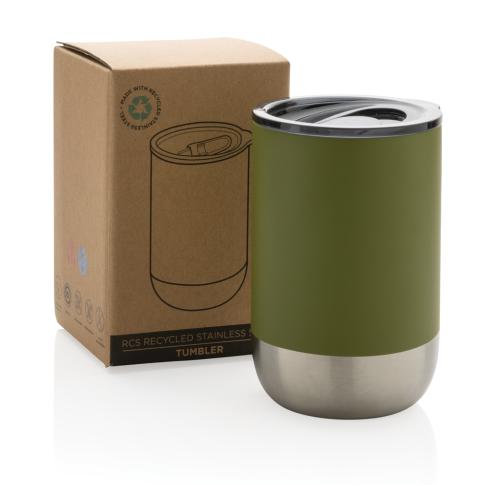 This beautiful tumbler features a recycled stainless steel construction with vacuum insulation to keep drinks warm for up to 3 hours or cold for up to 6 hours. Its trendy execution with stainless steel bottom accent makes it a true eye catcher. The lid with slide open function ensures a spill proof drinking experience. Made with RCS (Recycled Claim Standard) certified recycled materials. RCS certification ensures a completely certified supply chain of the recycled materials. Total recycled content: 76% based on total item weight. BPA free. Capacity 360ml. Including FSC??-certified kraft packaging.