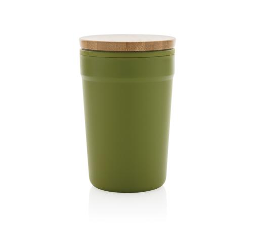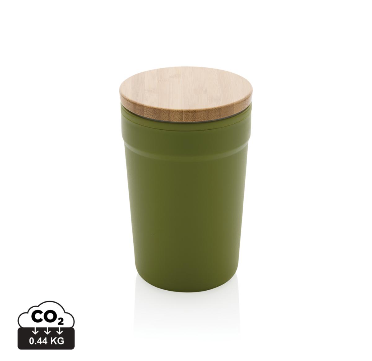 This beautiful tumbler with bamboo lid is made with GRS certified recycled PP. GRS certification ensures a completely certified supply chain of the recycled materials. The tumbler features a bamboo lid for on the go usage. Total recycled content: 52% based on total item weight. The body is microwave and dishwasher safe. BPA free. Capacity 300ml. An FSC??-certified kraft box is included.