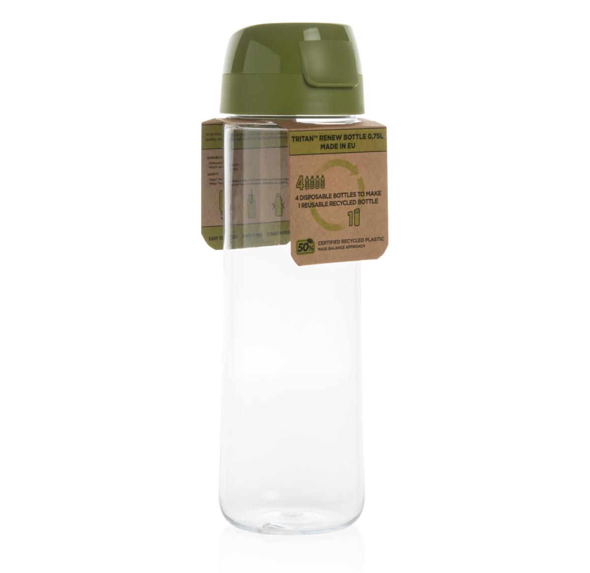 Made in Italy 0,75L water bottle with 1 hand opening. Made with Tritan?? Renew ?? an innovative plastic that utilises as much as 50% recycled material in place of fossil-based resources. Clear, clean and sustainable without any compromise on performance and durability. Recycled material verified by using ISCC Mass Balance Approach. Tritan Renew is powered by a unique process that breaks down waste plastic back into its basic chemical building blocks, allowing plastic materials to be recycled time and time again. This may cause minor imperfections on the product body but adds to its recycled character. Spill proof lid.
