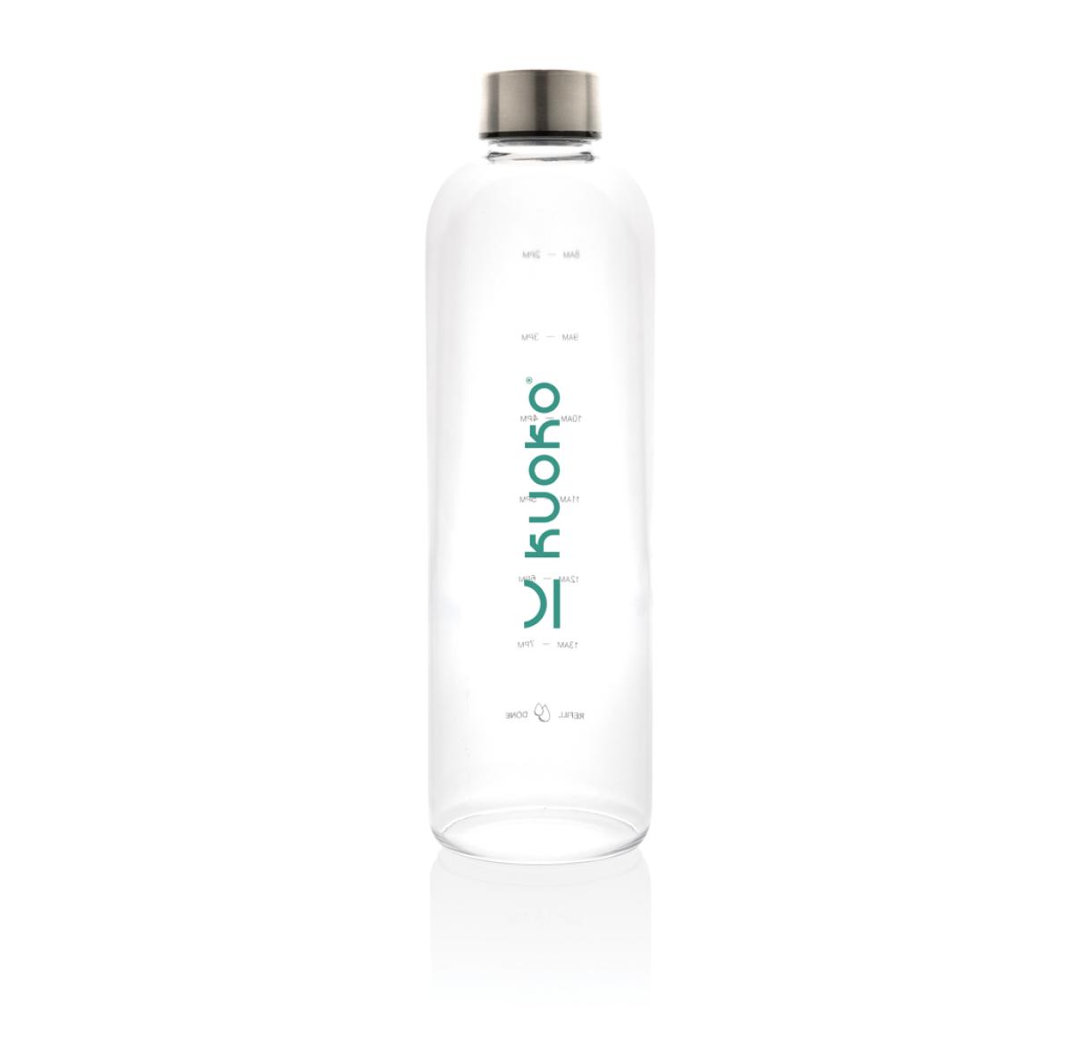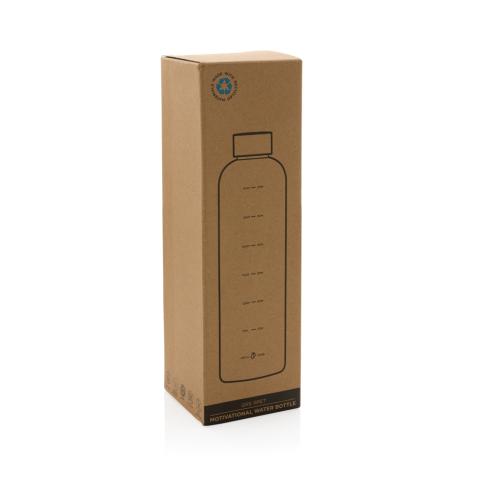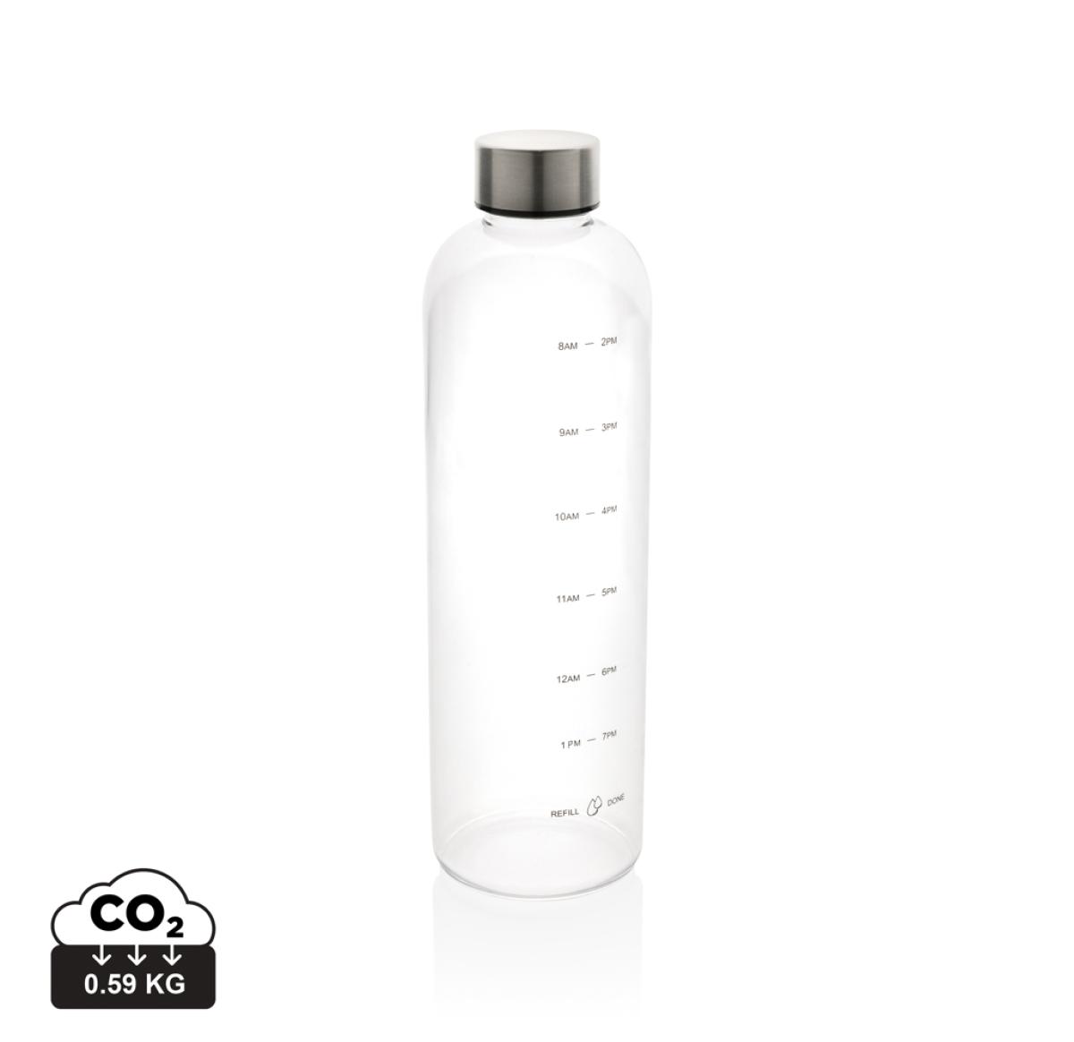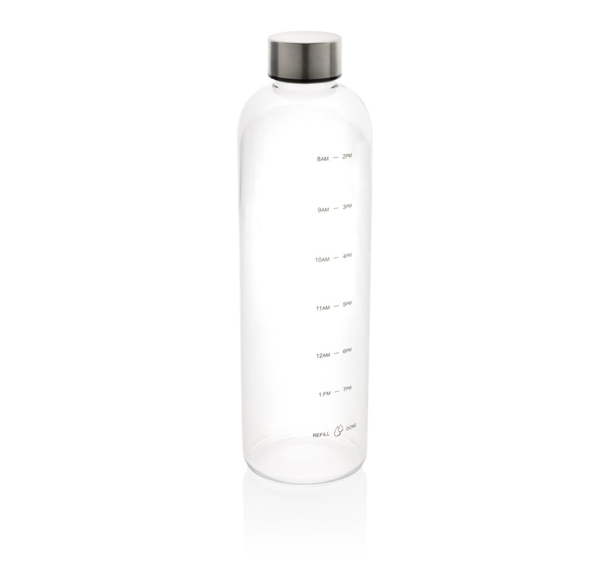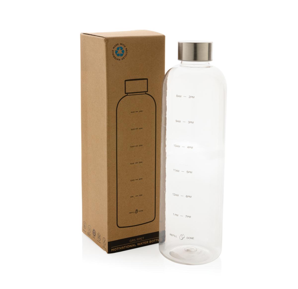 This large water bottle will make sure that you will reach your daily hydration goals! The sleek looking bottle features a time line. In a quick glance the timeline will tell you when to take your next sip throughout the day. No more guesswork, your daily water intake will be like clockwork! The body of the bottle is made from 100% GRS certified RPET. GRS certification ensures a completely certified supply chain of the recycled materials. Hand wash only. This product is for cold drinks only. Total recycled content: 85% based on total item weight. BPA free. Capacity 1000ml.