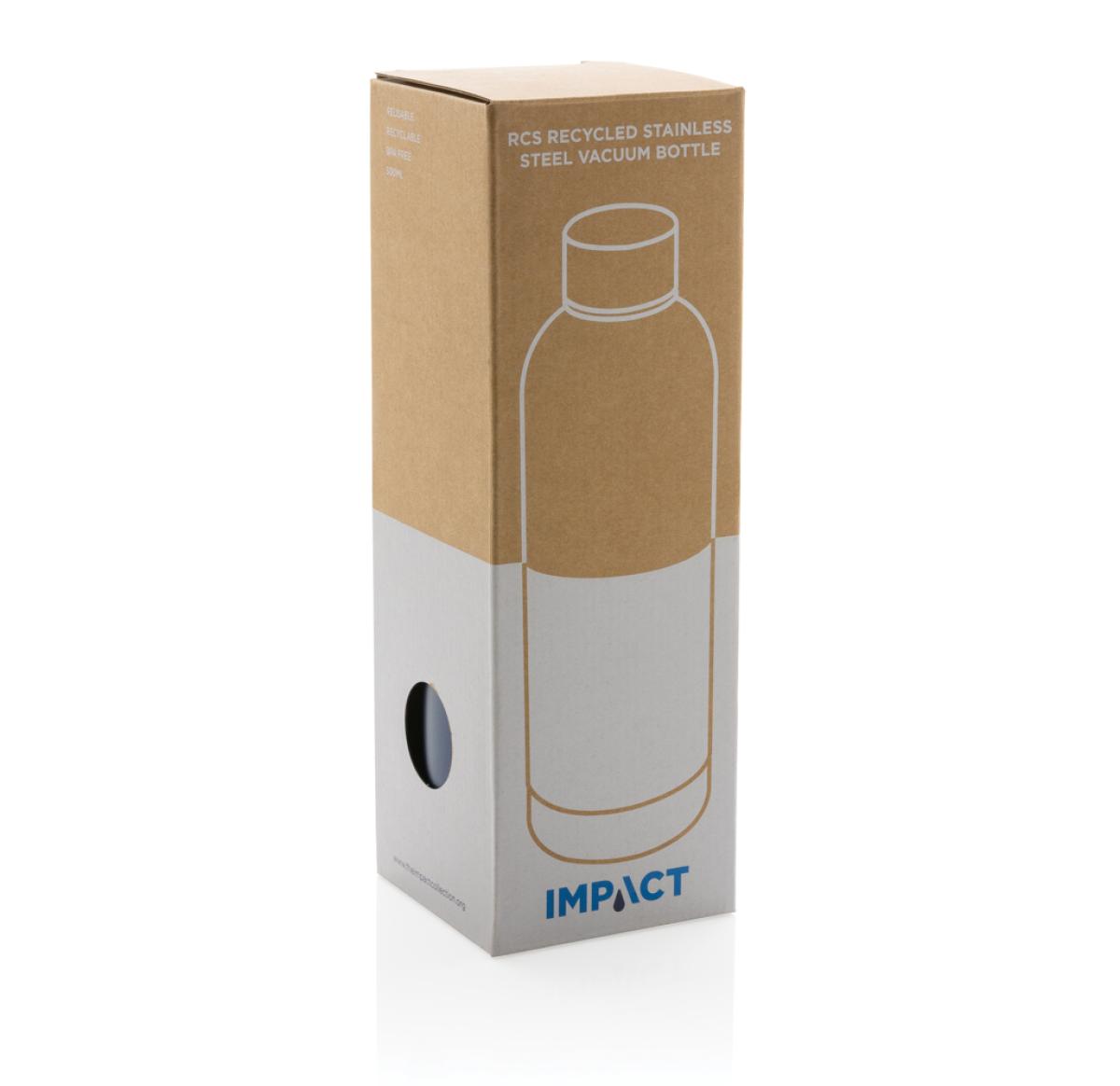 Perfect for all-day hydration, the Impact RCS stainless steel double wall vacuum bottle keeps you refreshed throughout the day. Made of durable recycled stainless steel. Featuring a minimalistic but stylish design, you will make an impact anywhere! Keeps your drink warm for up to 5 hours or cold for up to 15 hours. Made with RCS (Recycled Claim Standard) certified recycled materials. RCS certification ensures a completely certified supply chain of the recycled materials. Total recycled content: 80% based on total item weight. BPA free. Capacity 500ml. Including FSC??-certified kraft packaging.