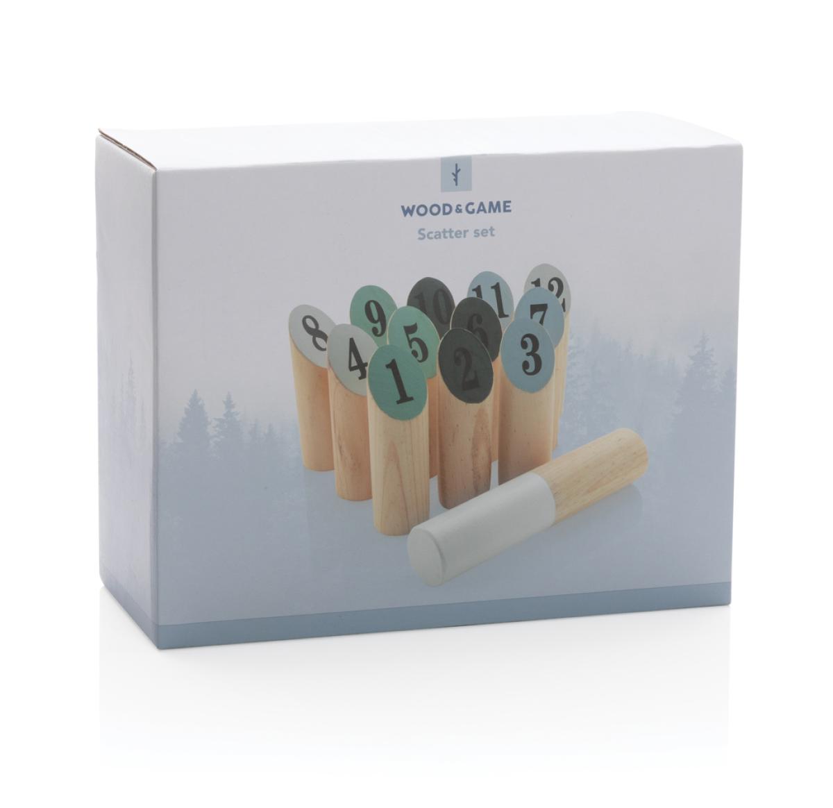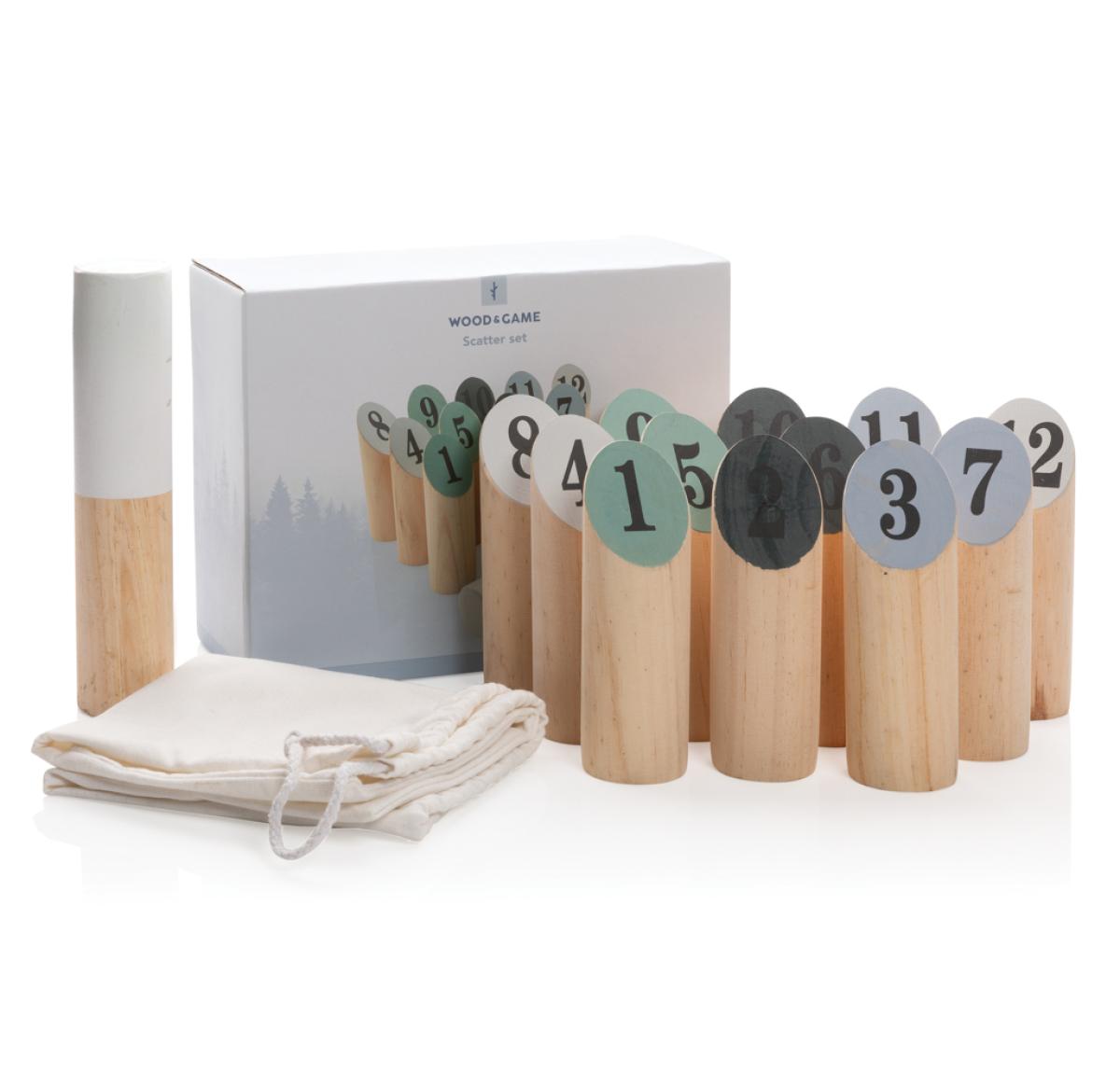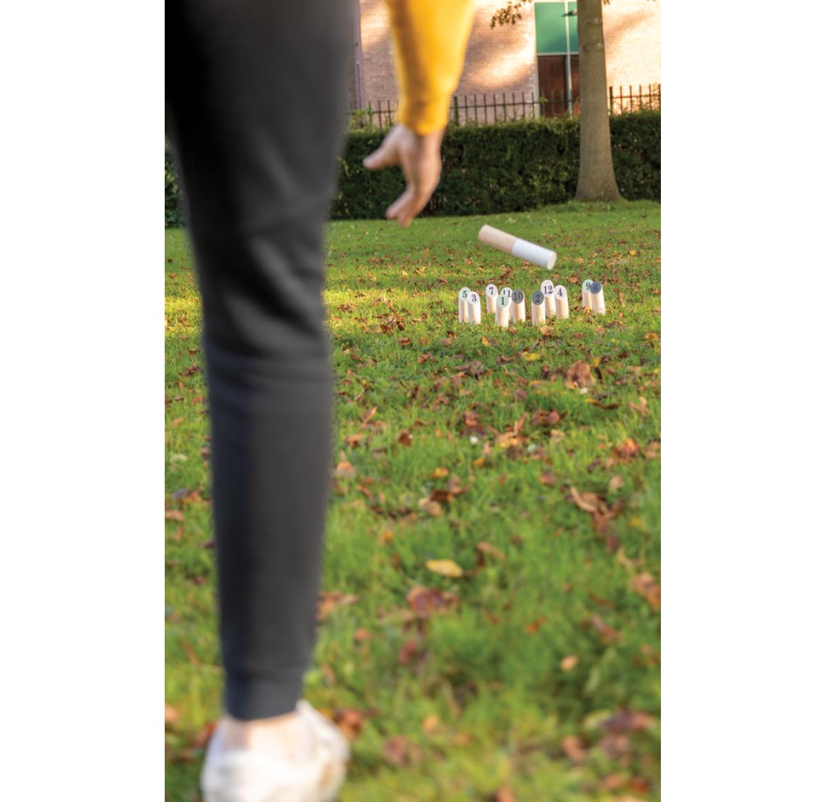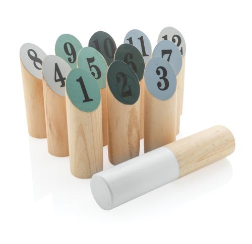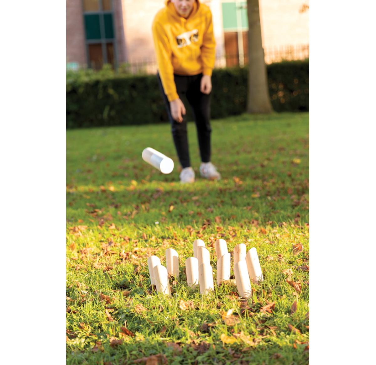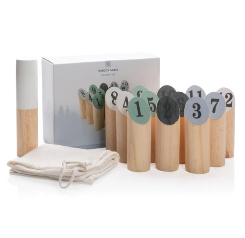 This addictive tactical game challenges players to throw underhand the wooden cylinder at the 12 wooden pins. The first player to reach exactly 50 points wins. It is not allowed to exceed 50. It might look easy but it is highly challenging! After each throw the pins are placed back upright. The set includes: 12 x numbered pins and 1 wooden throwing cylinder all made from strong Pine wood. Presented in a cotton pouch with rule book.