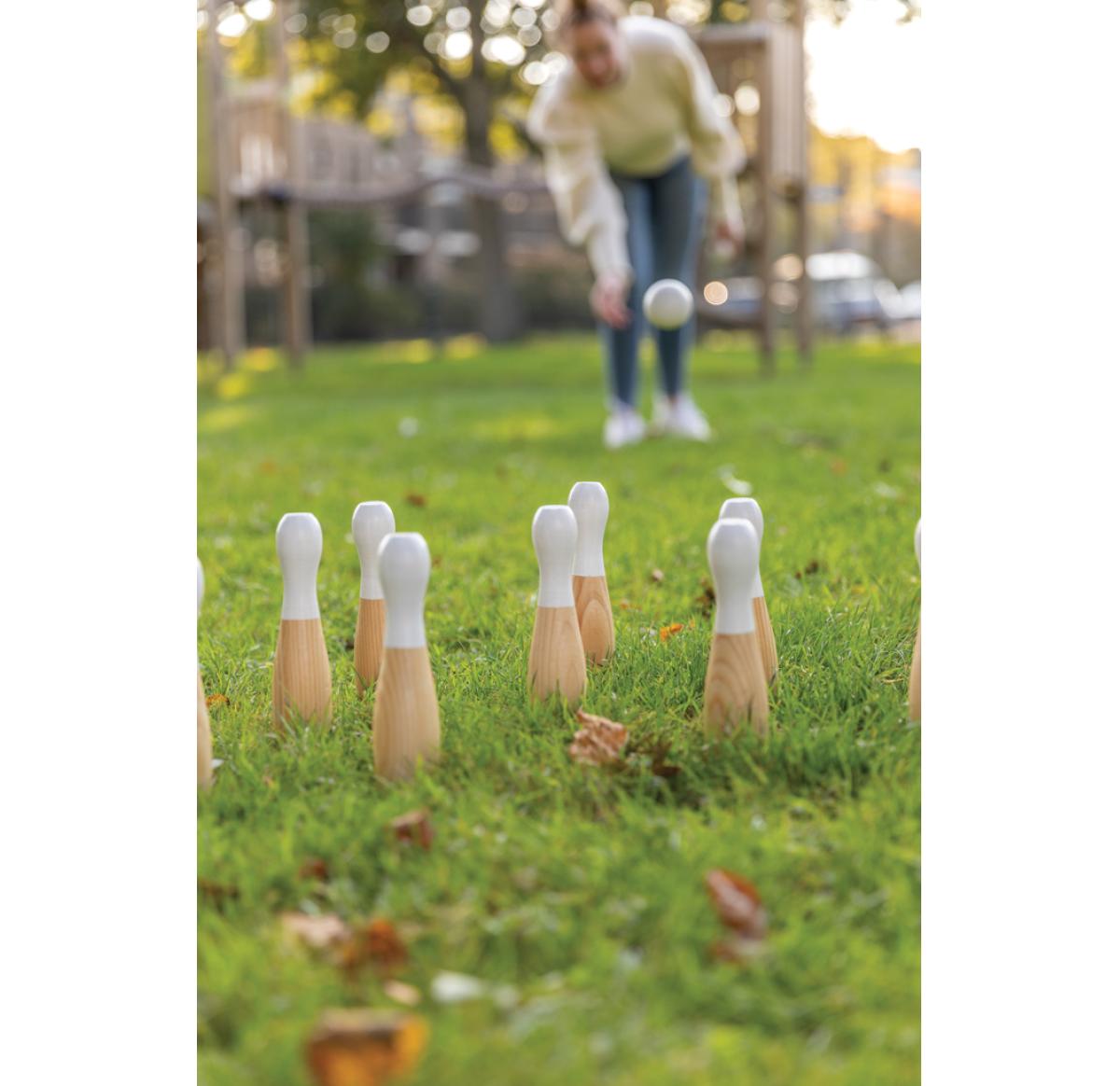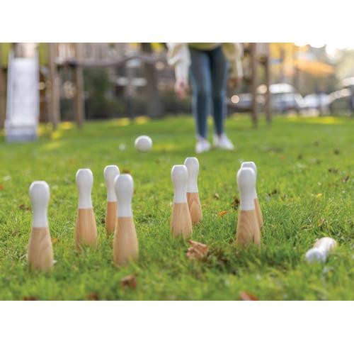 Get ready to aim with this beautiful crafted skittles set made from pine wood. Skittles is fun for both adults and children. Play at home with family, in a park or challenge the guest of your party. Easy set up- just set up the pins, set a throwing point and you are ready to go. The set includes 9 pins and three balls. Presented in a cotton pouch with rule book.