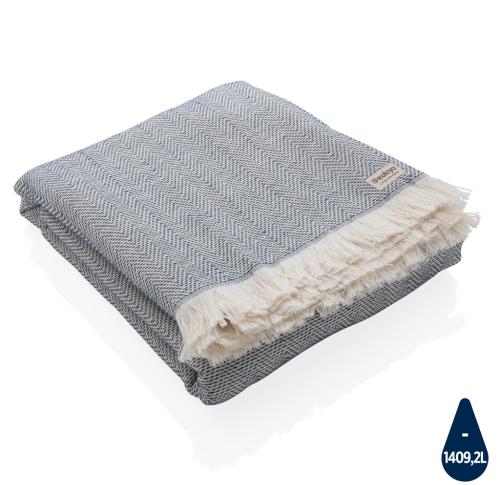 Our most luxurious and versatile towel. The perfect travel companion in any circumstance. This towel contains 12% recycled cotton and is super soft and silky to the touch. With AWARE?? tracer that validates the genuine use of recycled cotton. You can use it for almost anything, such as the beach, travelling, sauna, swimming pool, camping, sports, as a beach towel, bath towel, scarf, pareo, yoga towel, blanket, as a wrap for your child - you name it. Perfect??for??sofas and dressing beds,??the Hisako throws??are also??wonderful for sunbathing on or using as a machine-washable picnic blanket. These four seasons hammam towels are??quick-drying, mould resistant and incredibly??easy to clean making them a brilliant choice for allergy sufferers, red wine lovers and beachgoers.?? Each towel saves 1409,2 litres of water. 2% of proceeds of each Impact product sold will be donated to Water.org. Machine washable. Made in Portugal
