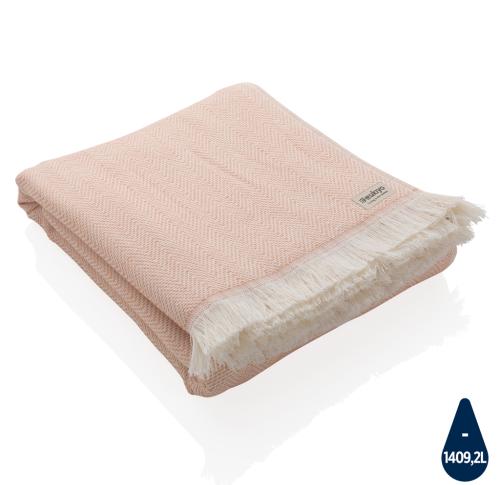 Our most luxurious and versatile towel. The perfect travel companion in any circumstance. This towel contains 12% recycled cotton and is super soft and silky to the touch. With AWARE?? tracer that validates the genuine use of recycled cotton. You can use it for almost anything, such as the beach, travelling, sauna, swimming pool, camping, sports, as a beach towel, bath towel, scarf, pareo, yoga towel, blanket, as a wrap for your child - you name it. Perfect??for??sofas and dressing beds,??the Hisako throws??are also??wonderful for sunbathing on or using as a machine-washable picnic blanket. These four seasons hammam towels are??quick-drying, mould resistant and incredibly??easy to clean making them a brilliant choice for allergy sufferers, red wine lovers and beachgoers.?? Each towel saves 1409,2 litres of water. 2% of proceeds of each Impact product sold will be donated to Water.org. Machine washable. Made in Portugal