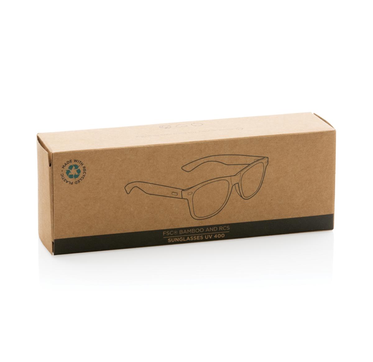 Sunglasses made with RCS certified recycled PC frame and FSC?? 100% bamboo temples . Recycled content of frame is 100%. Total recycled content: 41% based on total item weight. RCS certification ensures a completely certified supply chain of the recycled materials. The lenses are smokey acrylic and conform EN ISO 12312-1, UV 400 and CAT 3. Packed in a FSC?? kraft packaging.