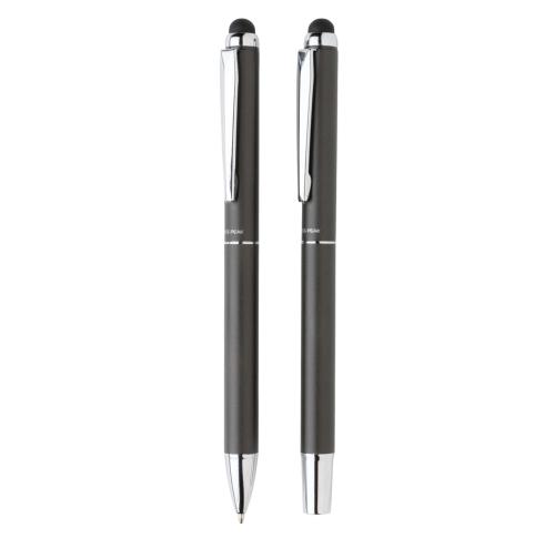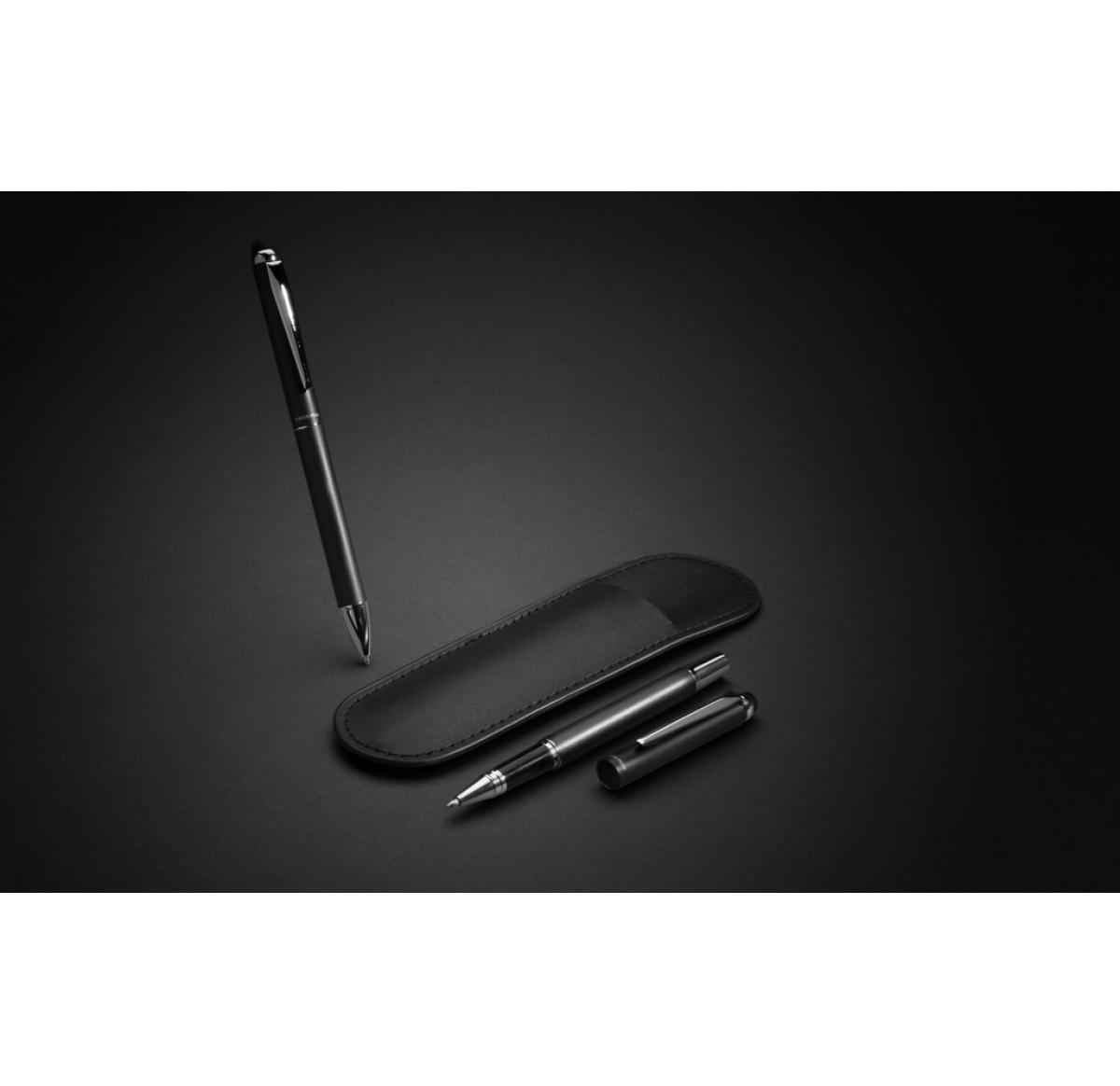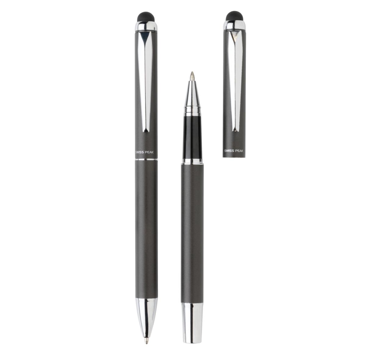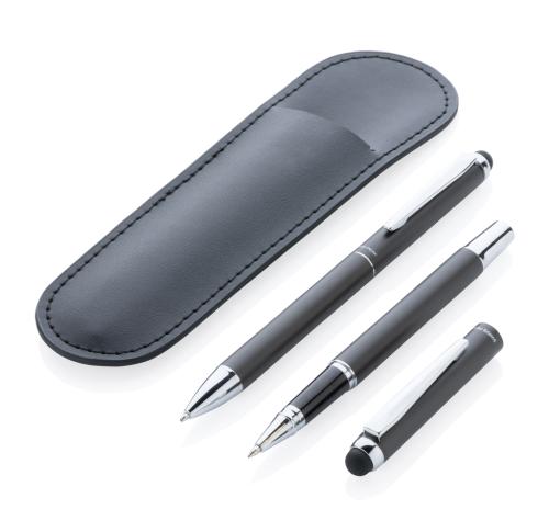 This Swiss Peak deluxe pen set includes one ballpoint and one rollerball to deliver the total writing experience. Both of the items featured in this gift set feature a quality aluminium barrel and beautiful matt gunmetal finish. Each pen includes blue coloured Dokumental ink. The writing length for the pen is 1200 metre and the roller ball is 400 metre. The pen set comes in a luxury PU pouch and black gift box.