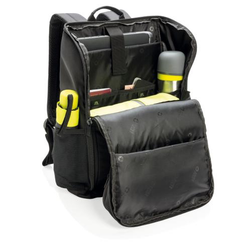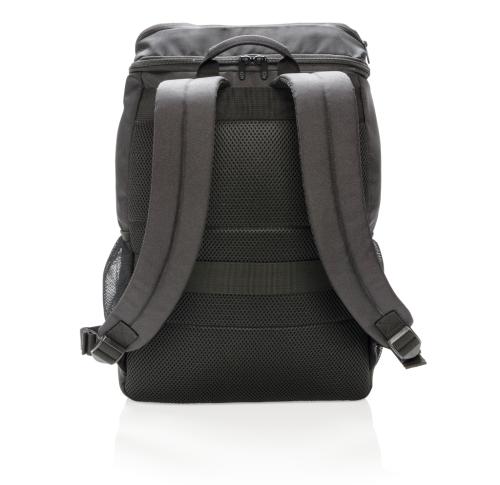 This modern & minimalist recycled polyester laptop backpack accompanies you on every commute through the professional landscape. With deep vertical front pockets and a neat easy wide open zipped lid that reveals a roomy interior complete with sections for both a laptop and an iPad. Includes RFID protected pockets inside. With AWARE?? tracer that validates the genuine use of recycled materials. Each bag saves 12 litres of water and has reused 21.4 PET bottles. 2% of proceeds of each Aware?? product sold will be donated to Water.org. PVC free.