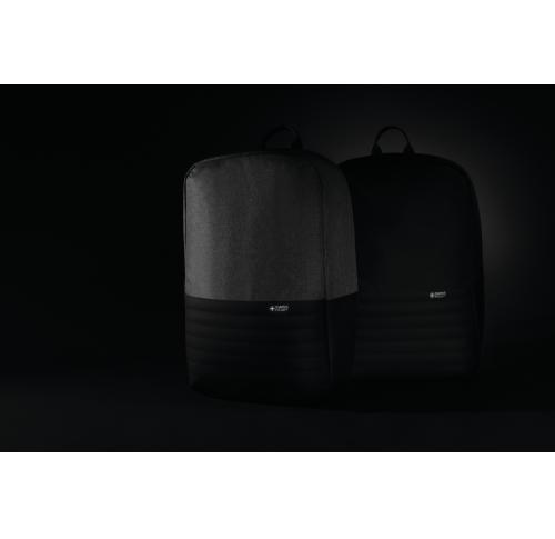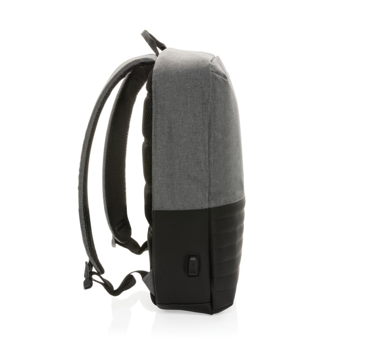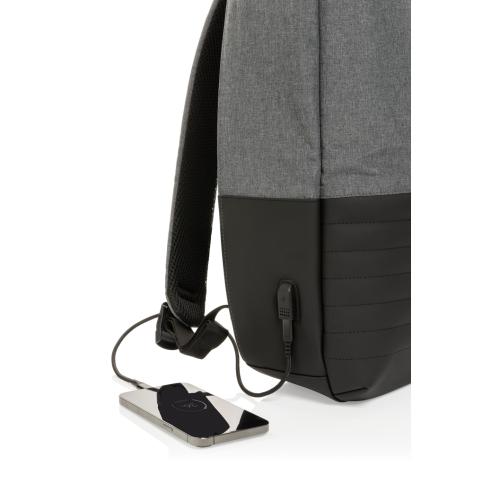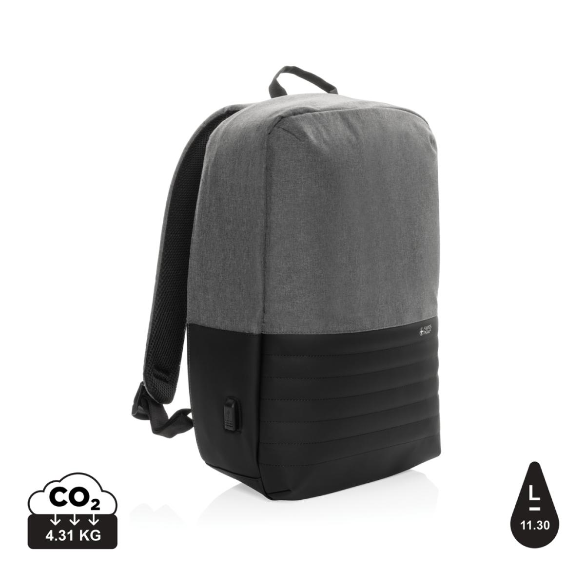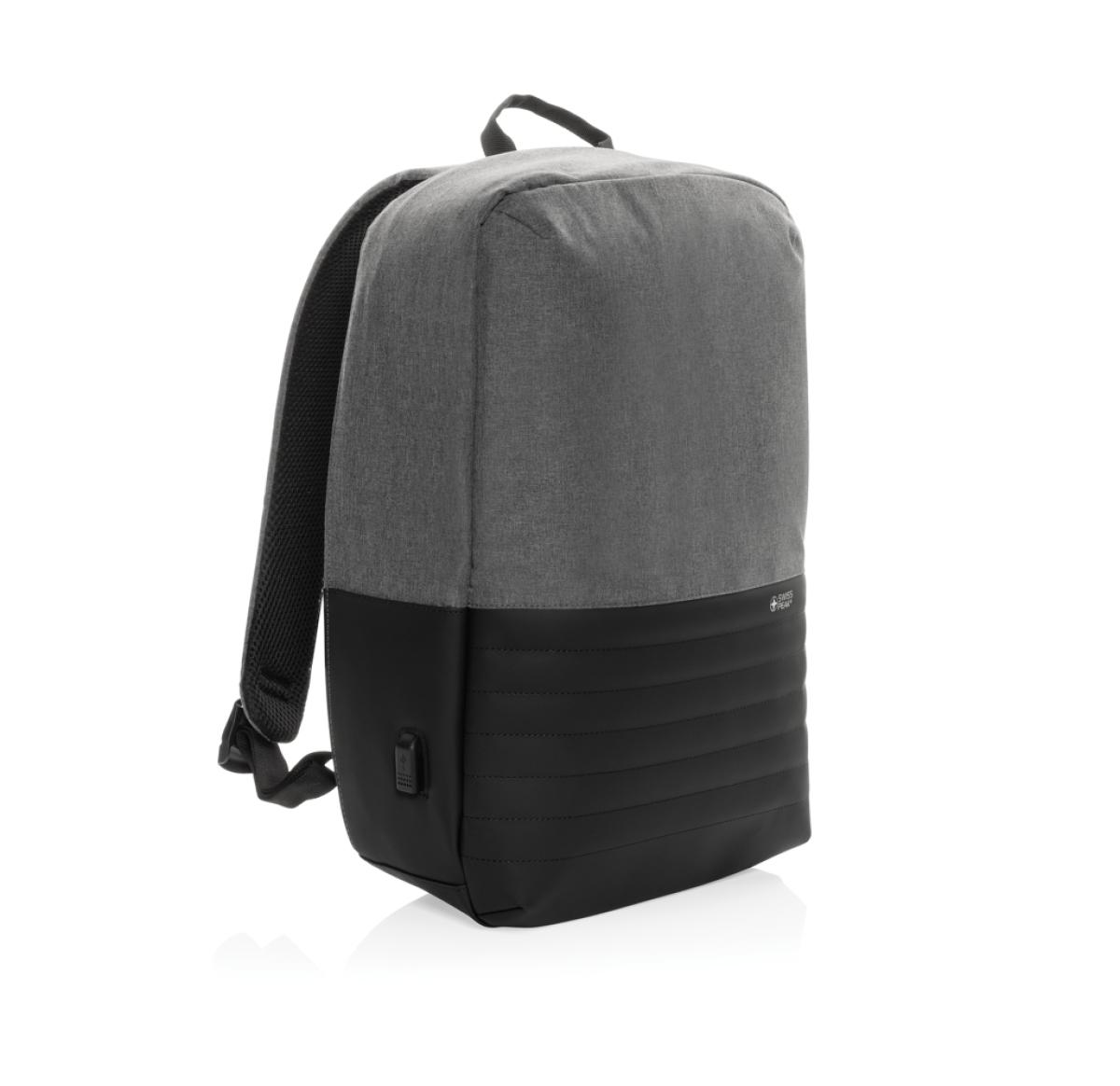 This Swiss Peak AWARE?? 15.6" laptop backpack with anti-theft back opening makes it easy to carry your tech gadgets and personal items out and about. The inner features a laptop and tablet compartment. RFID safe pockets for your wallet and passport. Connect your power bank easily to the integrated USB charging port and charge your phone or tablet on the go. Hidden easy access back pocket. With AWARE?? tracer that validates the genuine use of recycled materials. Each bag saves 12.4 litres of water on average and has reused 20.8 PET bottles. 2% of proceeds of each Aware?? product sold will be donated to Water.org.