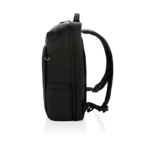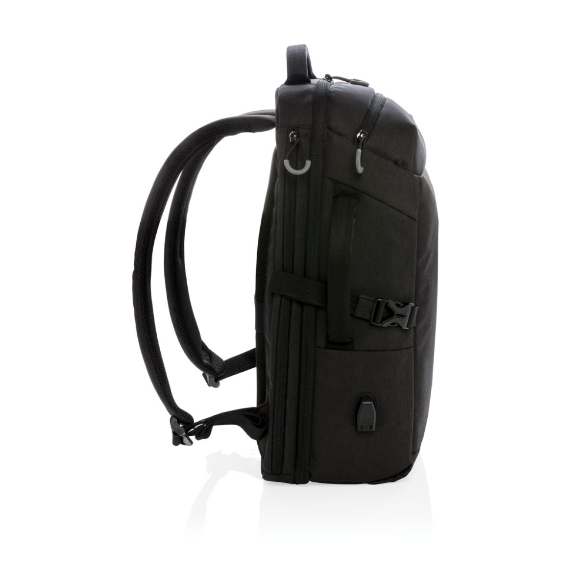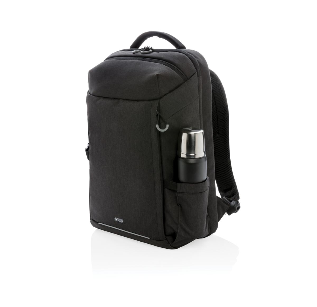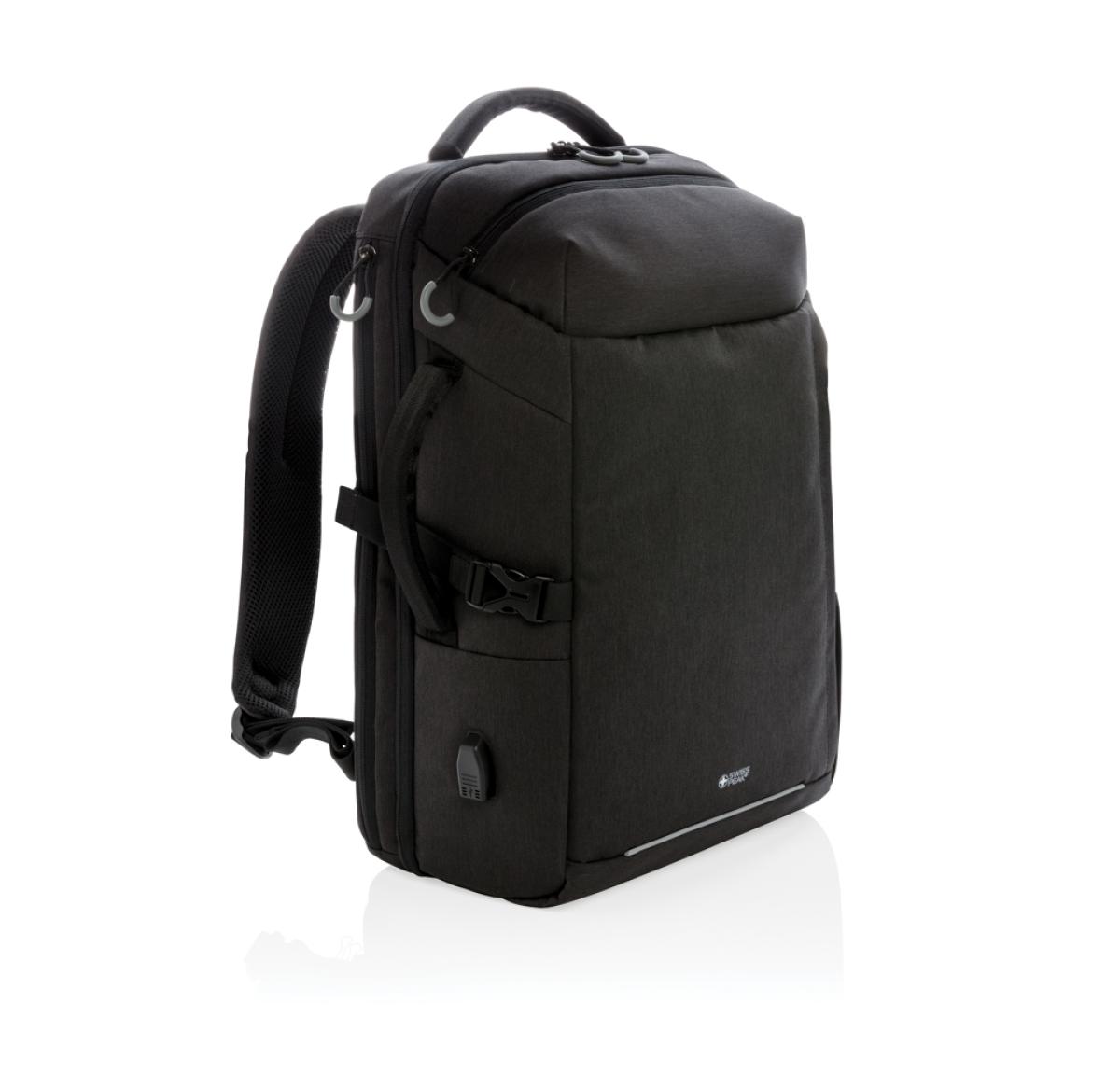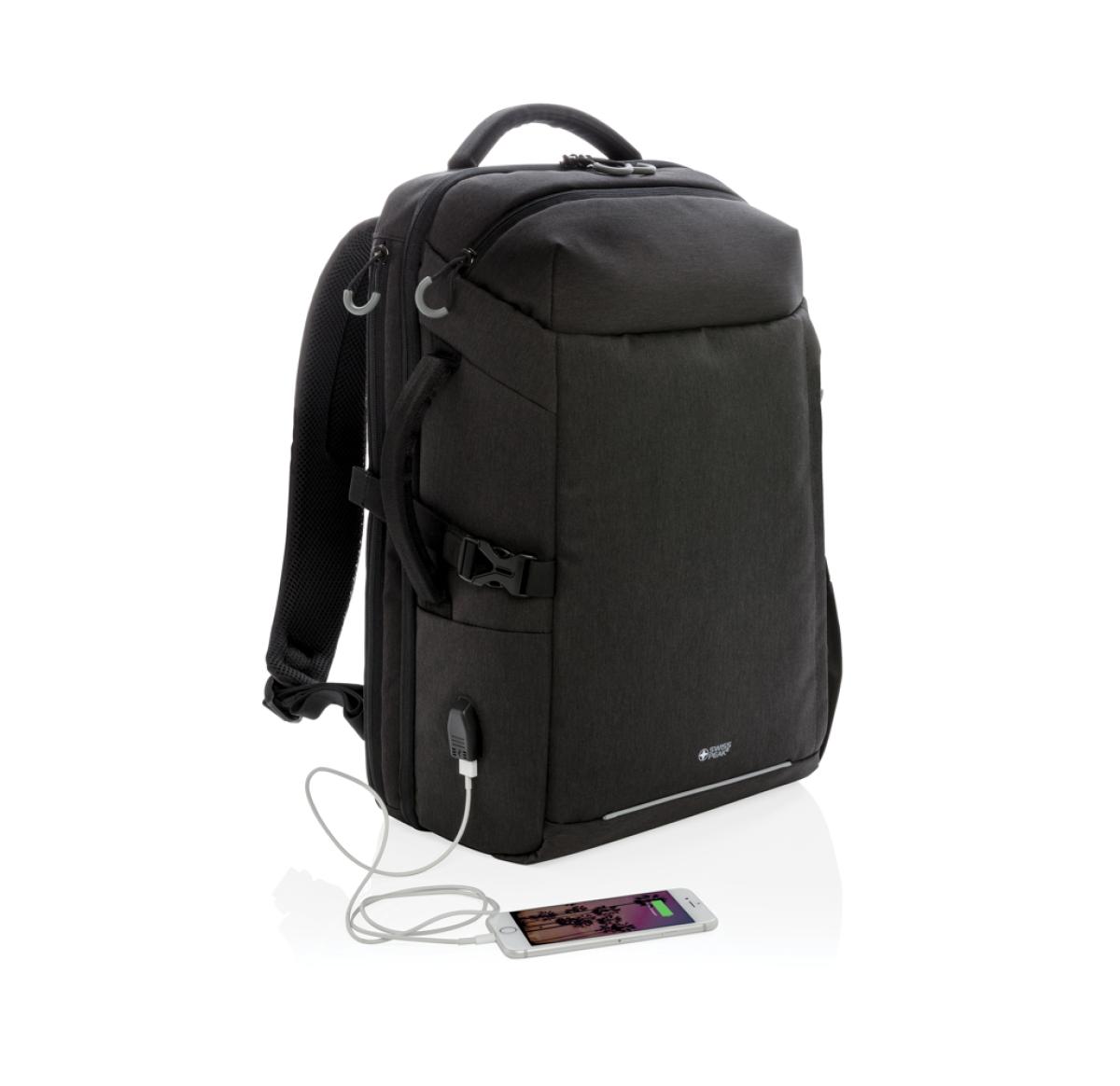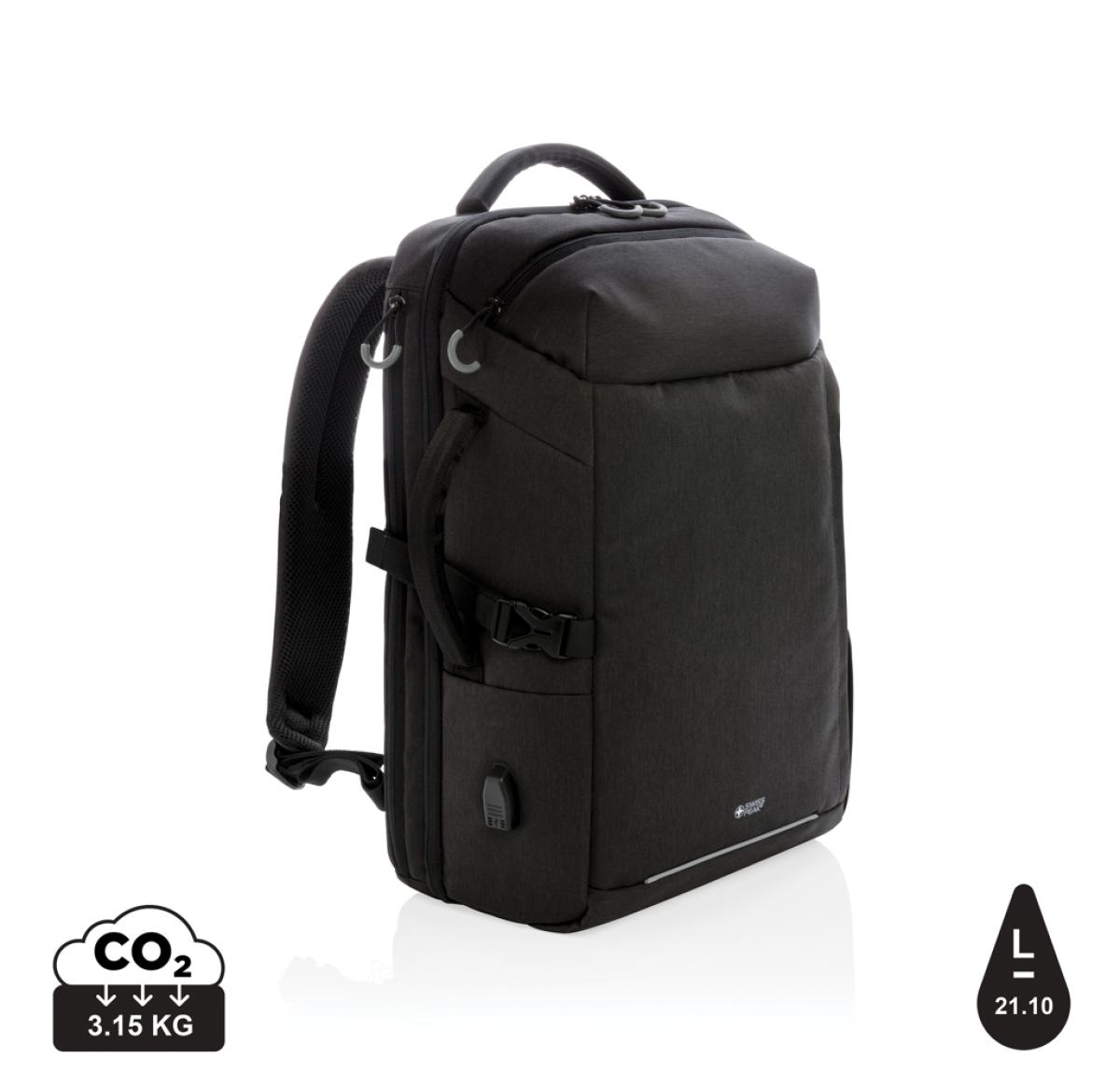 This carry-on travel backpack is intended for overnight or weekend trips. It is designed with a padded 17" laptop compartment to protect your device. This style has the capacity of a trolley without the weight of the wheels and handle, plus using a backpack makes you more mobile, hands-free and simplifies your travel experience. Leave your wheels at home and travel easily. Including trolley strap, water bottle side pocket and USB output. Top quick access pocket, front zippered pocket and RFID protected pockets. With AWARE?? tracer that validates the genuine use of recycled materials. Each bag saves 21 litres of water and has reused 35.5 0.5L PET bottles. 2% of proceeds of each Impact product sold will be donated to Water.org. PVC free.