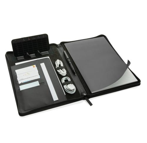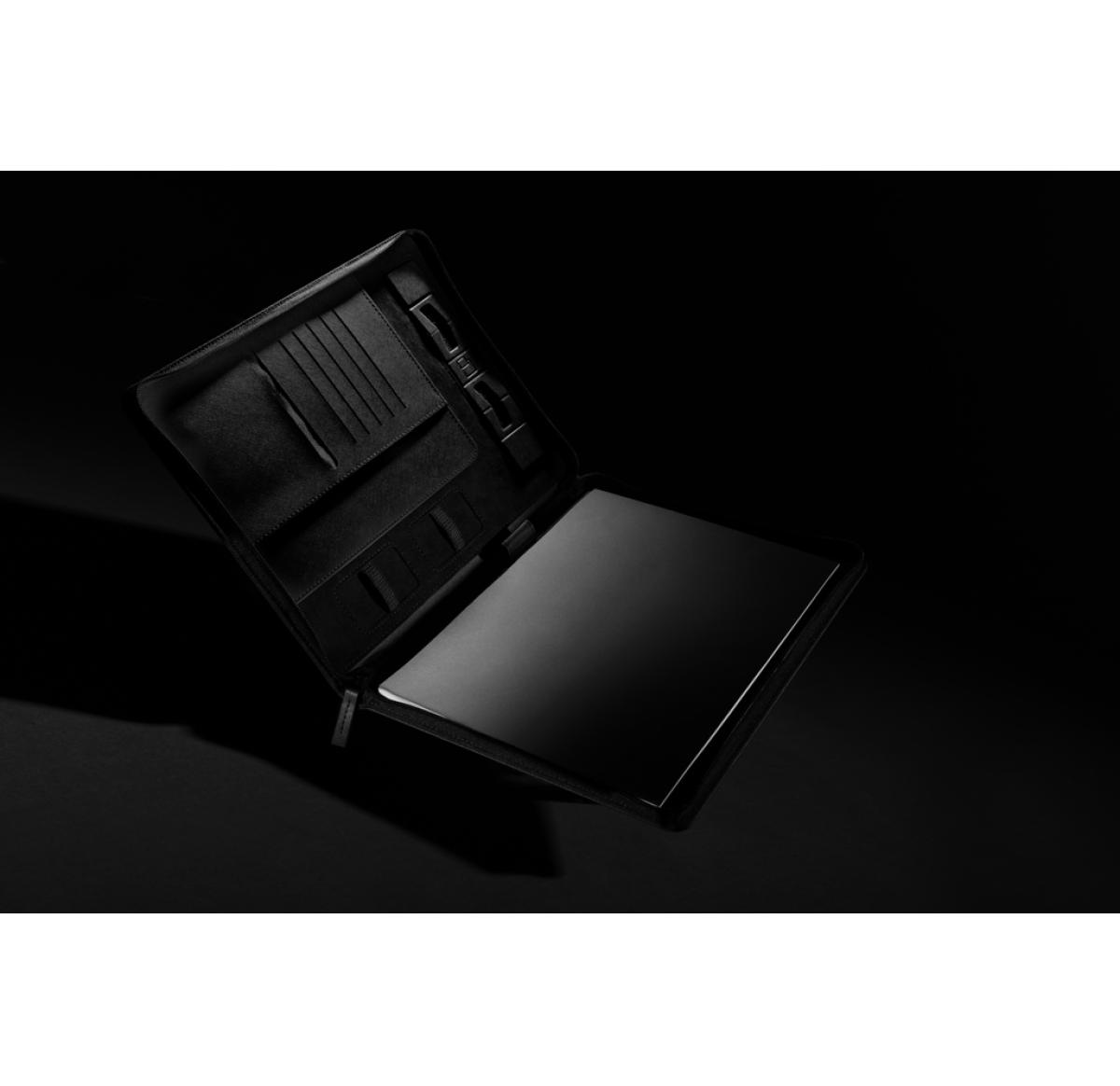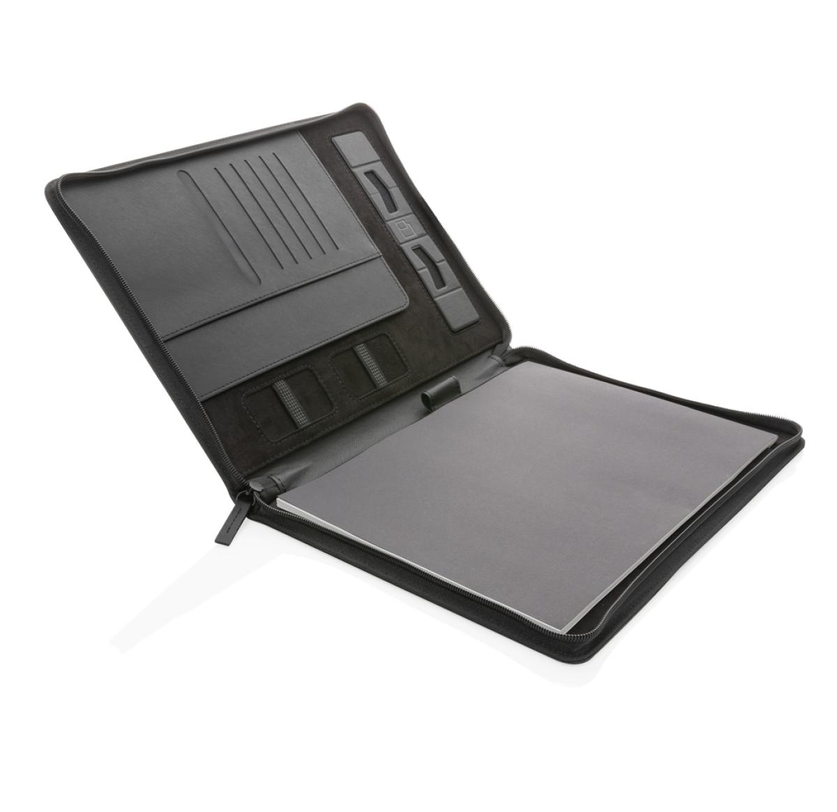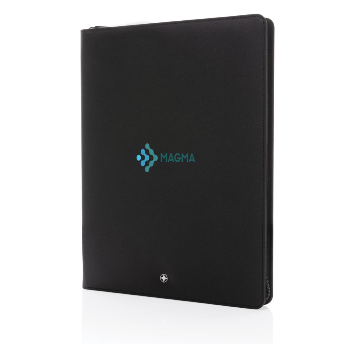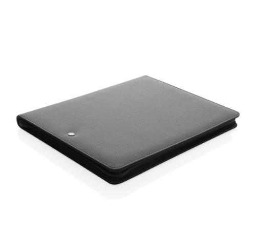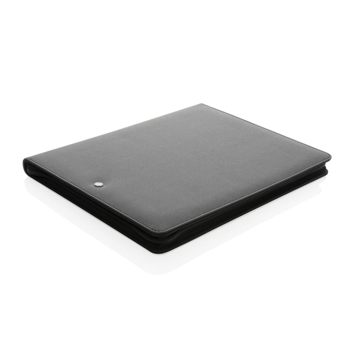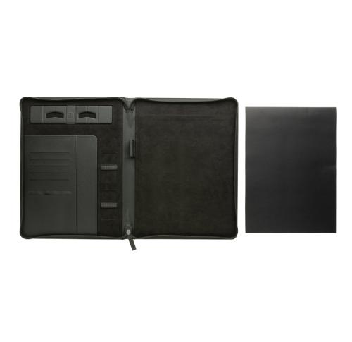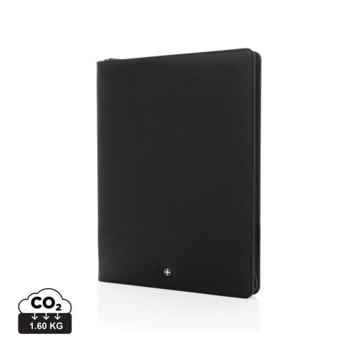 The Swiss Peak Heritage collection speaks the language of modern elegance. Presented in iconic Italian recycled PU cover with zipper . The inside provides a tablet/phone stand, gadget holders, business cards slots, sleeves for your notes and papers plus a pen loop. With lined 20 sheets A4 stone paper notepad. the portfolio is made with RCS (Recycled Claim Standard) certified recycled materials. RCS certification ensures a completely certified supply chain of the recycled materials. Made with 100% recycled RCS certified recycled PU. Total recycled content: 9% based on total item weight. PVC free.