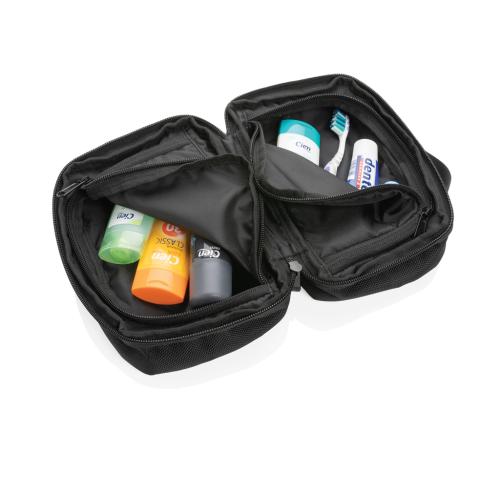The Swiss Peak AWARE?? RPET Voyager toiletry bag is made from durable 1680D recycled polyester with rich PU details that give the toiletry bag a very sophisticated look. The toiletry bag has two roomy zipper compartments to hold all your toiletry essentials. The exterior is made from 1680D recycled polyester and the lining is 150D recycled polyester. With AWARE?? tracer that validates the genuine use of recycled materials. Each toiletry bag saves 6 litres of water and has reused 10.14 0.5L PET bottles. 2% of proceeds of each product sold containing AWARE?? will be donated to Water.org.