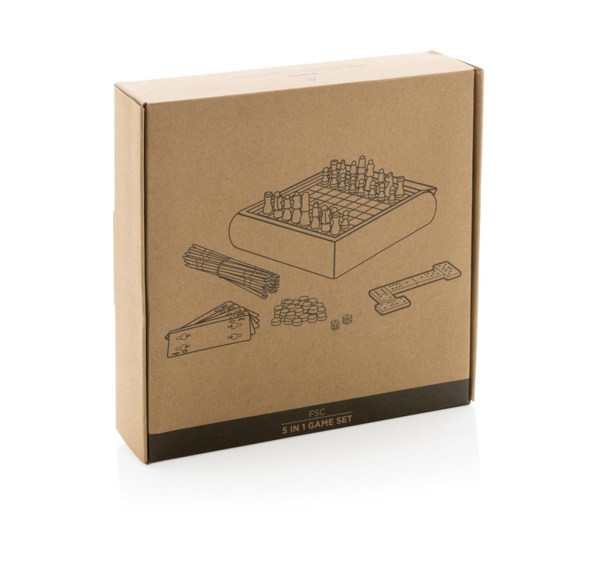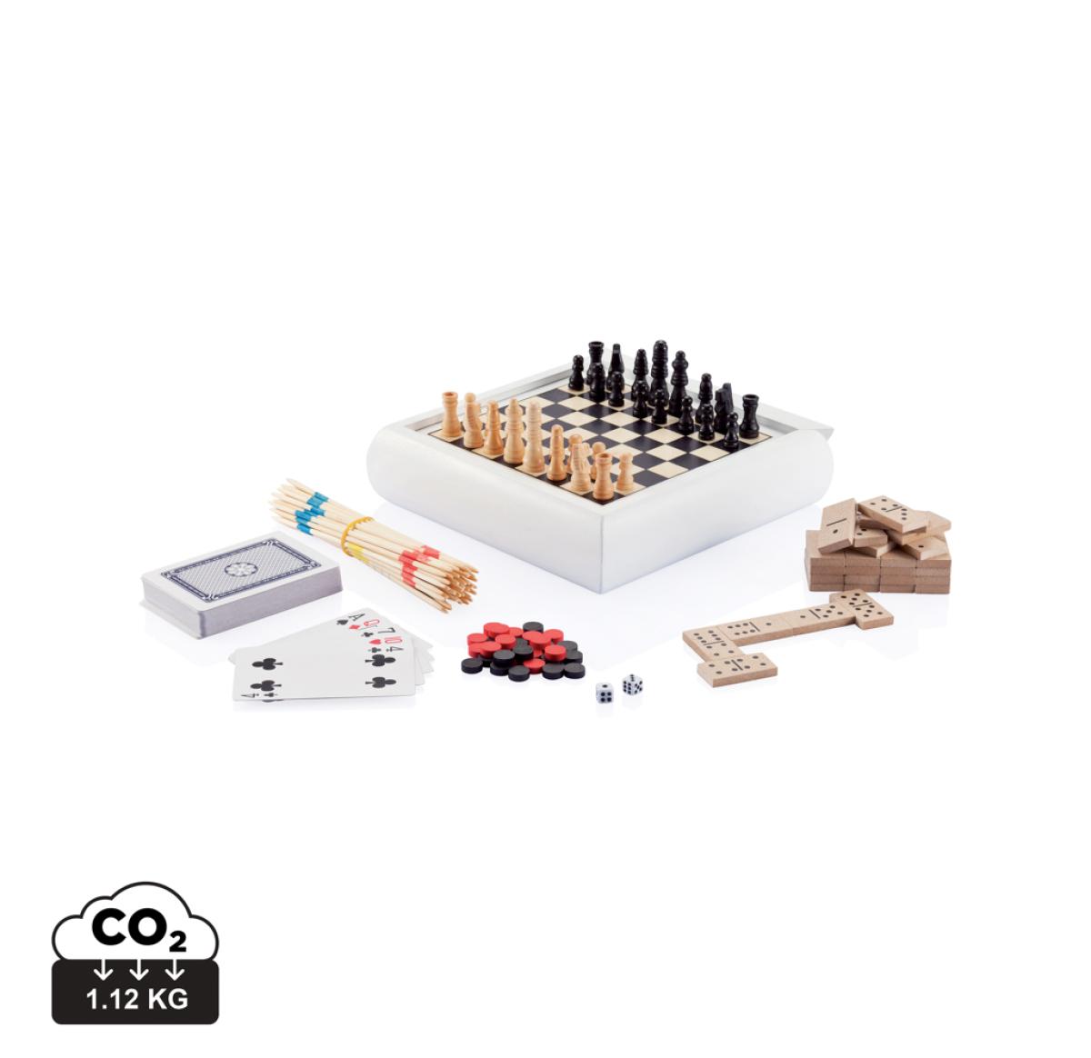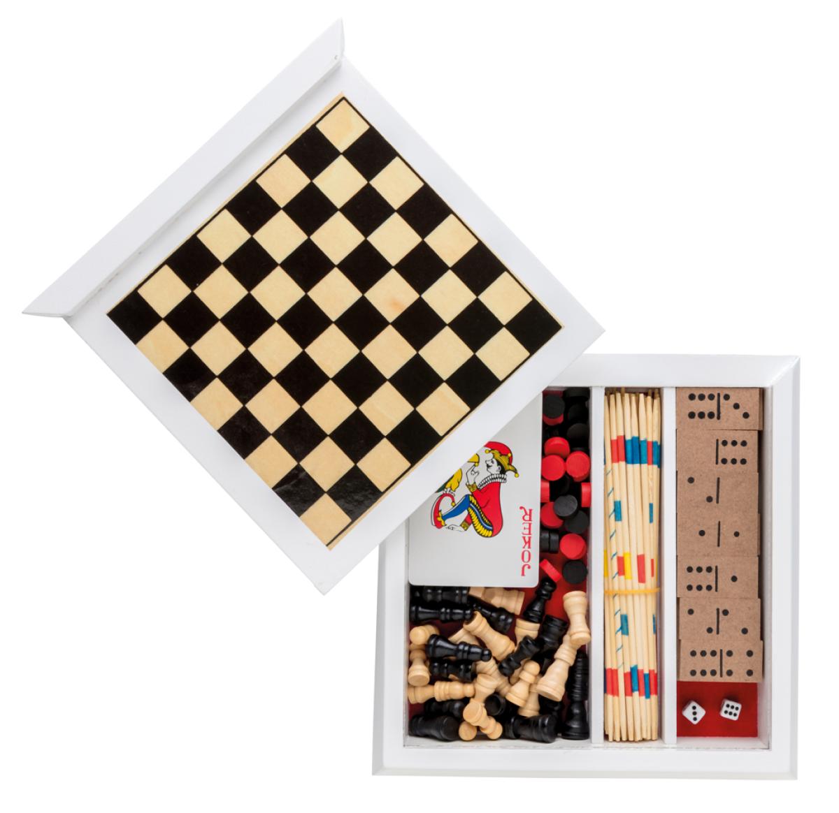 Enjoy fun gaming moments together with your friends! This 5 in 1 game set includes: mikado, playing cards, domino, chess and backgammon. White pine wood box 17x17x3,7cm with black print chess board at one side of lid and black/red printed backgammon board on bottom of box. Made with FSC??certified wood. Comes in FSC??certified kraft gift packaging.