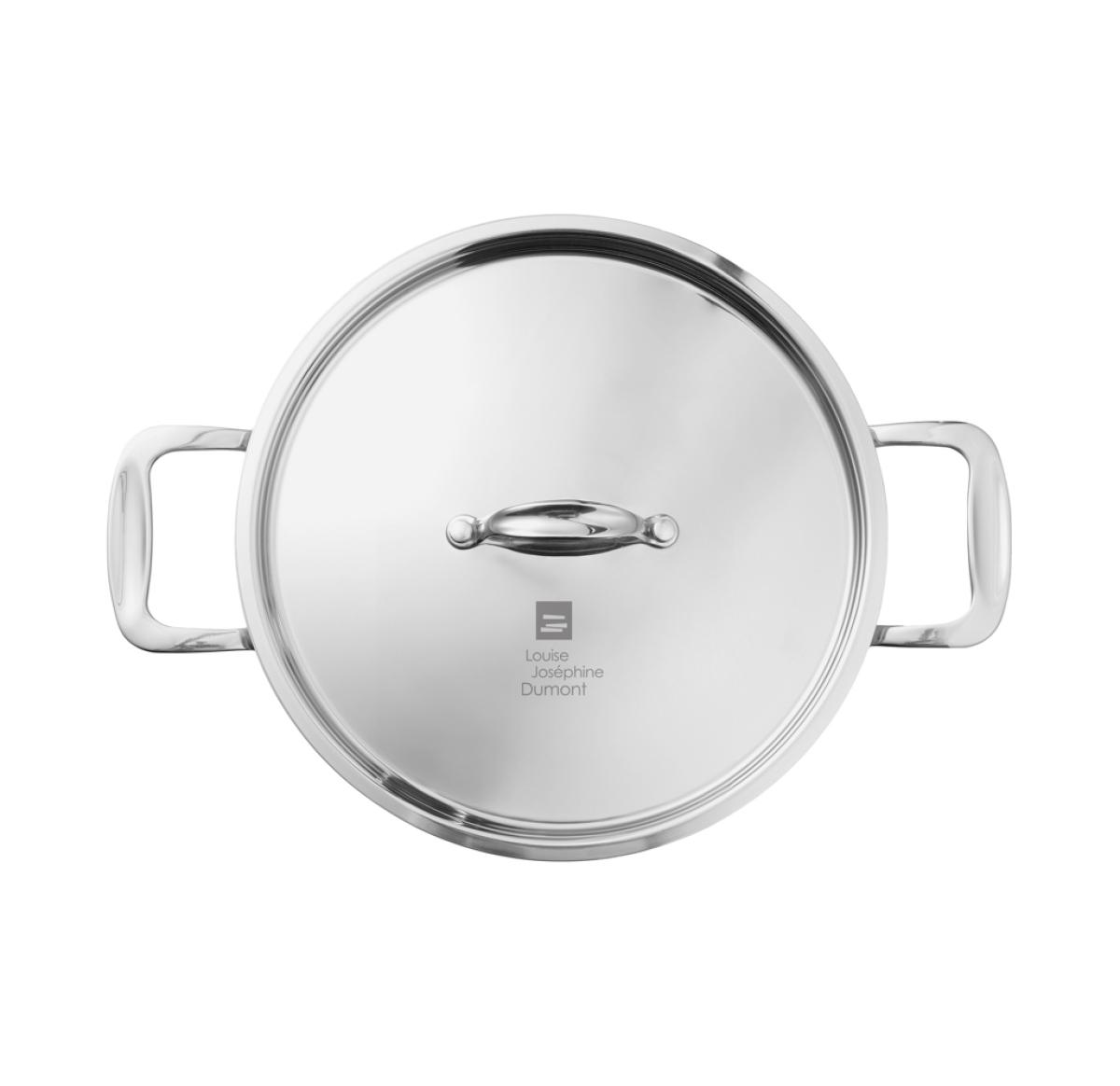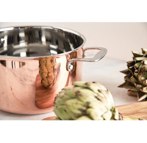 Exclusive tri-ply copper saucepan. The first layer is the copper exterior, the interior consists of a layer of aluminium and a layer of stainless steel, which make it easy to clean. The copper and aluminium layers conduct heat well, allowing the pot to heat up quickly and evenly. The base has been reinforced with a thicker stainless steel plate which allows for use on an induction hob. The saucepan has stainless steel handles that stay cooler while cooking. Suitable for all types of stoves, including induction.