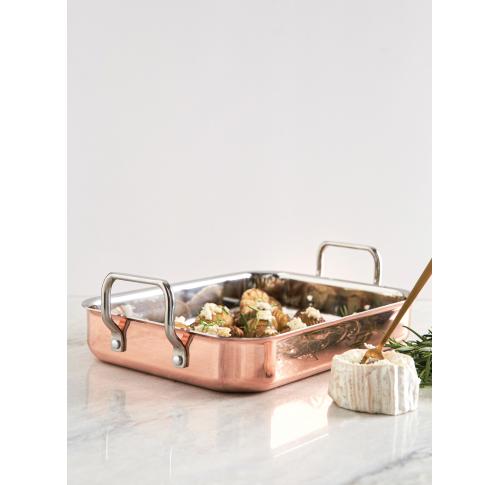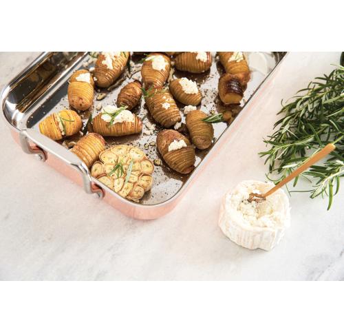 Exclusive tri-ply copper oven dish. The first layer is the copper exterior, the interior consists of a layer of aluminium and a layer of stainless steel, which make it easy to clean. The copper and aluminium layers conduct heat well, allowing the pot to heat up quickly and evenly.