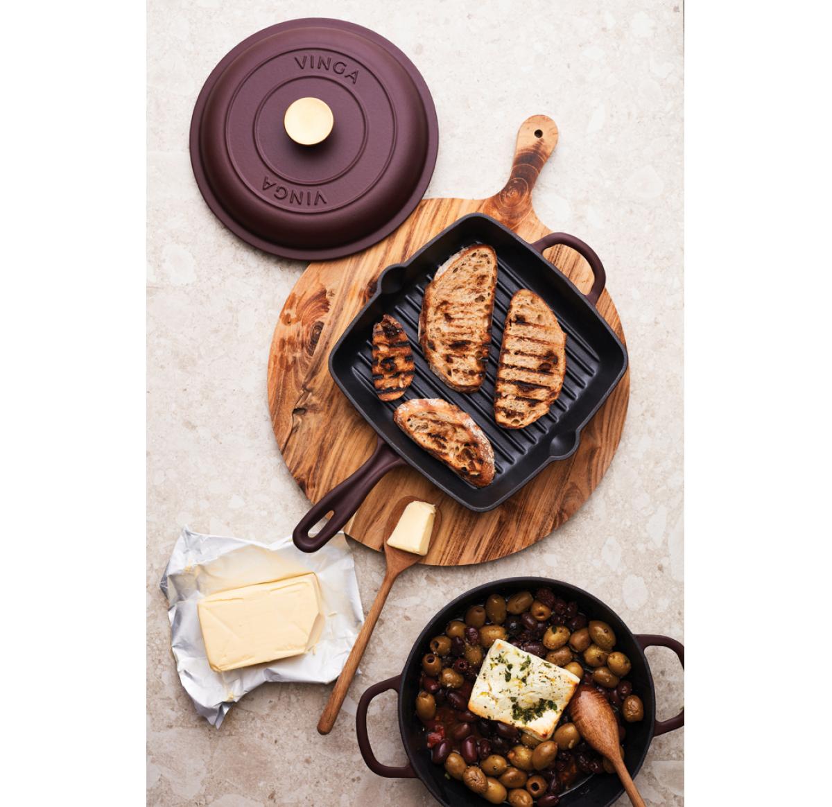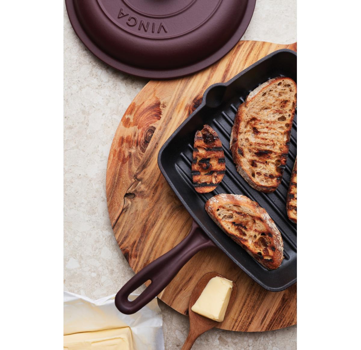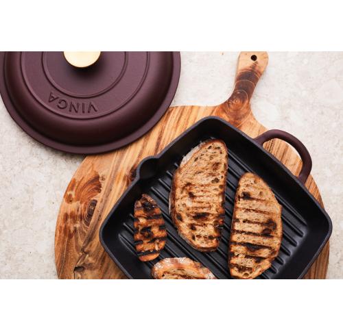 A classic enamelled cast iron grill pan with a griddle that elevates the contents and produces indirect heat, akin to a grill. This design also allows for efficient drainage of fat, preventing the food from cooking in excess fat. The cast iron material ensures even distribution of heat throughout the griddle and enables it to retain heat for a prolonged period. The pan's durability enables it to be used on various heat sources, including the oven, making it ideal for keeping dinner warm for extended periods.