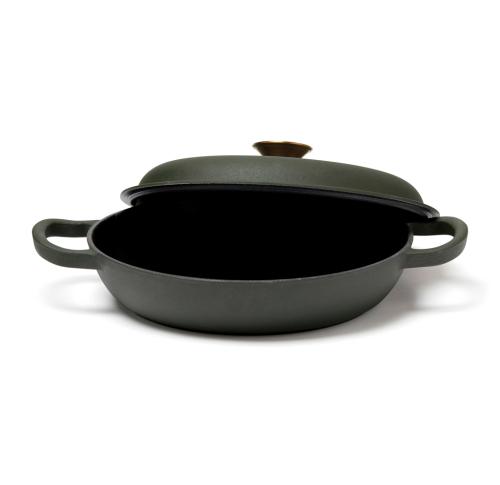 A versatile cast iron sauté pan suitable for a range of culinary applications. From frying to small casseroles or sauce dishes, this pan is also an excellent baking dish. With exceptional heat capacity, the pot boasts a thick base that minimises the risk of burning. The lid features small spikes that allow for gentle and even distribution of water vapour from condensation over the contents, making it a self-basting feature. The interior of the pan is coated with black enamel, featuring larger pores and a slightly rougher surface that over time fills with oil to create a non-stick patina akin to raw cast iron. This sauté pan is compatible with all types of hobs, including induction hobs.