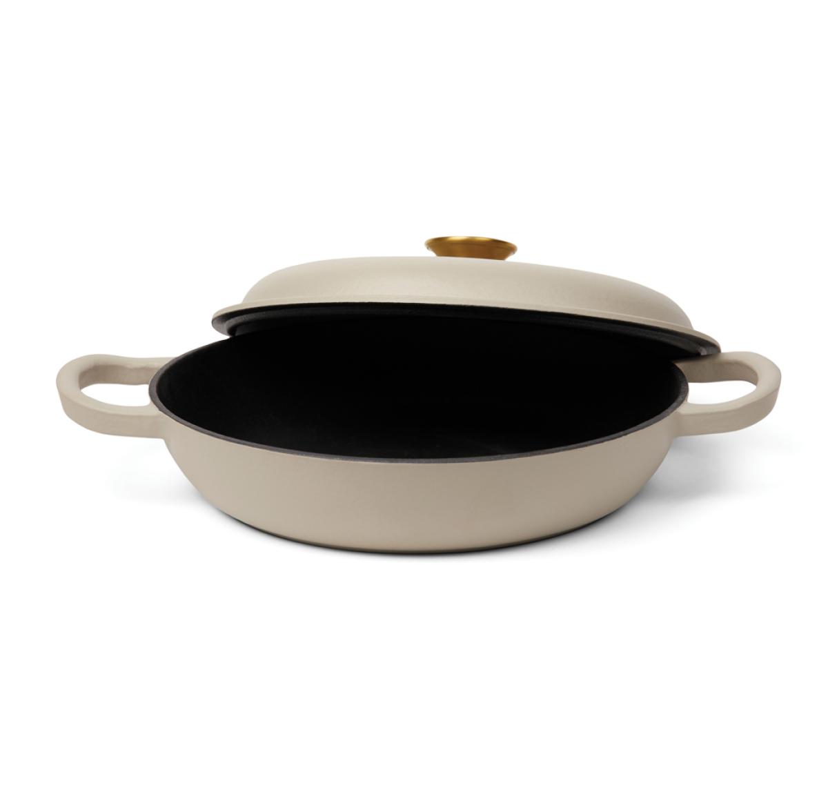 A versatile cast iron sauté pan suitable for a range of culinary applications. From frying to small casseroles or sauce dishes, this pan is also an excellent baking dish. With exceptional heat capacity, the pot boasts a thick base that minimises the risk of burning. The lid features small spikes that allow for gentle and even distribution of water vapour from condensation over the contents, making it a self-basting feature. The interior of the pan is coated with black enamel, featuring larger pores and a slightly rougher surface that over time fills with oil to create a non-stick patina akin to raw cast iron. This sauté pan is compatible with all types of hobs, including induction hobs.