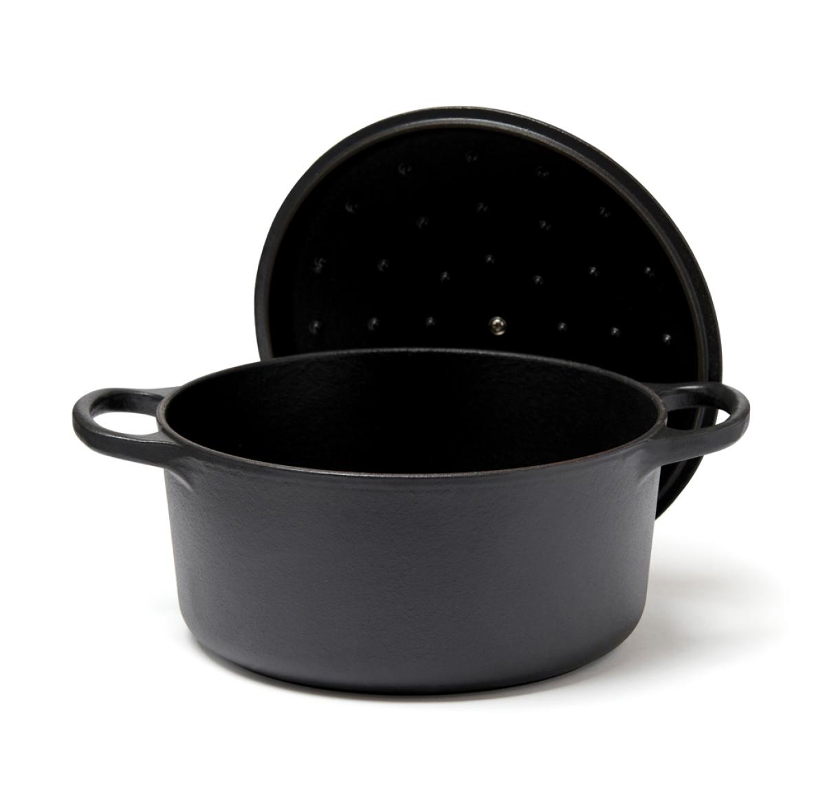 Experience the Monte series' large and robust cast iron pot, perfect for casseroles and slow cooking, thanks to its exceptional heat capacity. The pot boasts a thick base that prevents contents from burning easily. The lid features small spikes that enable even and gentle distribution of water vapour from condensation over the contents, offering a self-basting feature. The pot's black enamel interior features larger pores and a slightly rougher surface that gradually fills with oil over time, producing a non-stick patina like that of raw cast iron. This cast iron pot is suitable for all types of hobs, including induction hobs.