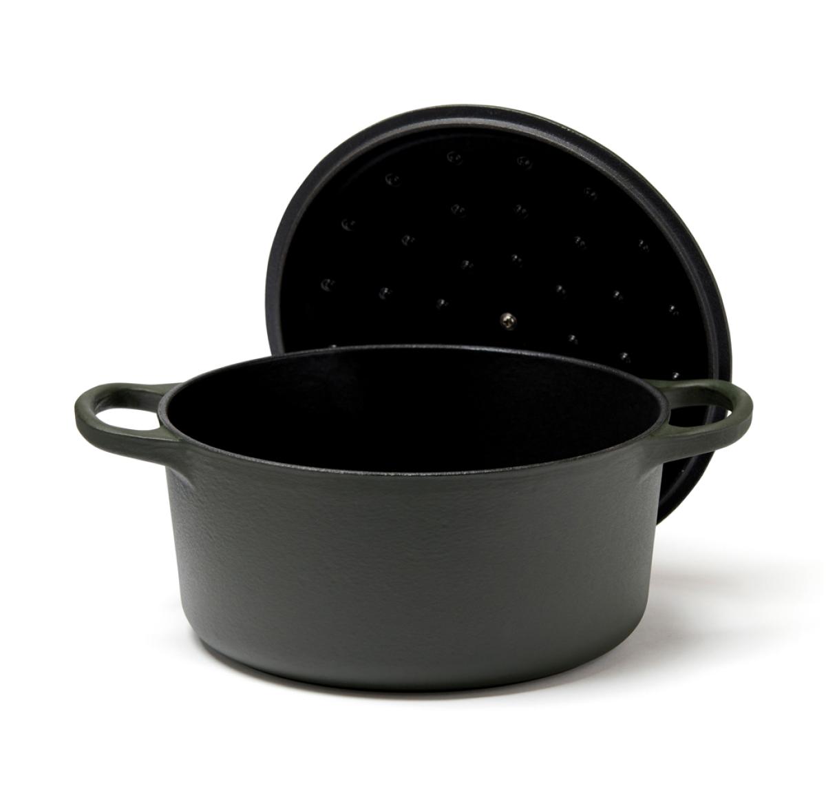 Experience the Monte series' large and robust cast iron pot, perfect for casseroles and slow cooking, thanks to its exceptional heat capacity. The pot boasts a thick base that prevents contents from burning easily. The lid features small spikes that enable even and gentle distribution of water vapour from condensation over the contents, offering a self-basting feature. The pot's black enamel interior features larger pores and a slightly rougher surface that gradually fills with oil over time, producing a non-stick patina like that of raw cast iron. This cast iron pot is suitable for all types of hobs, including induction hobs.