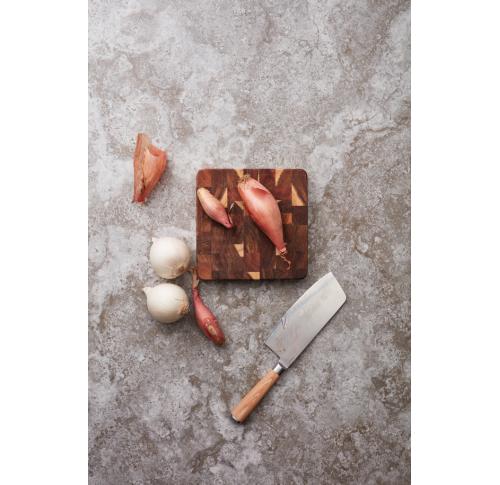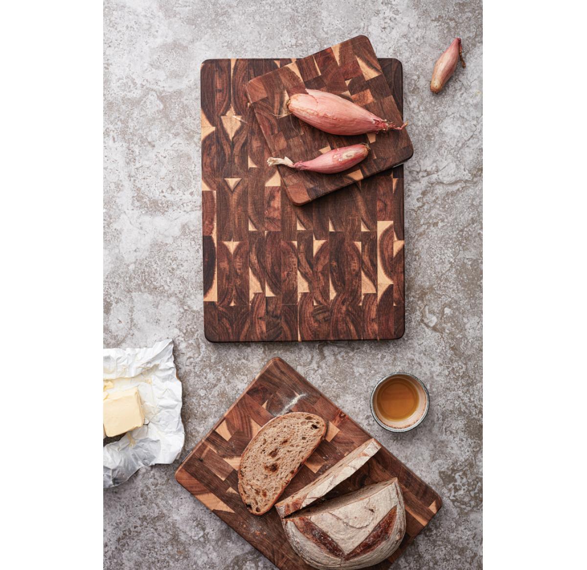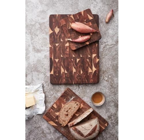 Cutting board in beautiful FSC-certified acacia wood. Excellent for serving. Due to the beautiful grain of the acacia wood, each cutting board is unique. With grooves on the short sides to enable a better grip. Acacia wood is a durable material that will last for many years. This cutting board is made of end-grain wood which requires considerably more production, as the pieces of wood have to be glued and paired together in such a way that the board will not warp over time. The result is a very exclusive cutting board, one of the very best you can own. With proper care, it will last a long time.