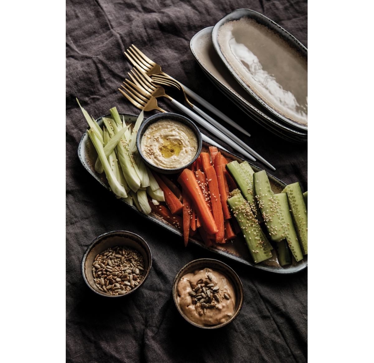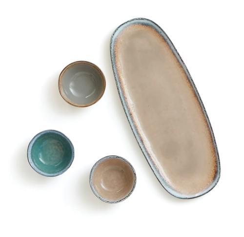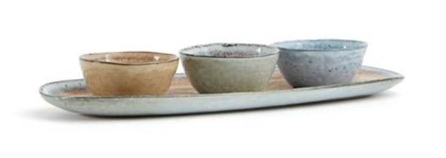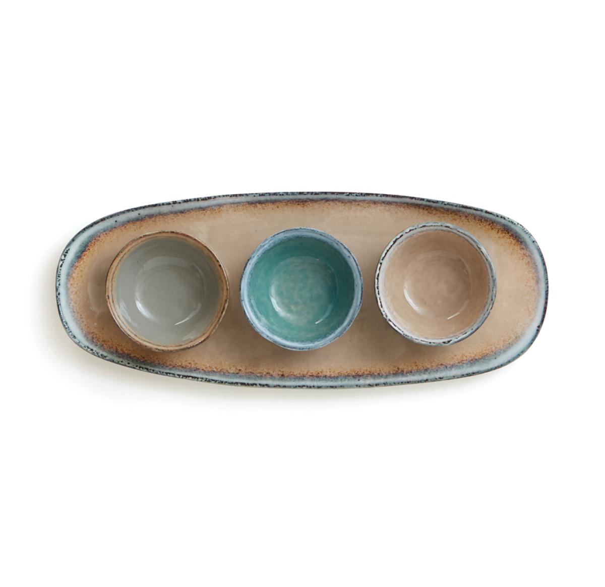 Stoneware serving dish with three small bowls. Unlimited possibilities: Tapas, dips or snacks. The serving dish alone is great for serving salads or canapés. Nomimono draws its inspiration from nature and the earth around us, creating this rustic range in natural earth tones where no two items are the same. Japanese meets Scandinavian, rustic meets modern. Collectibles for a down-to-earth and inspiring serving. Each item is handmade and unique. Every item is glazed three times to obtain the right kind of finish. Dishwasher and microwave safe.