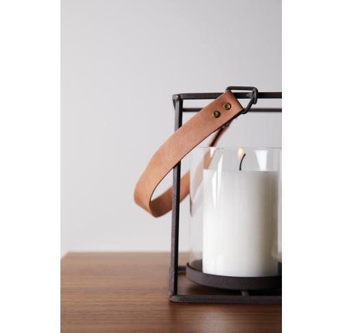 Lantern in an industrial-inspired design with straight lines. A handle made of soft imitation leather, simple steel profiles and a glass cylinder. Simple construction that looks good wherever it is placed.