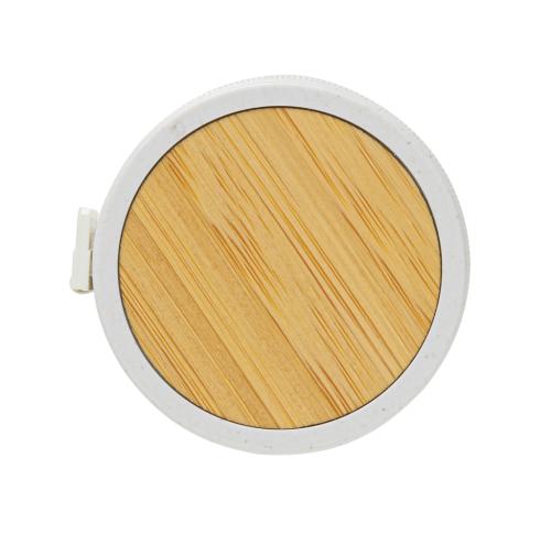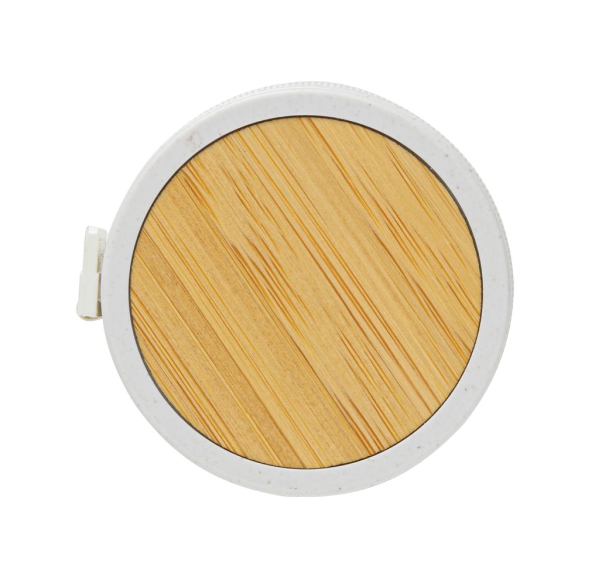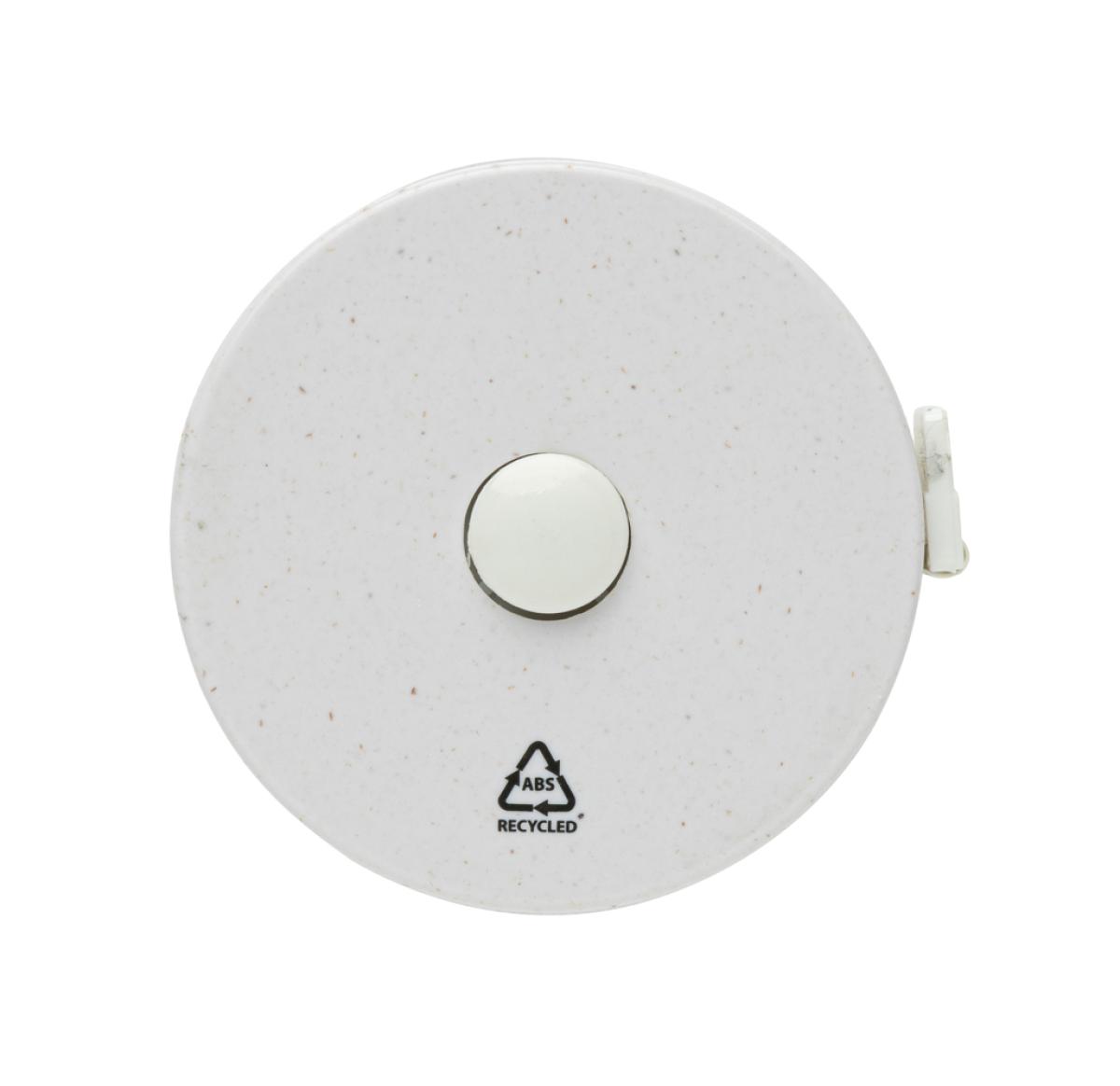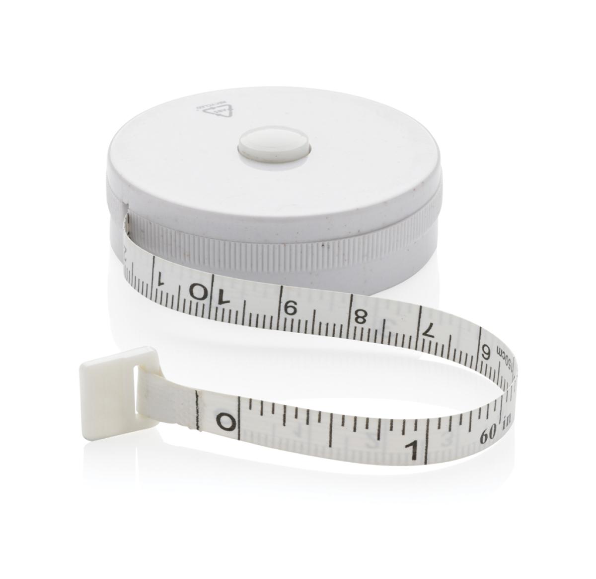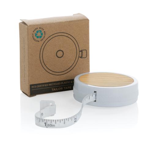 1.5m/60inch recycled plastic tape with return push button, for fitness and fashion. The case is made out of RCS certified recycled ABS plastic, fibreglass and FSC® 100% bamboo. Total recycled content: 64% based on total item weight. RCS certification ensures a completely certified supply chain of the recycled materials. The tape is 8mm wide and retractable by button. Packed in FSC® mix packaging.