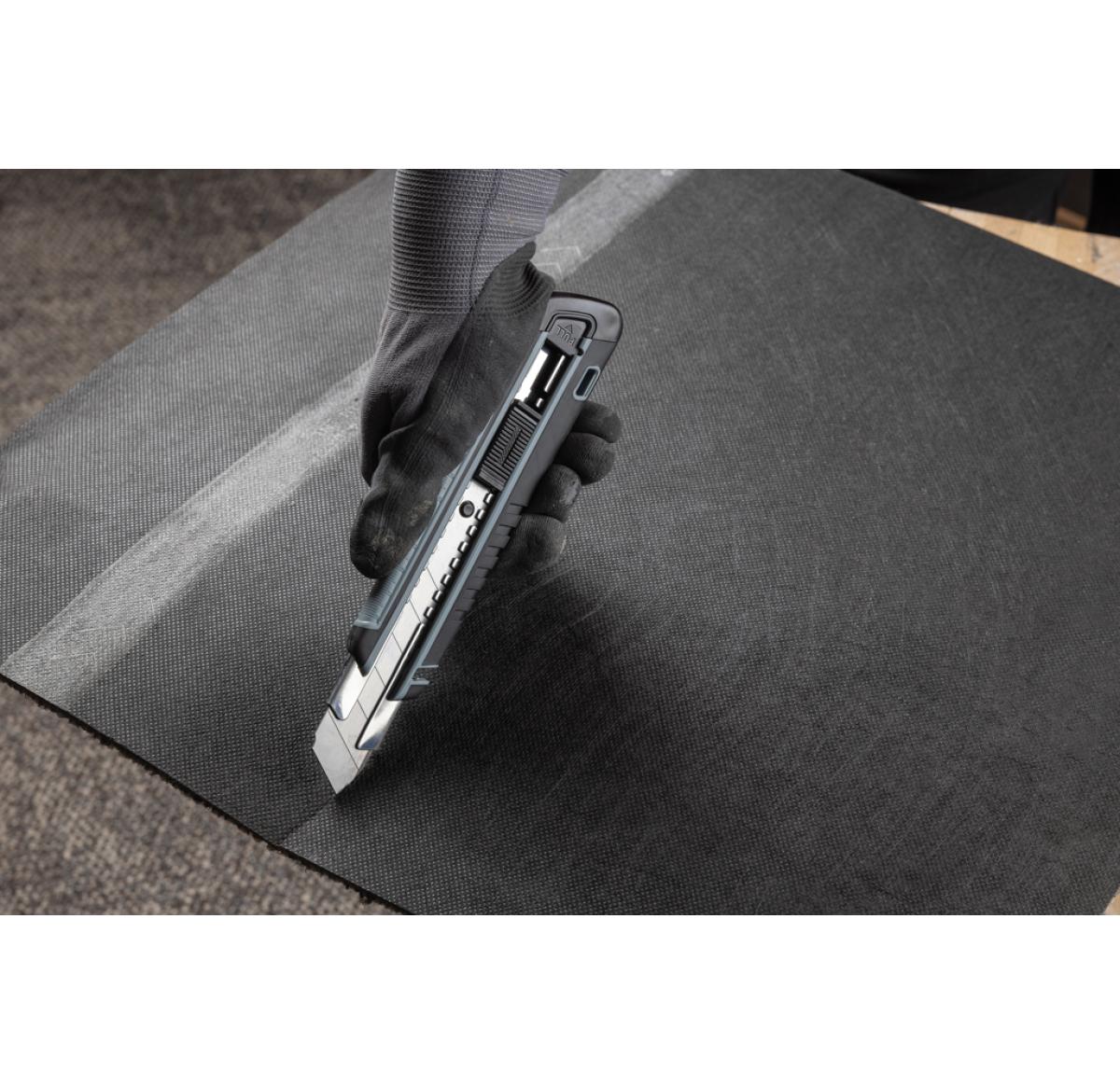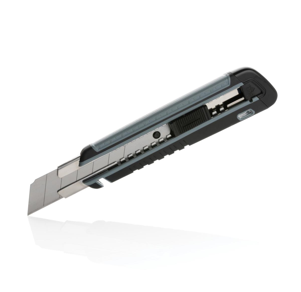 Refillable RCS certified recycled plastic heavy duty snap-off knife made with RCS (Recycled Claim Standard) certified recycled ABS, TPE and stainless steel blade. Total recycled content: 41% based on total item weight. RCS certification ensures a completely certified supply chain of the recycled materials. This versatile knife features a snap-off blade design, allowing you to easily replace the SK4 blade when it becomes dull. Whether you need to cut through cardboard, plastic, or even thin sheets of metal, the snap-off knife is up to the task. The sharp, durable blade ensures that you'll get clean, precise cuts every time. The knife is also incredibly easy to use. The comfortable handle provides a secure grip, allowing you to maintain complete control as you cut. Plus, the lightweight design makes it easy to carry with you wherever you go. Packed in FSC® mix kraft package. The item comes with 1 blade inside the item and two extra blades.