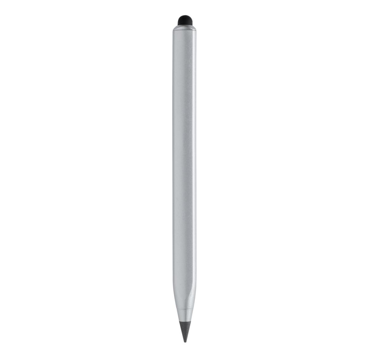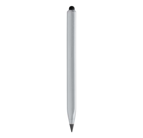 Modern infinity pen made with RCS certified recycled aluminum. Total recycled content: 40% based on total item weight. RCS certification ensures a completely certified supply chain of the recycled materials. Triangle shaped body with CM indication on one side and Inches on another side. Traditional wooden pencils write only up to around 200 metres but this Tree free infinity pencil, has a writing length of up to around 20000 metres using a graphite tip to produce a graphite line. Not only does it write like a pencil, but the markings can be erased. It works by leaving a graphite line on paper just like a regular traditional wooden pencil but it wears down so slowly, that it should outlast up to 100 traditional wooden pencils! With touch tip to operate mobile device. Packed in FSC® mix packaging.