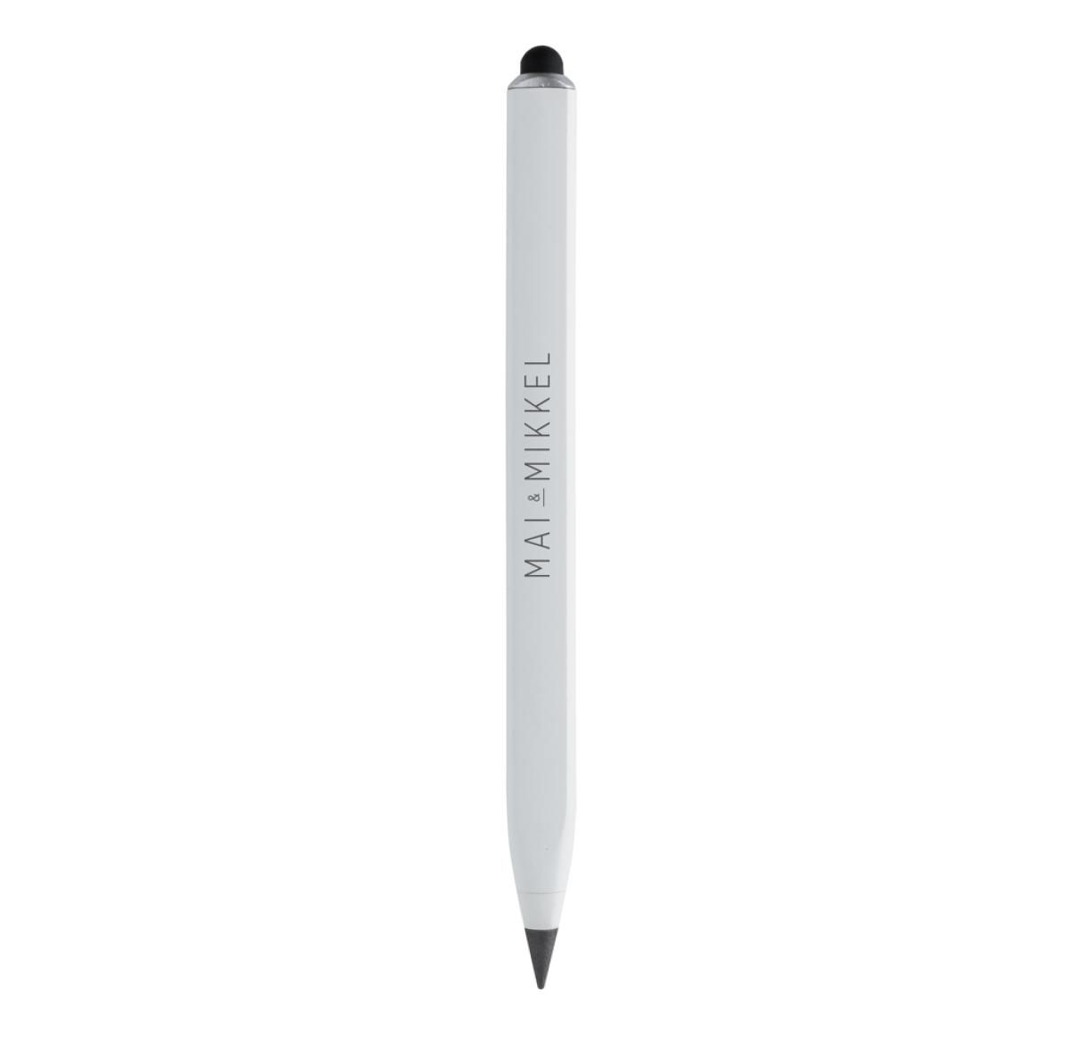 Modern infinity pen made with RCS certified recycled aluminum. Total recycled content: 40% based on total item weight. RCS certification ensures a completely certified supply chain of the recycled materials. Triangle shaped body with CM indication on one side and Inches on another side. Traditional wooden pencils write only up to around 200 metres but this Tree free infinity pencil, has a writing length of up to around 20000 metres using a graphite tip to produce a graphite line. Not only does it write like a pencil, but the markings can be erased. It works by leaving a graphite line on paper just like a regular traditional wooden pencil but it wears down so slowly, that it should outlast up to 100 traditional wooden pencils! With touch tip to operate mobile device. Packed in FSC® mix packaging.