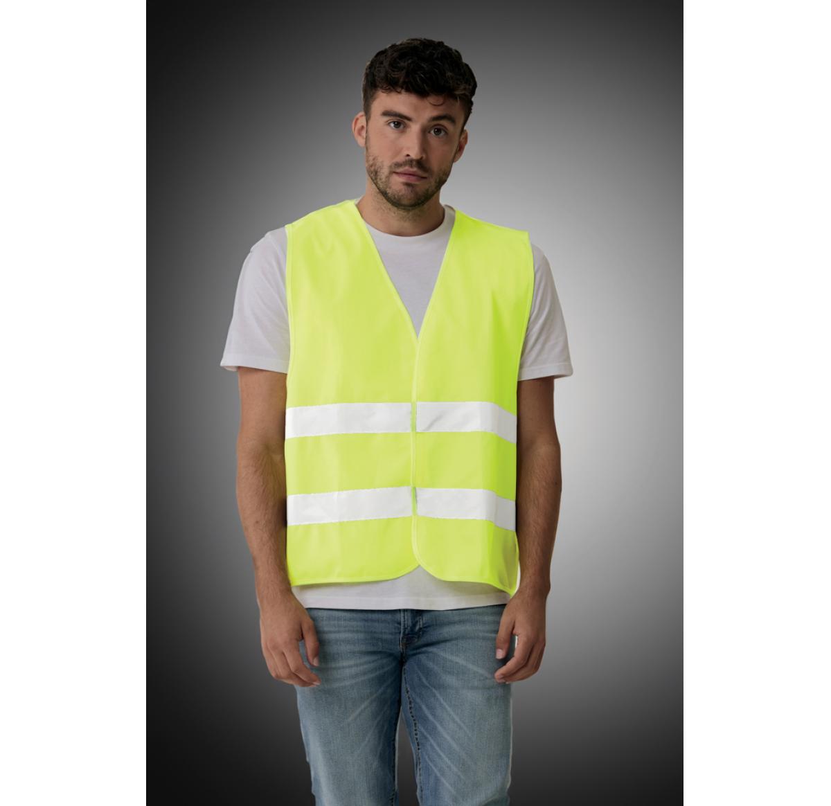 Unisex Class 2 high-visibility warning vest that is designed for individuals with heights ranging from 164 to 198 cm. This vest offer ample space for large decorations on both the front and back, making them ideal for professional use where visibility is paramount. It features a fluorescent background coupled with reflective tape, ensuring compliance with the EN ISO 20471:2013+A1:2016 standard. Furthermore, the garments are marked with the CE symbol to affirm their adherence to EU Regulation 2016/425/EU, categorizing it as Personal Protective Equipment Category II. Made with GRS certified recycled PET. Total recycled content: 67% based on total item weight. GRS certification ensures a completely certified supply chain of the recycled materials.