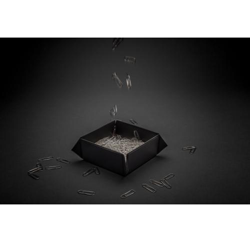 Foldable and magnetic storage box made with RCS certified recycled PU. Total recycled content: 21% based on total item weight. RCS certification ensures a completely certified supply chain of the recycled materials. The storage box comes flat in the packaging and can easily be folded into a storage box with the integrated magnets. Perfect for your desk or your bedside table. Packed in FSC® mix packaging.