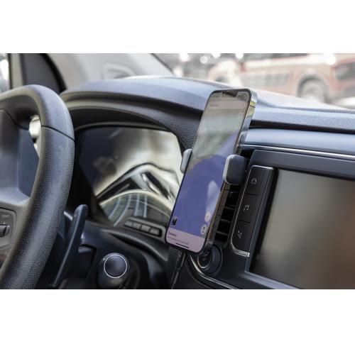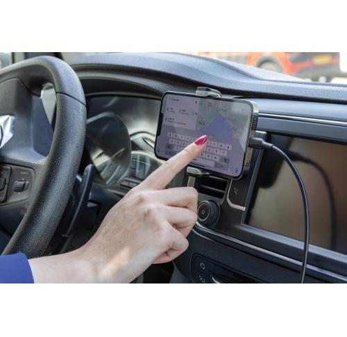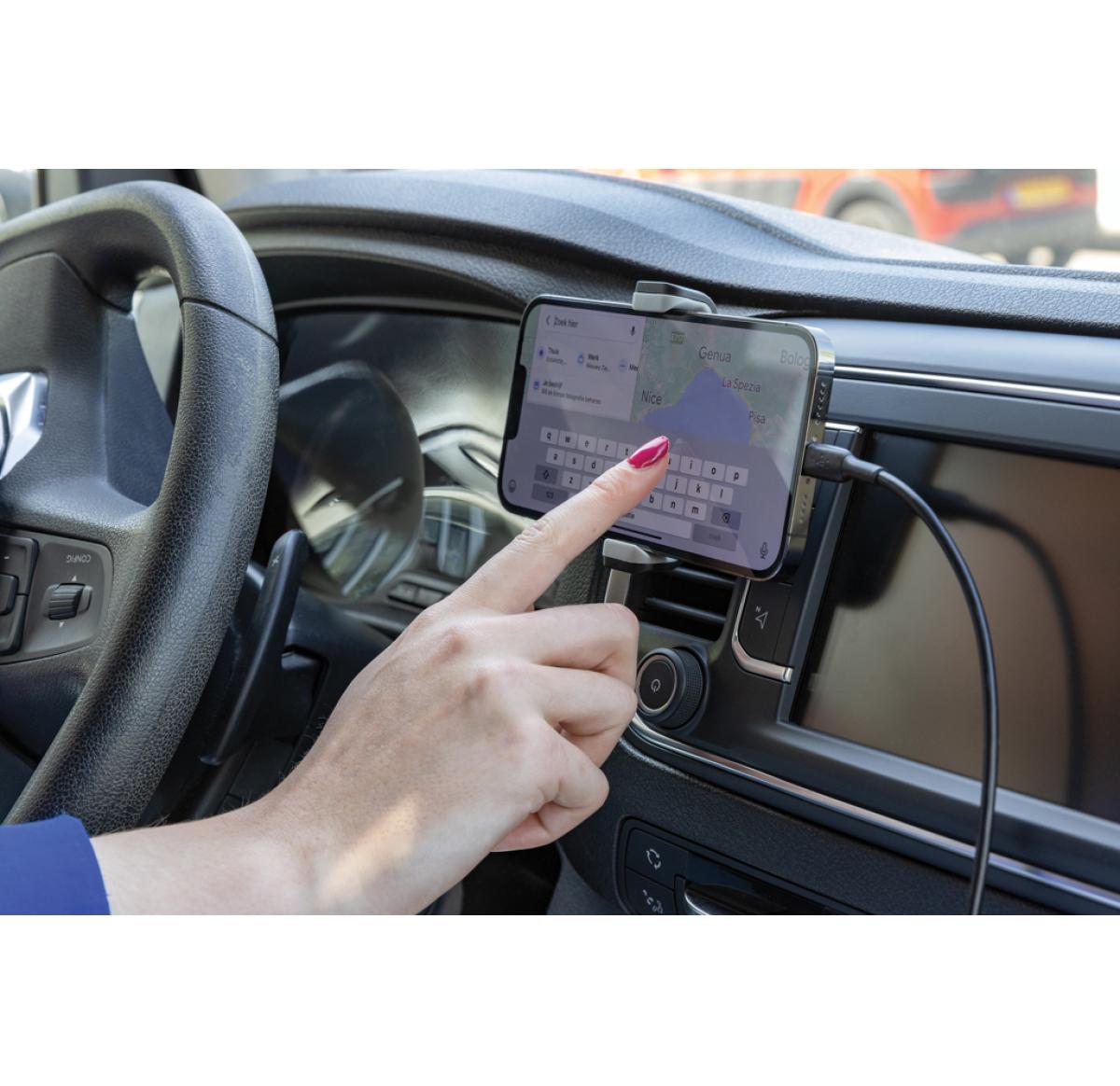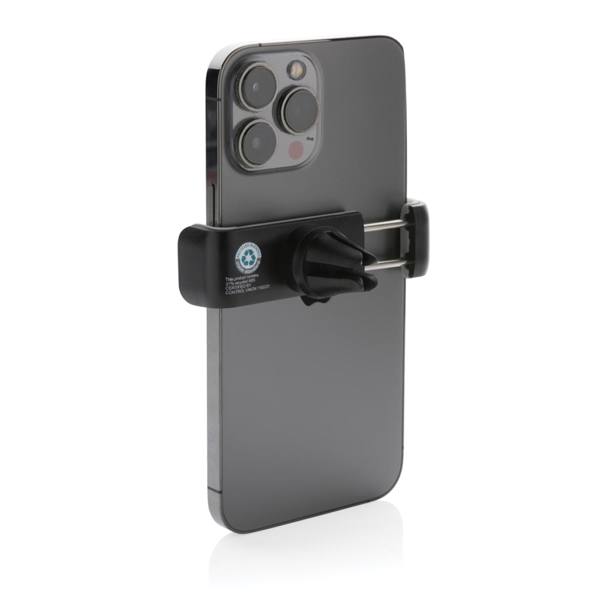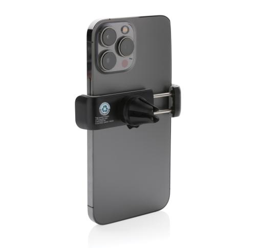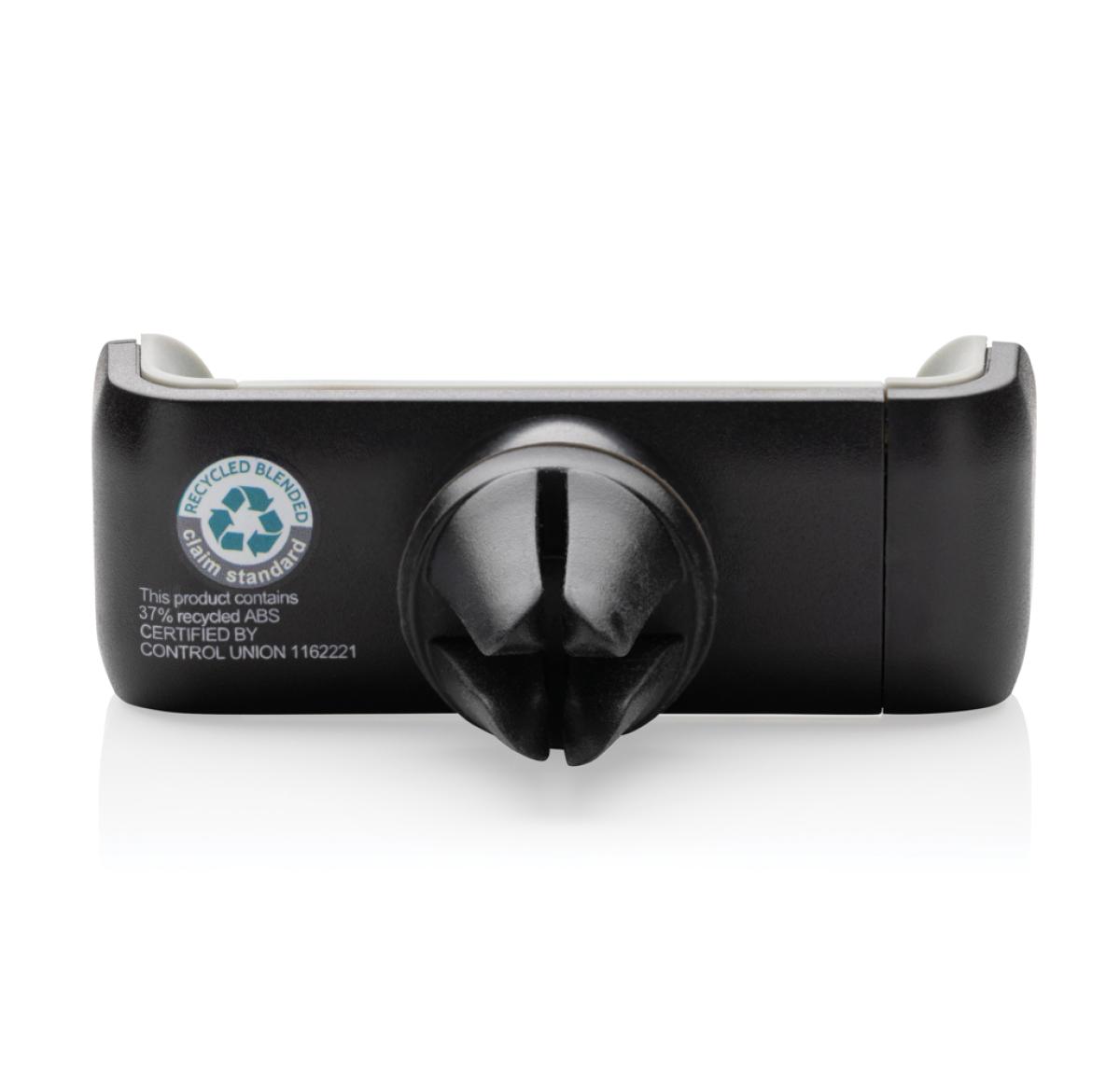 Universal and 360 degree rotatable car mount made with RCS (Recycled Claim Standard) certified recycled ABS. Total recycled content: 37% based on total item weight. RCS certification ensures a completely certified supply chain of the recycled materials. Simply click the item on your air vent and place your mobile phone (up to 6”) in the holder. Made out of heat resistant recycled ABS and strong silicone to make the item long lasting and prevent it from falling off your air vent while driving. With stainless steel mechanism inside to ensure your phone stays in place