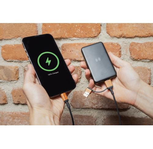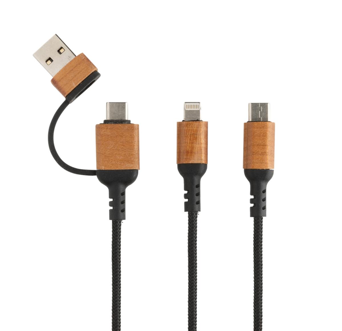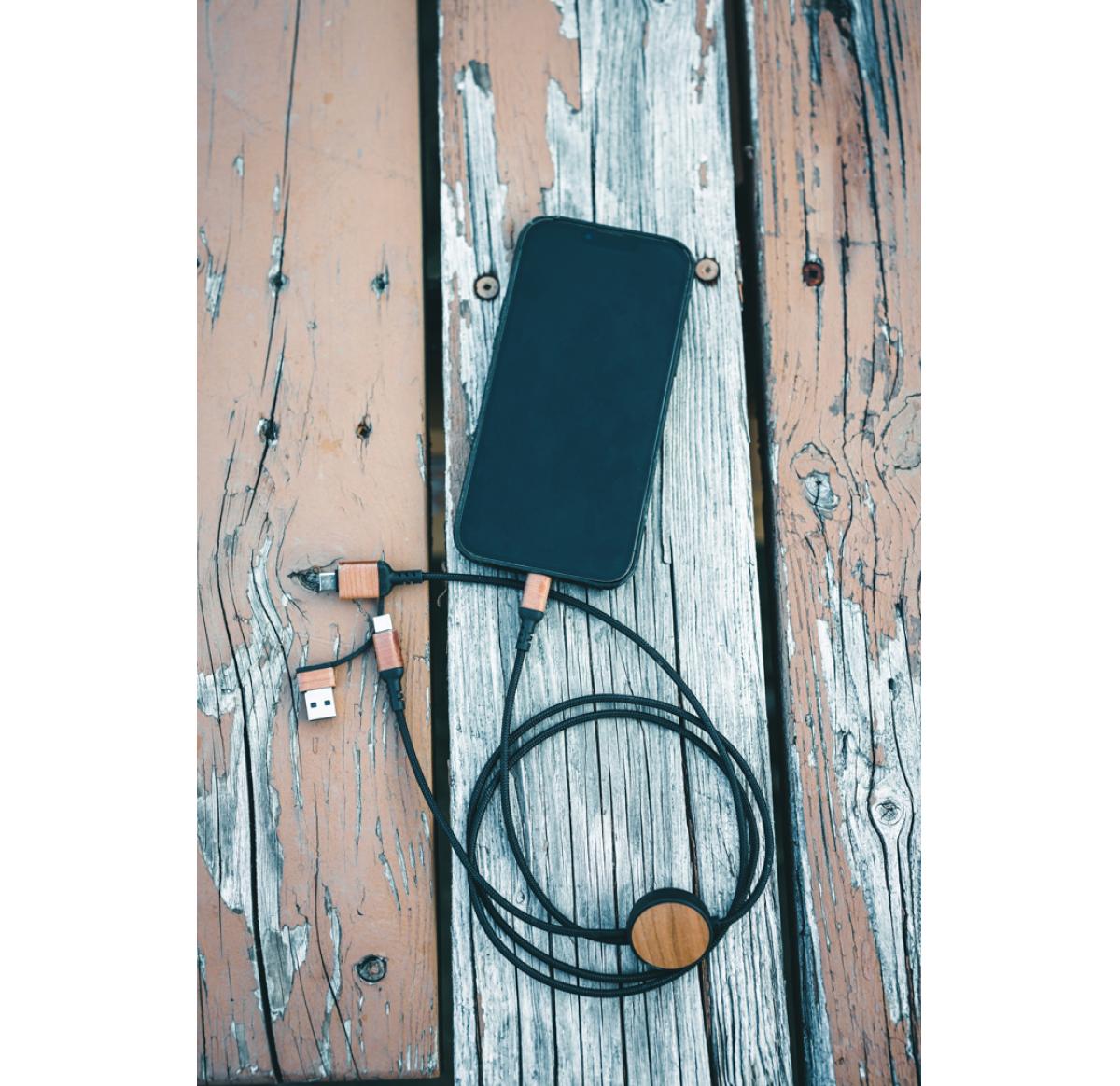 120 cm long luxury multi cable made with certified recycled materials. Comes with 4 different connectors: USB C in, USB A in, type C out, IOS out and micro USB out. This also allows you to use the cable with type C output devices that are included in the newer generation of phones and macbook computers. The cable also has a USB A output input option so it can charge any device from any output source. Casing and connectors made from FSC® Cherry wood and RCS certified recycled polyester cables (outer material) and RCS certified recycled TPE (inner material). Total recycled content: 46% based on total item weight. Max cable length: 120 cm. Packed in FSC®mixed kraft sleeve packaging. PVC free. Suitable for charge and sync. Max supported current 5V/2A.
