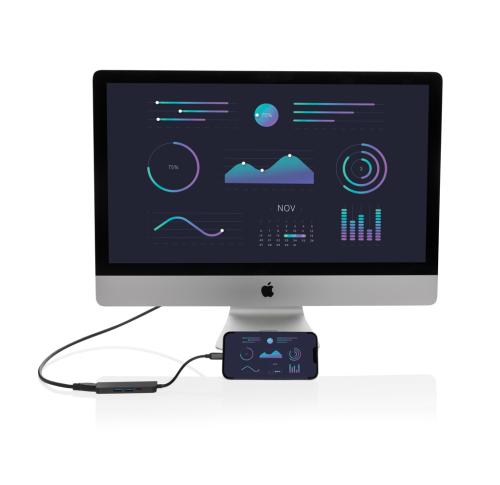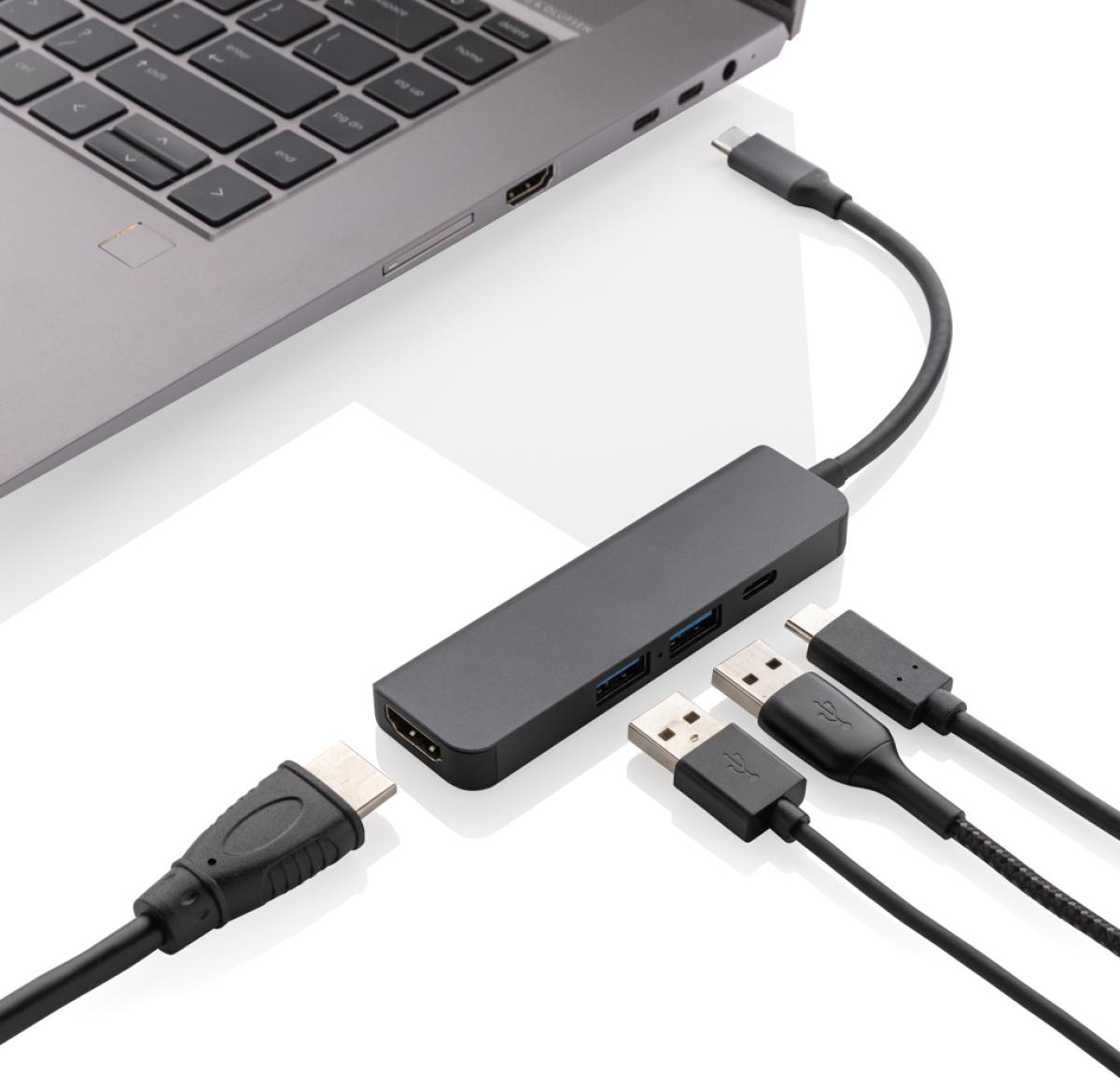Hub made with RCS (Recycled Claim Standard) certified recycled aluminum, ABS, TPE and PET. With 1 USB A 2.0, 1 USB A 3.0, 1 type C port and 4K HDMI port. The HUB has an integrated 10 cm type C cable made from recycled RCS certified TPE/PET material. Total recycled content: 58% based on total item weight. RCS certification ensures a completely certified supply chain of the recycled materials. With dual input connector so it is suitable for both type C and USB A computers. Aluminum does not lose its characteristics in the recycling process and can be recycled endlessly. Item and accessories 100% PVC free. Packed in FSC mix packaging. Supports data transfer.
