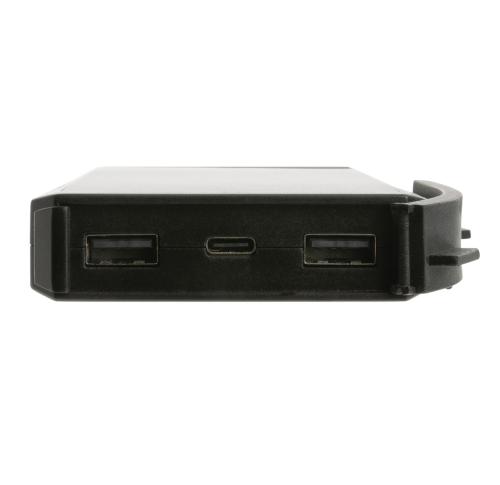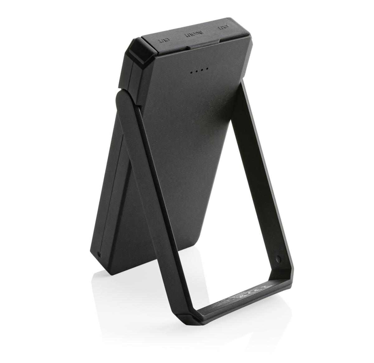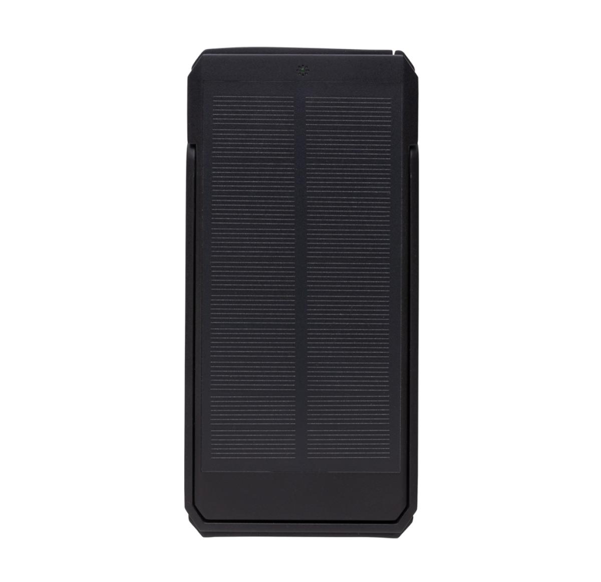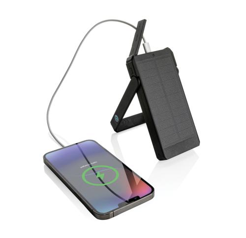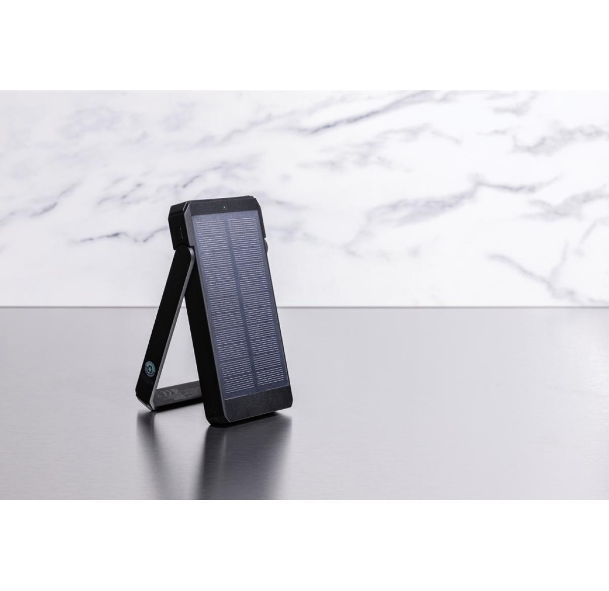 10.000 mAh solar powerbank made with RCS certified recycled ABS. Total recycled content: 18% based on total item weight. RCS certification ensures a completely certified supply chain of the recycled materials. The powerbank uses high quality monocrystalline solar panels with 19% conversion rate. Charge rate depends on conditions. With integrated stand function to use the solar panels at an optimal angle. The powerbank contains a long lasting grade A 10.000 mAh lithium battery. Charging speed solar: 5V/200mA. Input type C: 5V/2A. Output: USB A: 5V/2A Type C: 5V/2A. Item and accessories PVC free. Including RCS certified recycled TPE charging cable. Packed in FSC® mix packaging. Registered design®