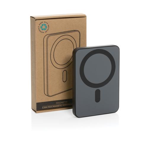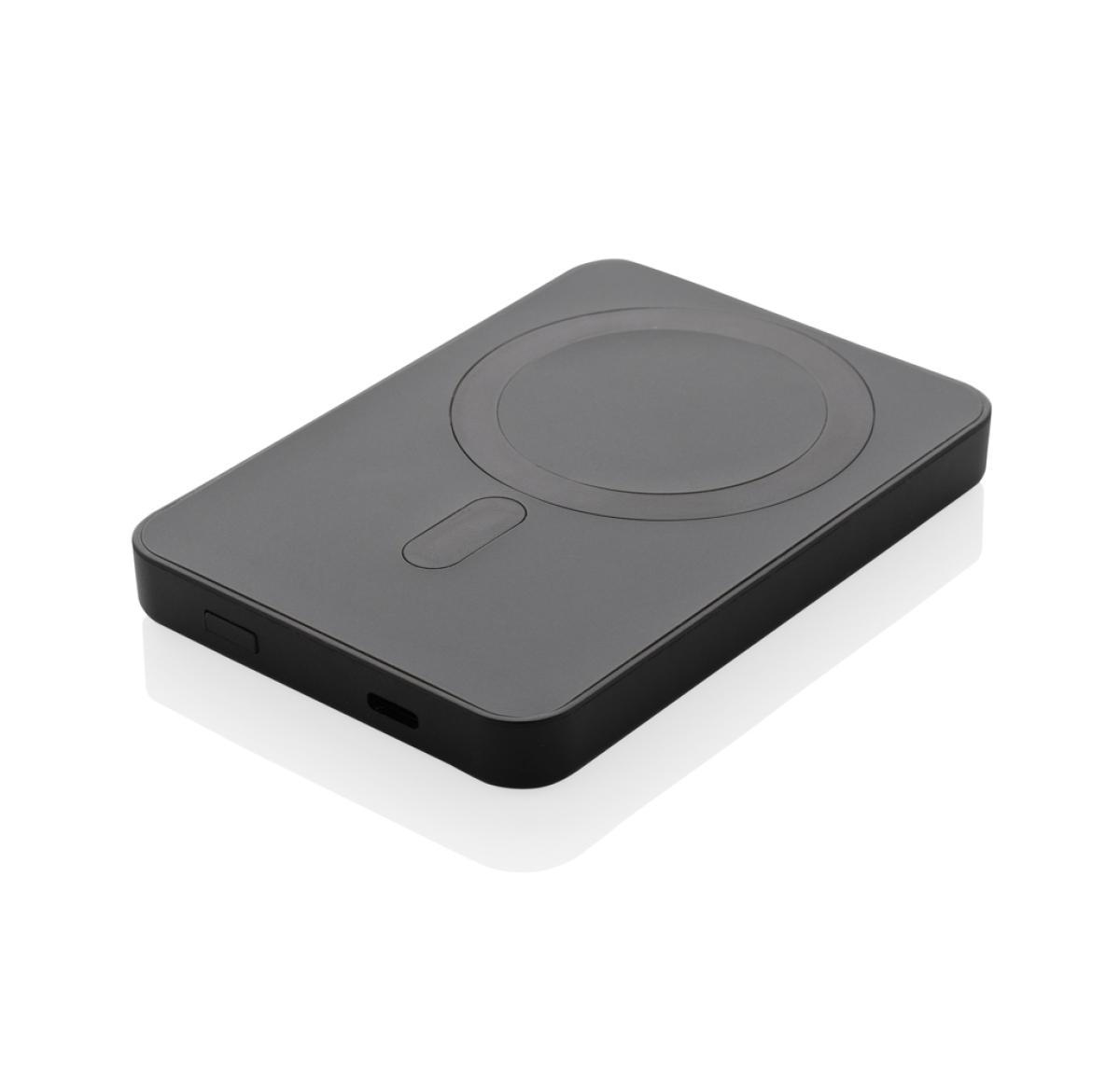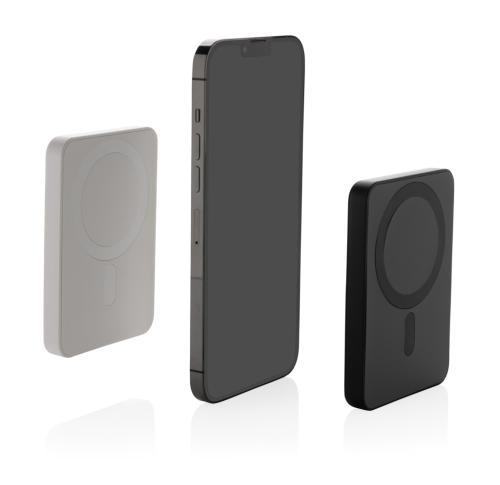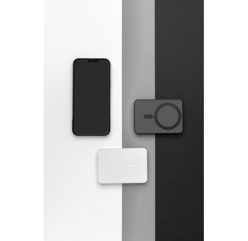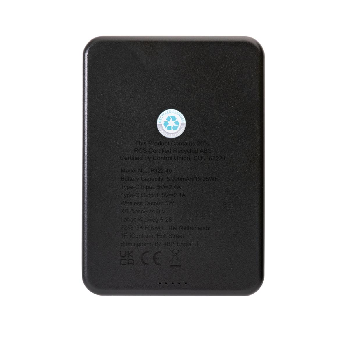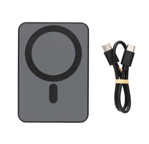 5.000 mAh pocket size powerbank with 5W magnetic wireless charger with a case made out of RCS certified recycled ABS plastic. RCS (Recycled Claim Standard) is a standard to verify the recycled content of a product throughout the whole supply chain. Total recycled content: 20 % based on total item weight.The powerbank contains a long lasting grade A 5.000 mAh lithium polymer battery. The power indicators will indicate the remaining energy level so you always know when to re-charge.; Type-C Input 5V/2.4A; Type C output:5V/2A.4A Item and accessories PVC free. Including RCS certified recycled TPE charging cable. Packed in FSC® mix packaging.