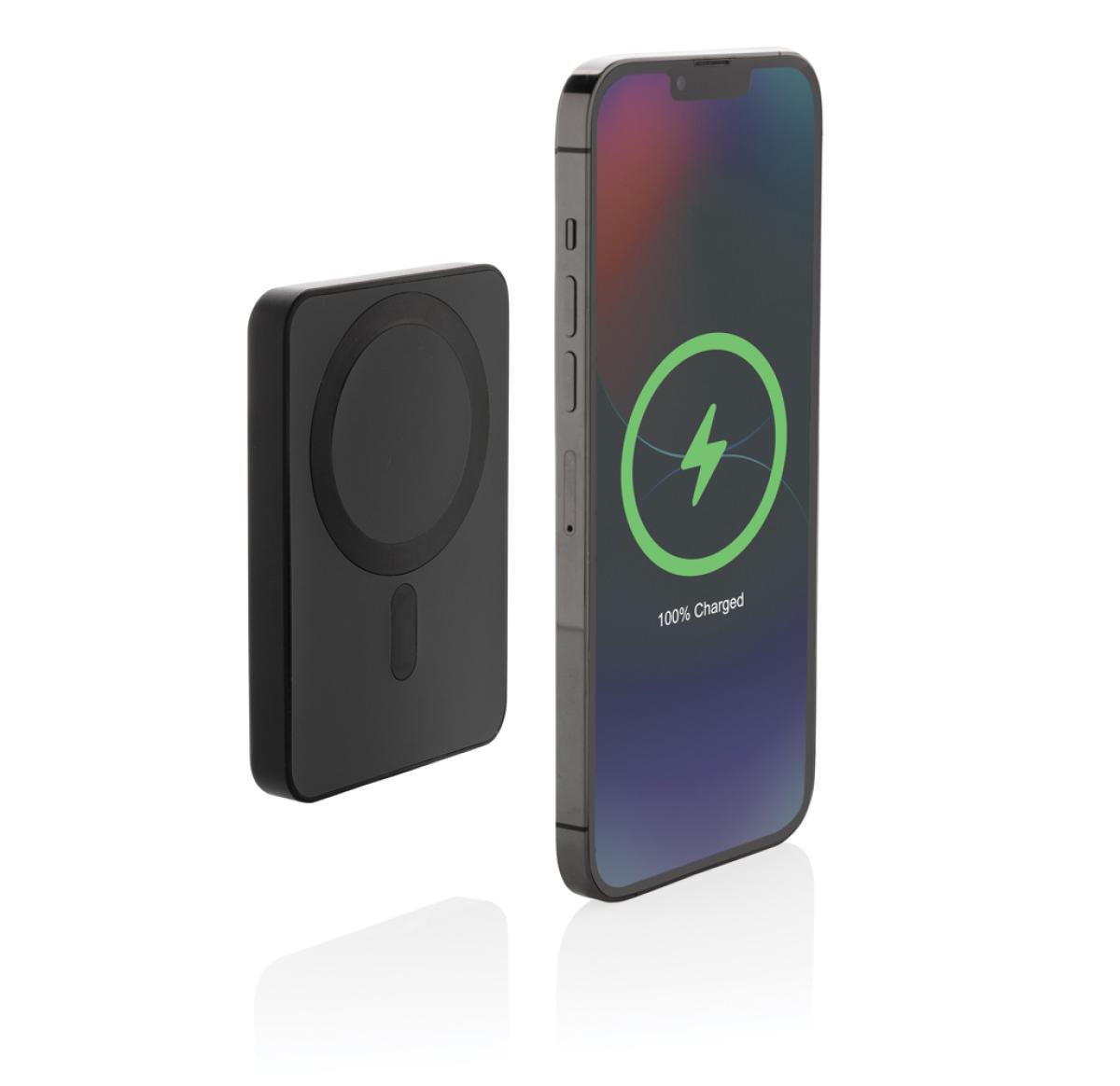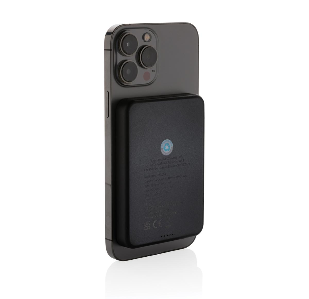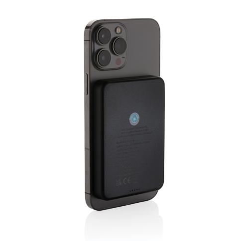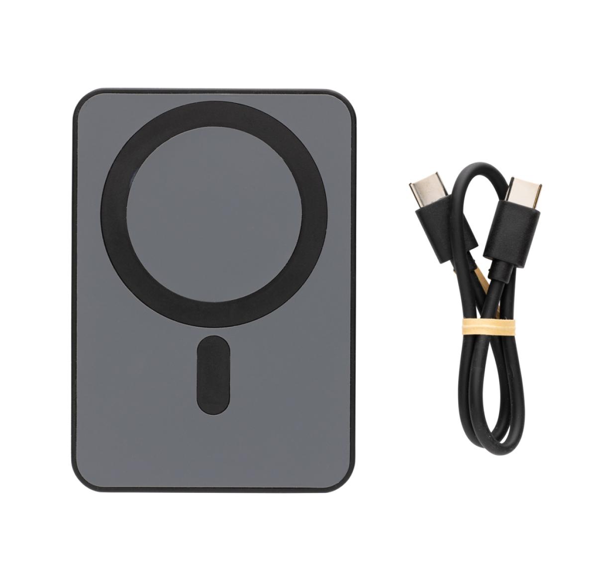 5.000 mAh pocket size powerbank with 5W magnetic wireless charger with a case made out of RCS certified recycled ABS plastic. RCS (Recycled Claim Standard) is a standard to verify the recycled content of a product throughout the whole supply chain. Total recycled content: 20 % based on total item weight.The powerbank contains a long lasting grade A 5.000 mAh lithium polymer battery. The power indicators will indicate the remaining energy level so you always know when to re-charge.; Type-C Input 5V/2.4A; Type C output:5V/2A.4A Item and accessories PVC free. Including RCS certified recycled TPE charging cable. Packed in FSC® mix packaging.