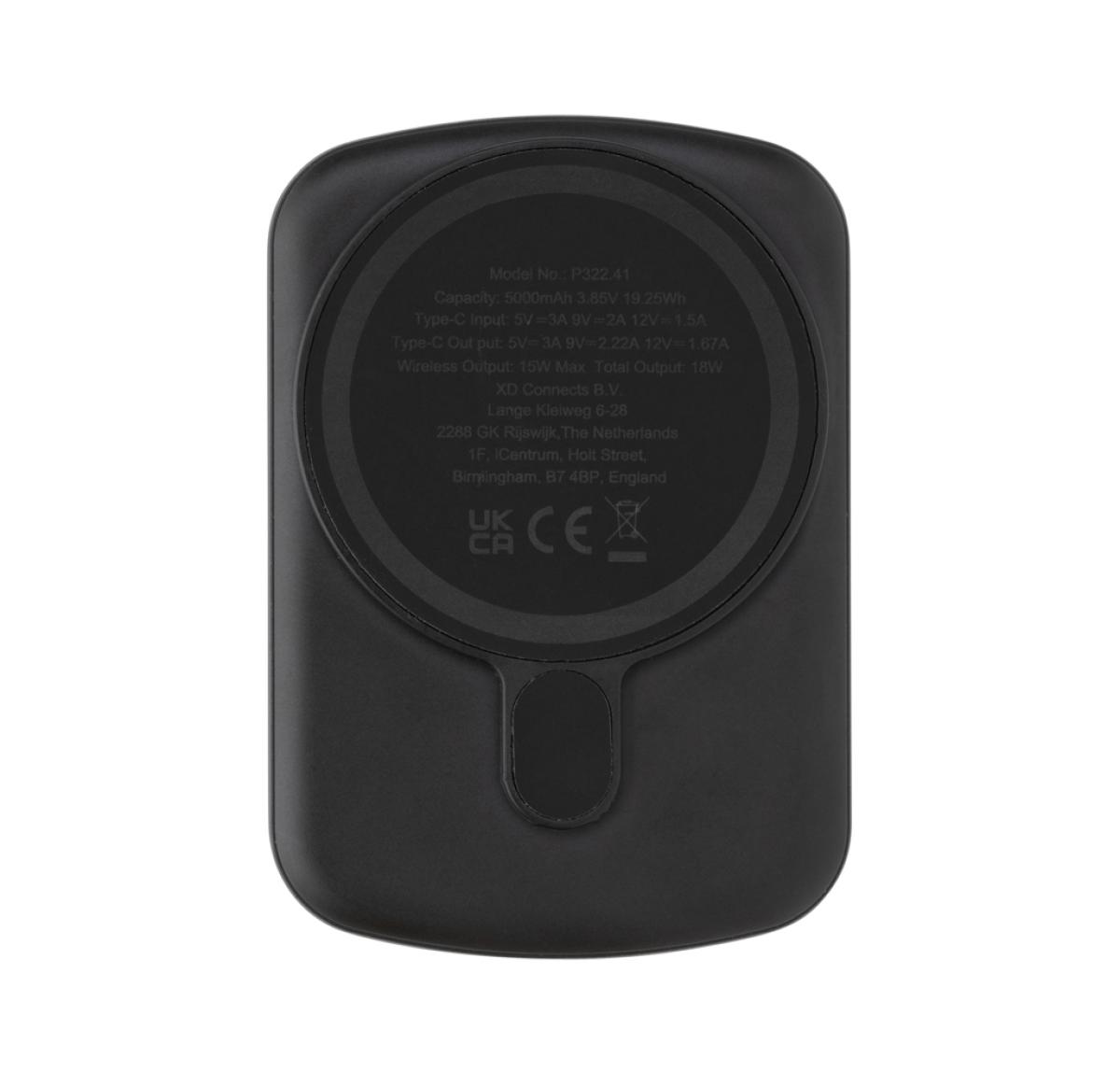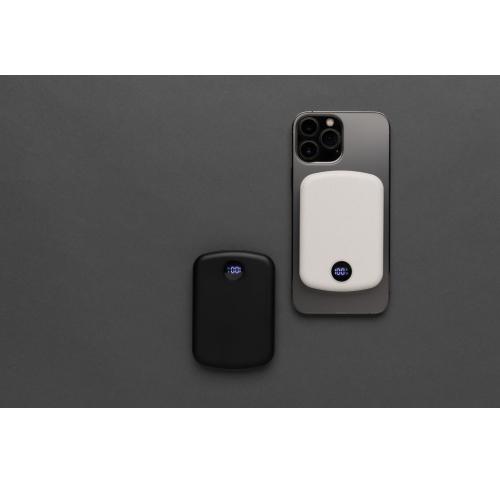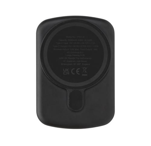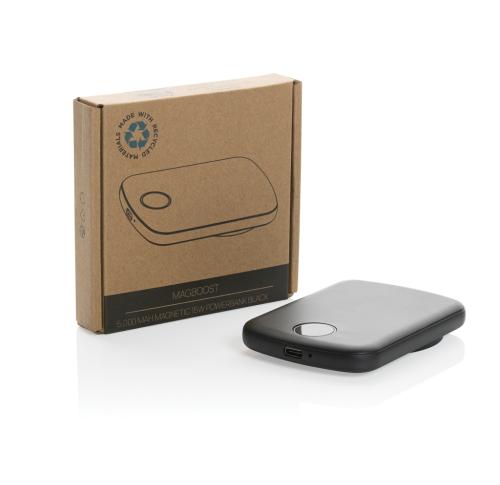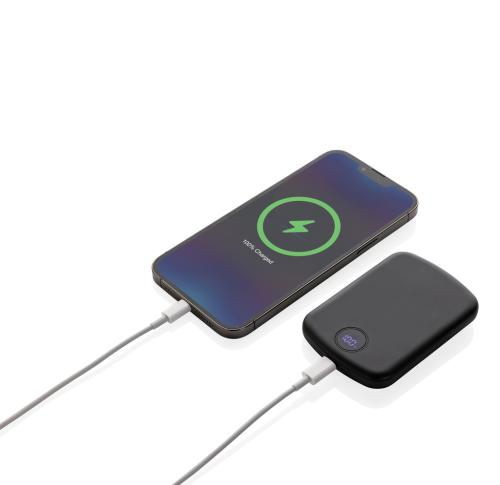 5000 mAh pocket size powerbank with 15W magnetic wireless charger with a case made out of RCS certified recycled ABS plastic. RCS (Recycled Claim Standard) is a standard to verify the recycled content of a product throughout the whole supply chain. Total recycled content: 21 % based on total item weight.The powerbank contains a long lasting grade A 5.000 mAh lithium polymer battery. The integrated digital LED screen will indicate the remaining energy level so you always know when to re-charge.; Type-C Input 5V/2.4A; Type C output:5V/2A.4A Item and accessories PVC free. Including RCS certified recycled TPE charging cable. Packed in FSC® mix packaging. Type-C Input: 5V/3A 9V/2A 12V/1.5A; Output: USB-C output: 5V/2.4A?9V/2.22A?12V/1.67A; Wireless output: 15W